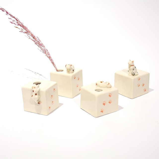 側面に足あとが描かれ、大切なお花を可愛い猫が守ってくれているような立方体の花入れです。 【略歴】 石川県立九谷焼技術研修所本科・研究科卒 父 直樹に師事 陶磁彫刻の技法を学びながら、「誰かのお気に入りになれるもの」を目指して制作しています。 【サイズ】 約 5~5.5cm x 5.5cm x 高さ5~5.5cm (猫モチーフ分除く) 猫モチーフ含む高さ 約 6~9cm 花入れ口 約 径 1.5~1.8cm 【素材】 九谷磁土 【技法】 型起こし・色絵 等 【外箱】 化粧箱(*ギフト包装は下記リンクをご参照の上、オプションよりお選びください。) https://ginkana.theshop.jp/items/26841449 【お買い上げの前に必ずお読みください】 ※ブラウザ環境や撮影時の光の加減により色合いや濃淡が実物と違って見える場合があることを予めご了承下さい。また、色味、サイズには多少個体差がございます。 【領収書について】 BASEでは請求書や領収書の発行を行っておりません。領収書の発行をご希望のお客様は備考欄にてお知らせください。作品に同梱させていただきます。
