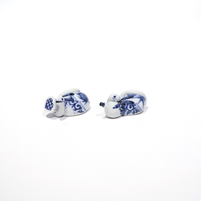 小さなうさぎは月と松竹梅、大きなうさぎは宝尽くしと縁起の良い柄です。 お正月だけでなく、お祝い事にも使っていただけます。 ご自身の干支で揃えてみては。 ※個体差がありますが、お選びいただけませんのでご了承くださいませ 【略歴】 2016年 石川県立九谷焼技術研修所 本科 卒業 2017年 石川県立九谷焼技術研修所 研究科 卒業 山本長左氏に師事 【サイズ】 約 縦2.8cm × 横5.4cm × 高3cm (大きい個体のサイズ) 【素材】 九谷磁土 【技法】 型起し・染付 ※食洗器・電子レンジ不可 【外箱】 紙箱 (*ギフト包装は下記リンクをご参照の上、オプションよりお選びください。) https://ginkana.theshop.jp/items/26841449 【お買い上げの前に必ずお読みください】 ひとつひとつ手作りのお品物になります。そのため同じ形、色、模様の作品を作ることはできません。出会いのものとしてお楽しみください。 ※ブラウザ環境や撮影時の光の加減により色合いや濃淡が実物と違って見える場合があることを予めご了承下さい。また、色味、サイズには多少個体差がございます。 【領収書について】 BASEでは請求書や領収書の発行を行っておりません。領収書の発行をご希望のお客様は備考欄にてお知らせください。作品に同梱させていただきます。