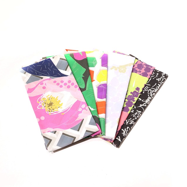 このハンカチは模様の輪郭線が白くなる友禅染の特徴をデザインに反映させた友禅柄プリントテキスタイル。金沢ならではの図柄デザインとポップな色遣いが目を引きます。大判サイズなのでお食事の時の膝上のナプキンとしても重宝します。