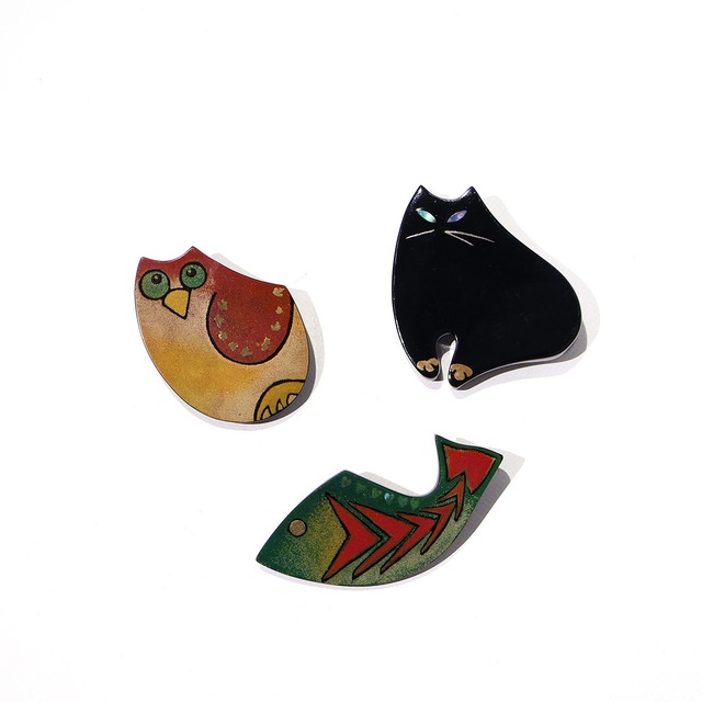 小網重一 ブローチ 猫(黒) / ふくろう / 魚