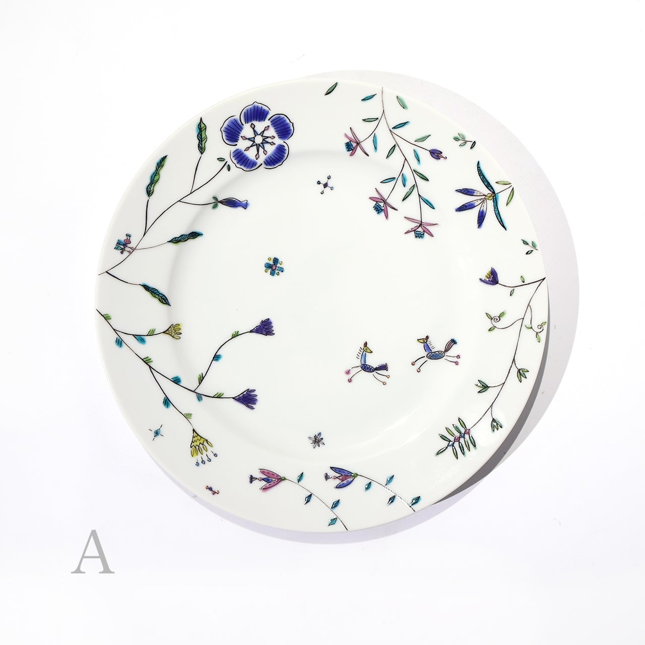 色鮮やかな草花にウマや魚などの生き物たちが絵付けされたプレート皿です。軽いモーニングプレートを作ったり、ケーキなどのデザートを盛り付けたり、色々お楽みいただけます。