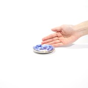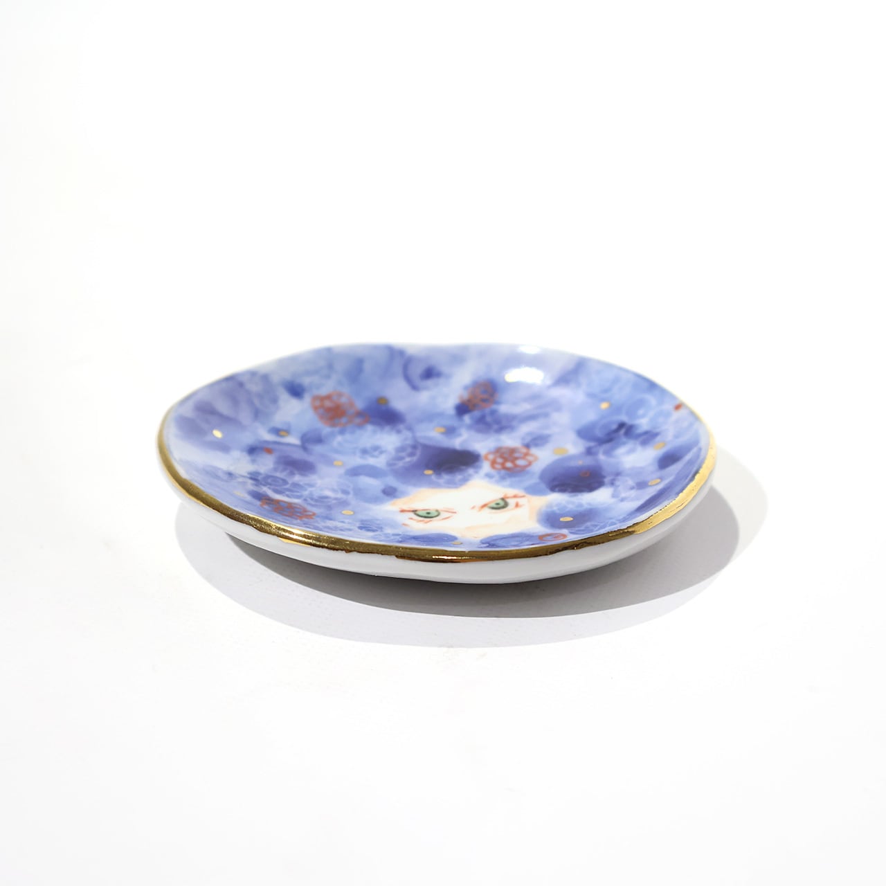器の中からあなたに視線を投げかけるもじゃ子。優しいブルーの濃淡に花々が舞う幻想的な豆皿です。