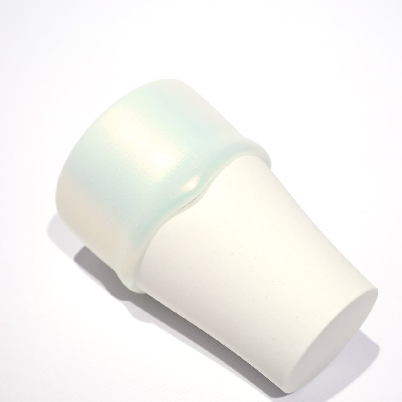 カップから溢れ出しているかのように見える特徴的なデザインの酒器に、ややすぼまったふちの自由な形状が愉しい盃。真珠のような輝きを放つ美しい表情をお楽しみください。