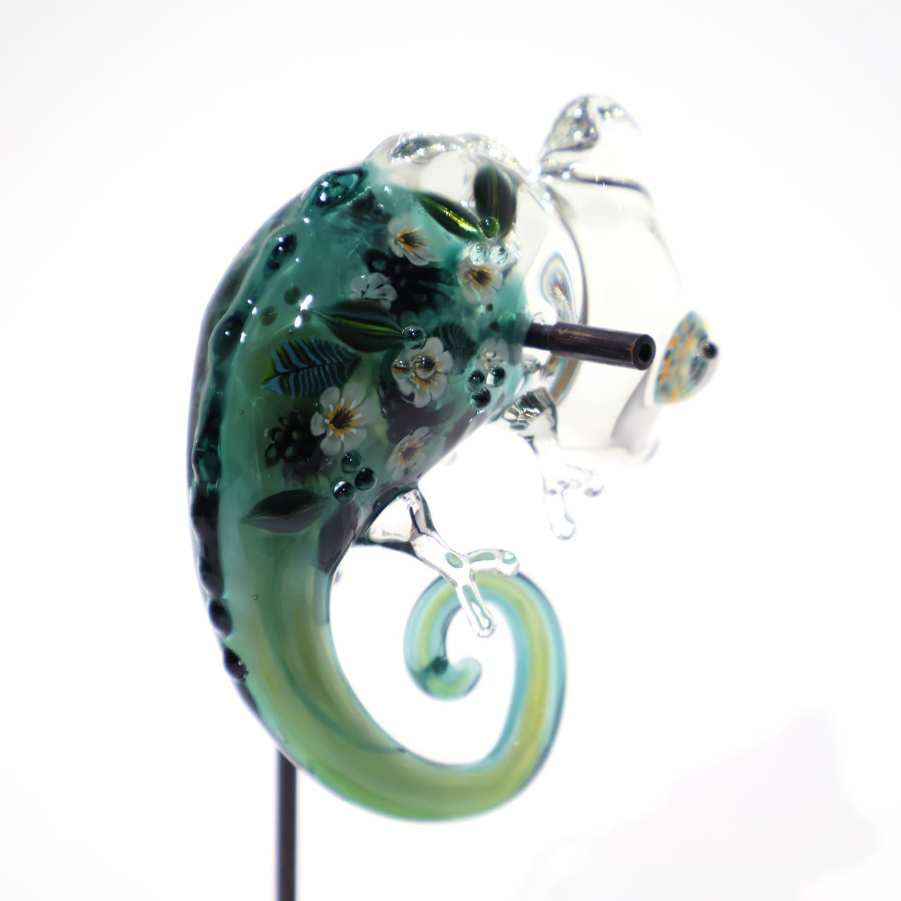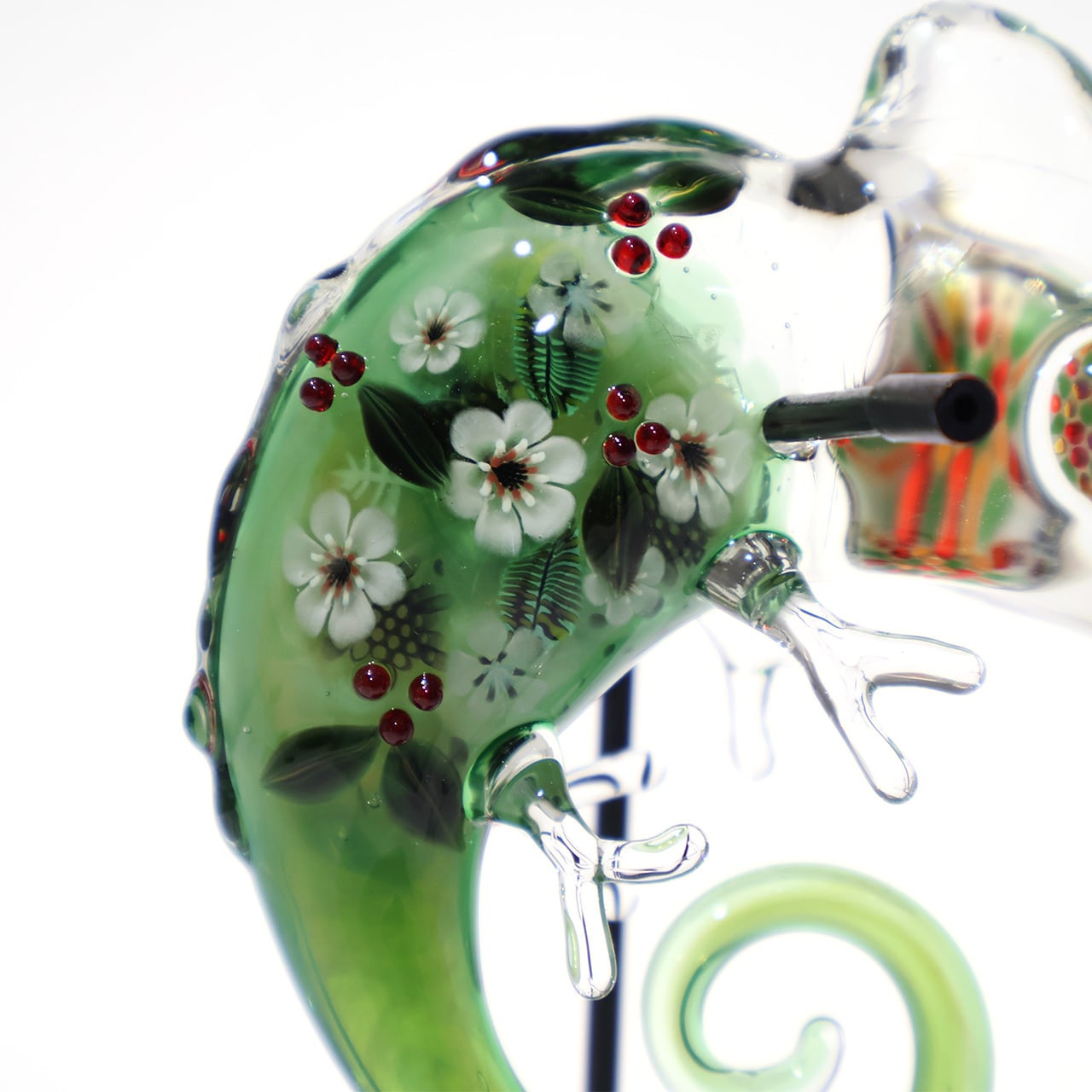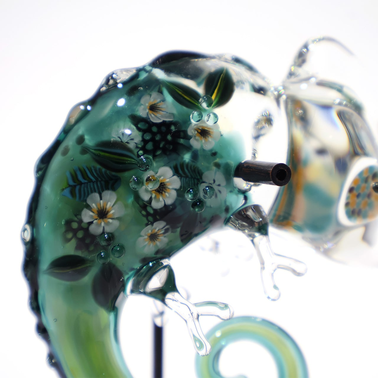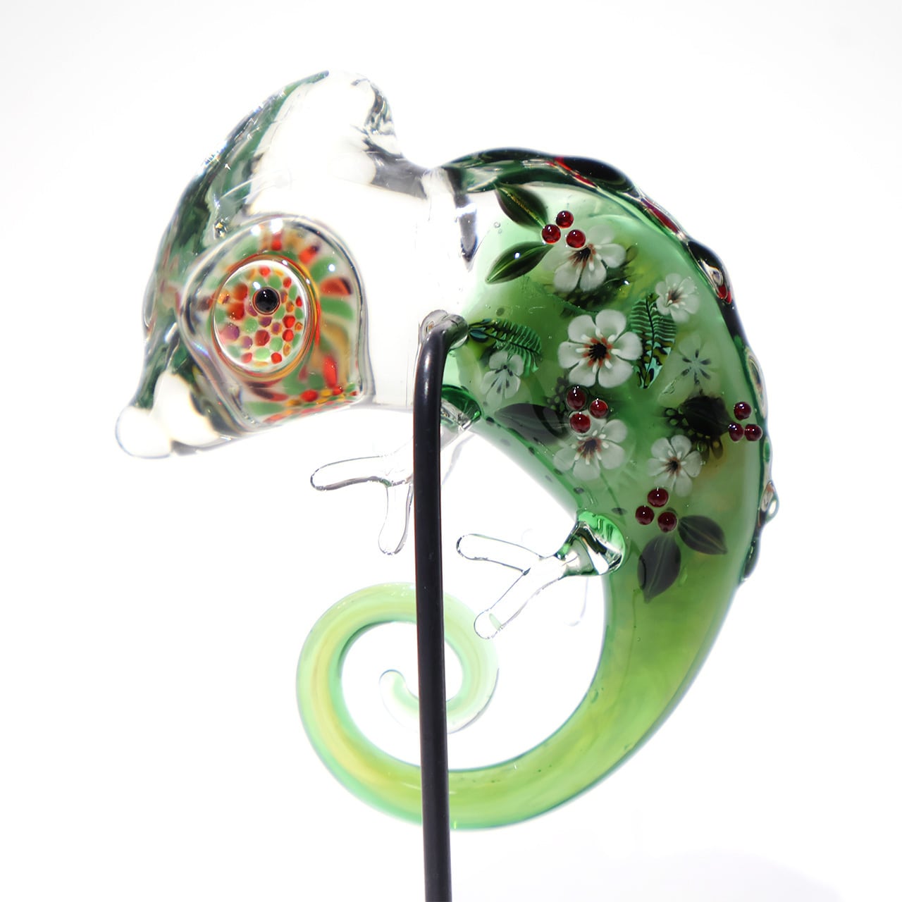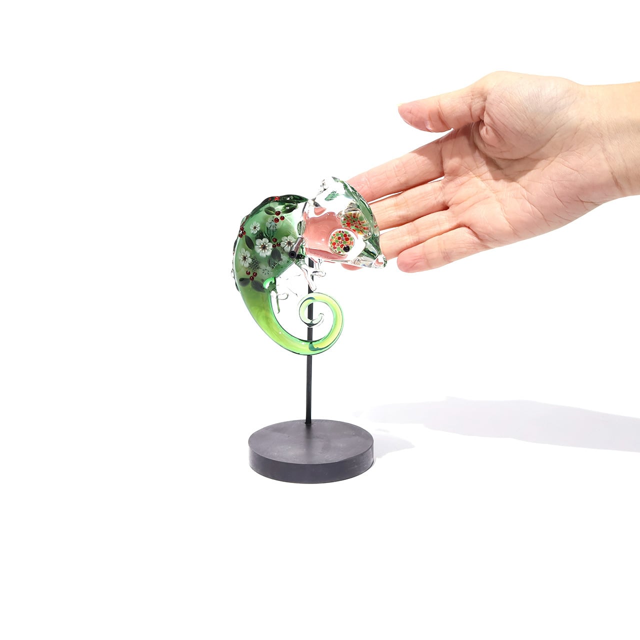 鮮やかな色彩の目が印象的なおとぼけ表情のカメレオン。ぷっくりフォルムには小花や植物がいっぱい散りばめられ、幻想的な雰囲気です。いつでも一緒にいたくなる愛らしい姿をどの角度からも存分にお楽しみください。