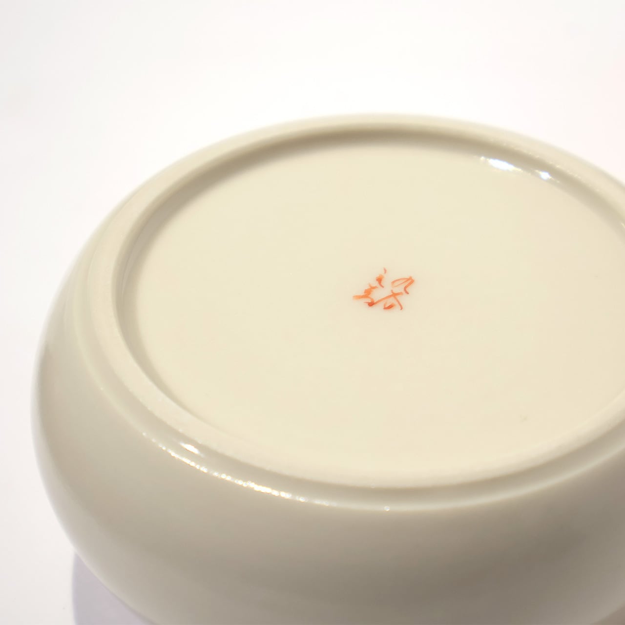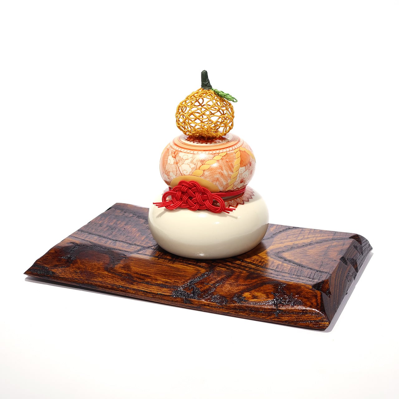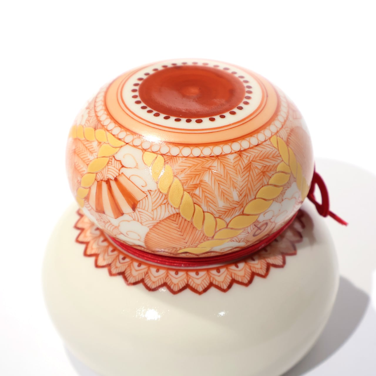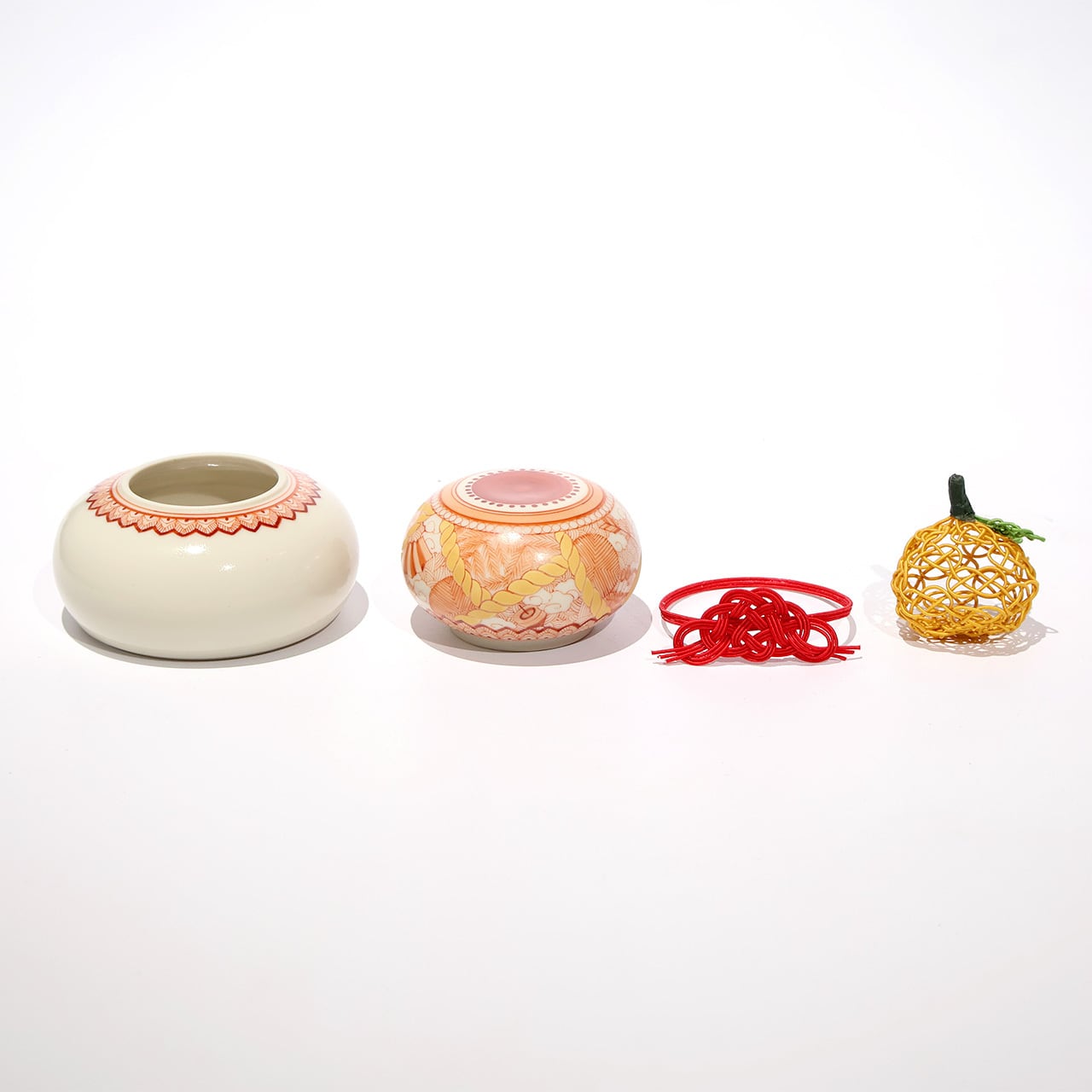 金沢の鏡餅は上段が紅色、下段が白色という習わしがありますが、この陶器のお鏡飾りは上段が赤絵細描技法でしめ縄や独楽などお正月にちなんだ文様が描かれています。新春を寿ぐにふさわしい華やかな作品です。