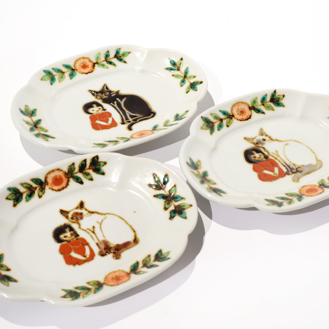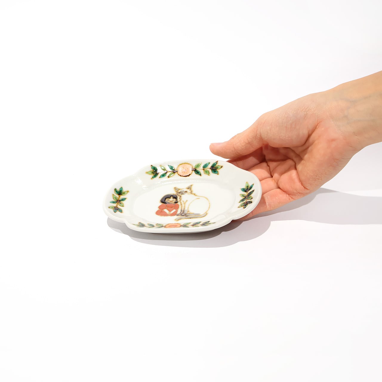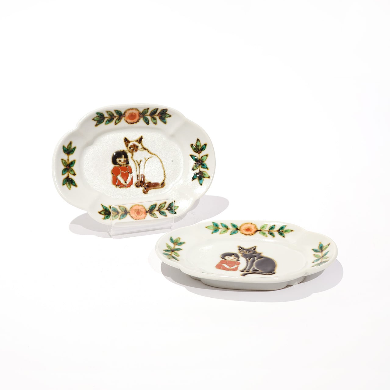 女の子が小さい?猫が大きい?仲良く寄り添っている姿がなんとも愛らしいお皿です。