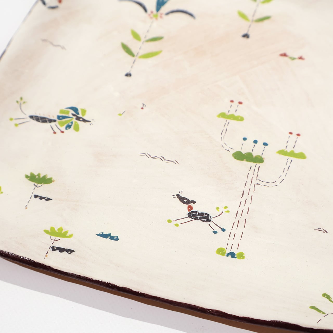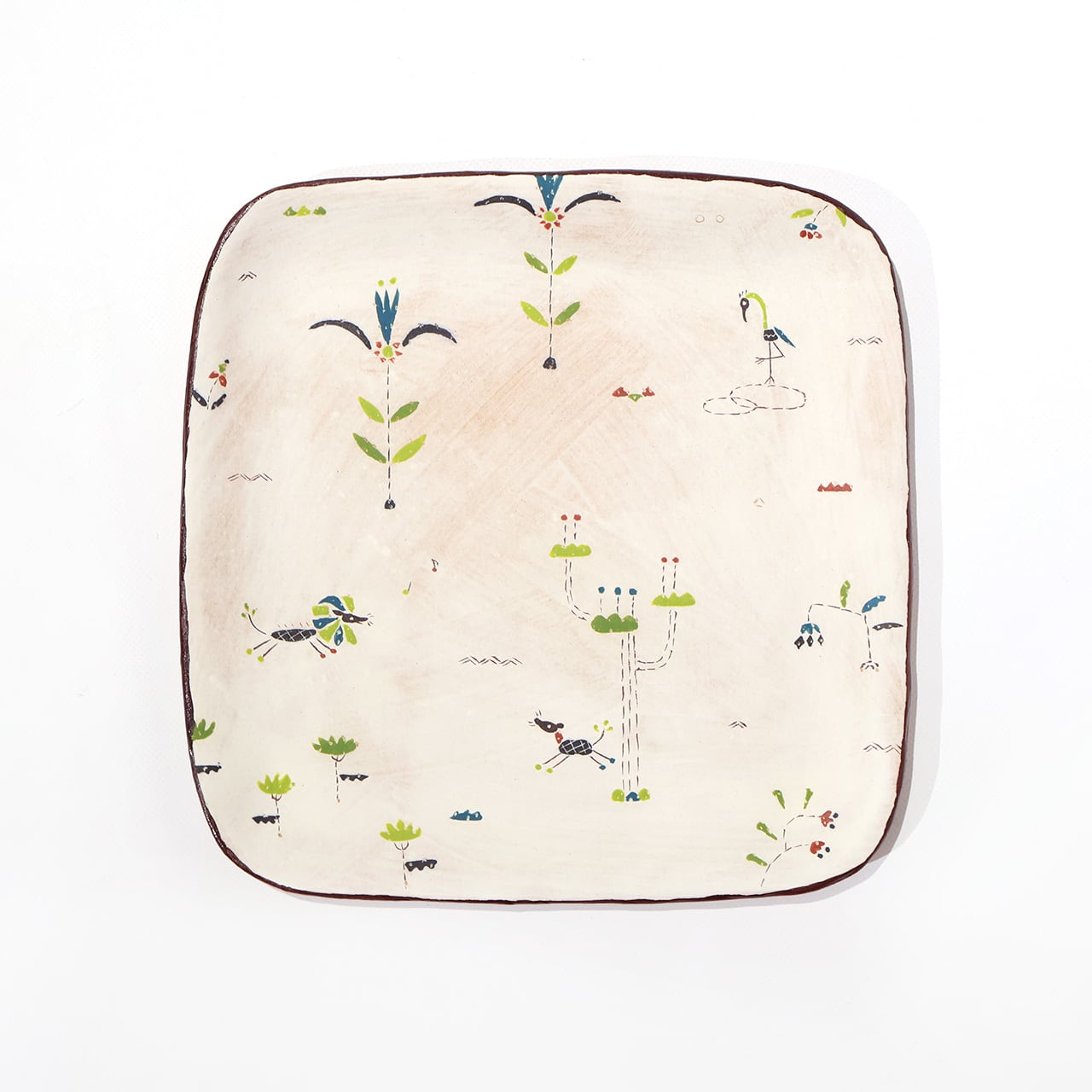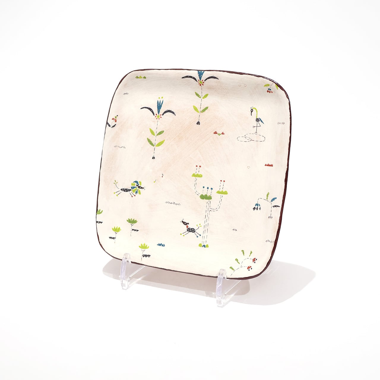 青や緑の落ち着いた色調でサボテンや動物たちが描かれたプレートです。