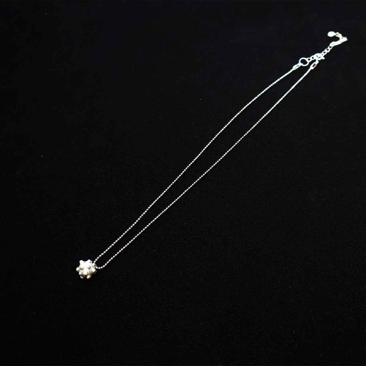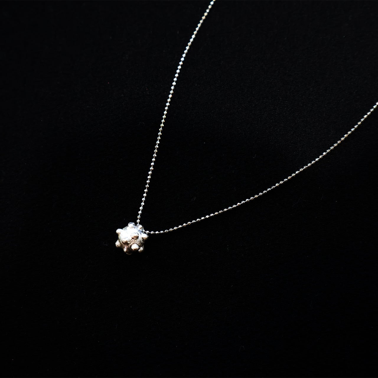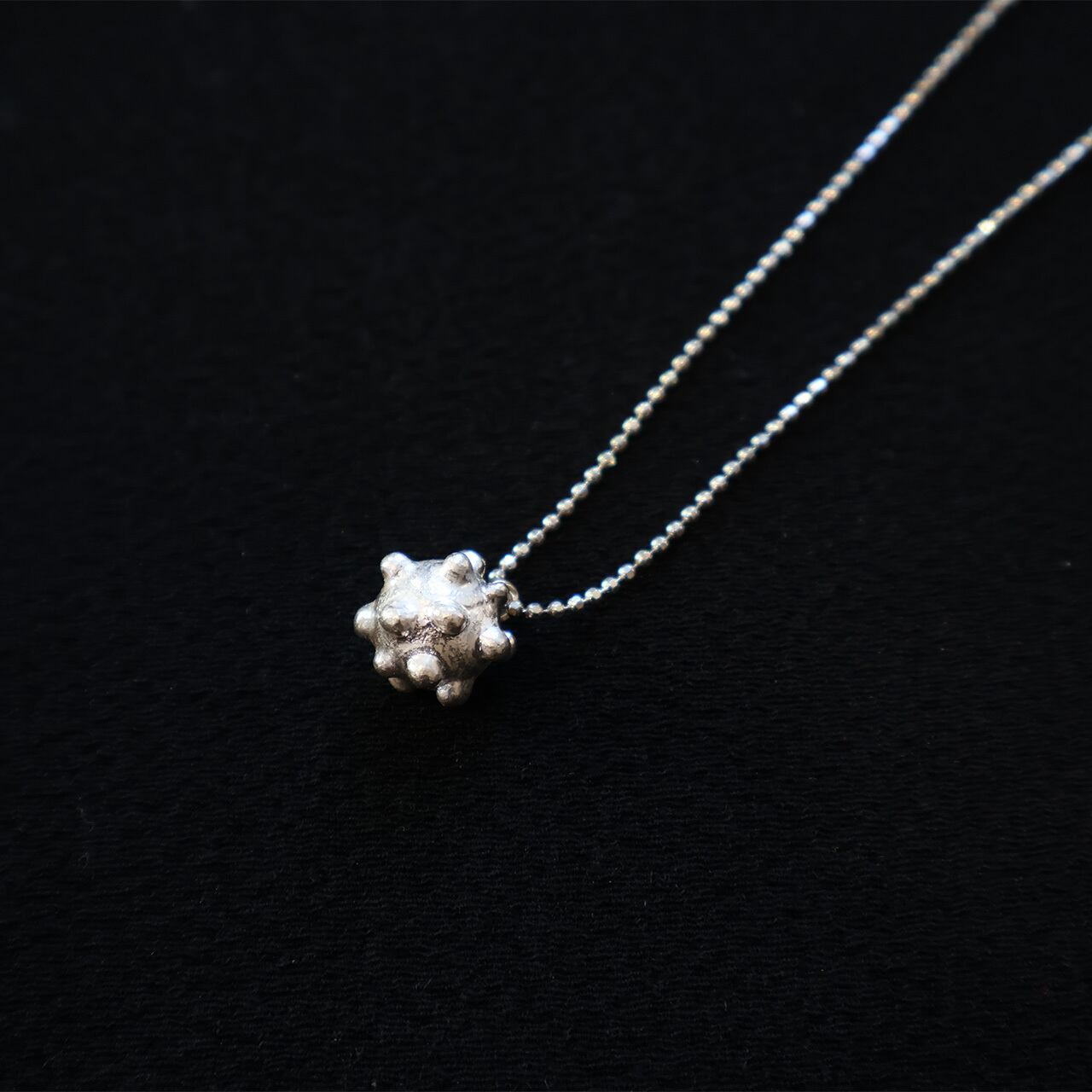 純銀の溶けた柔らかく自然な表情がまるで砂糖菓子のコンペイトウのような愛らしいしいネックレス。本当にお菓子を作るようにひとつぶひとつぶ溶かしたり磨いたりの細かな手作業で作られています。チェーン部分のガラスビーズやTピンも手作りされており、作家の愛情とこだわりが感じらる作品です。