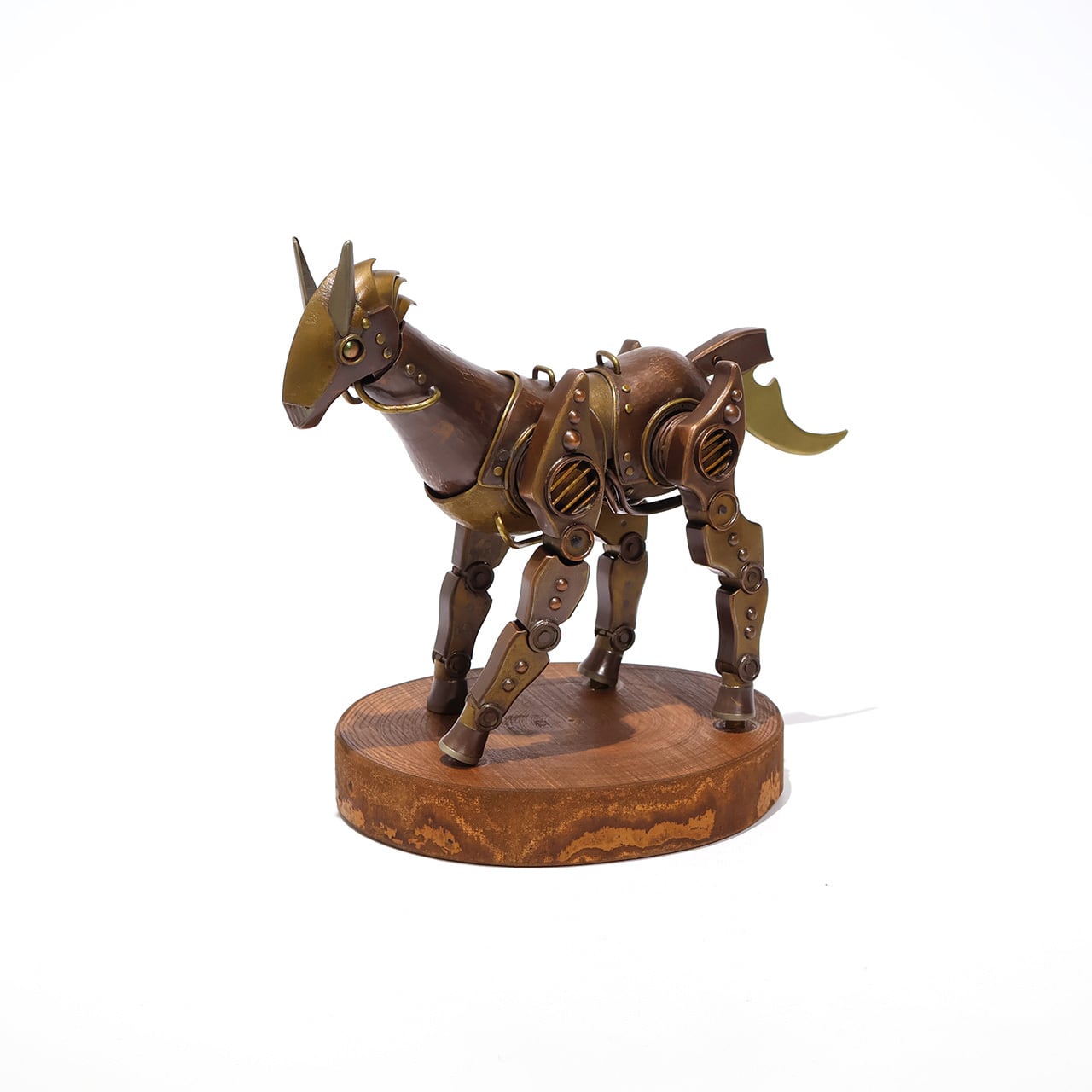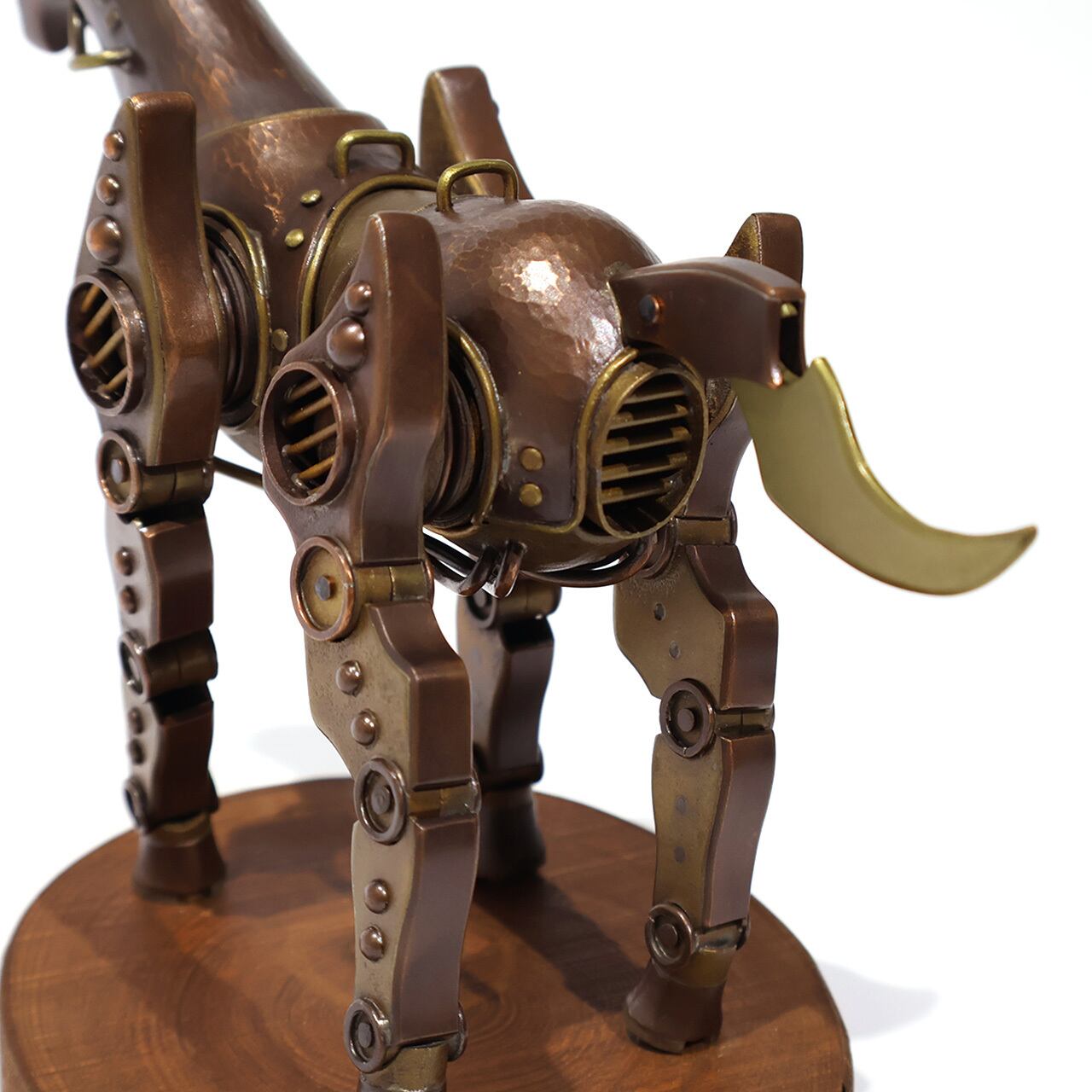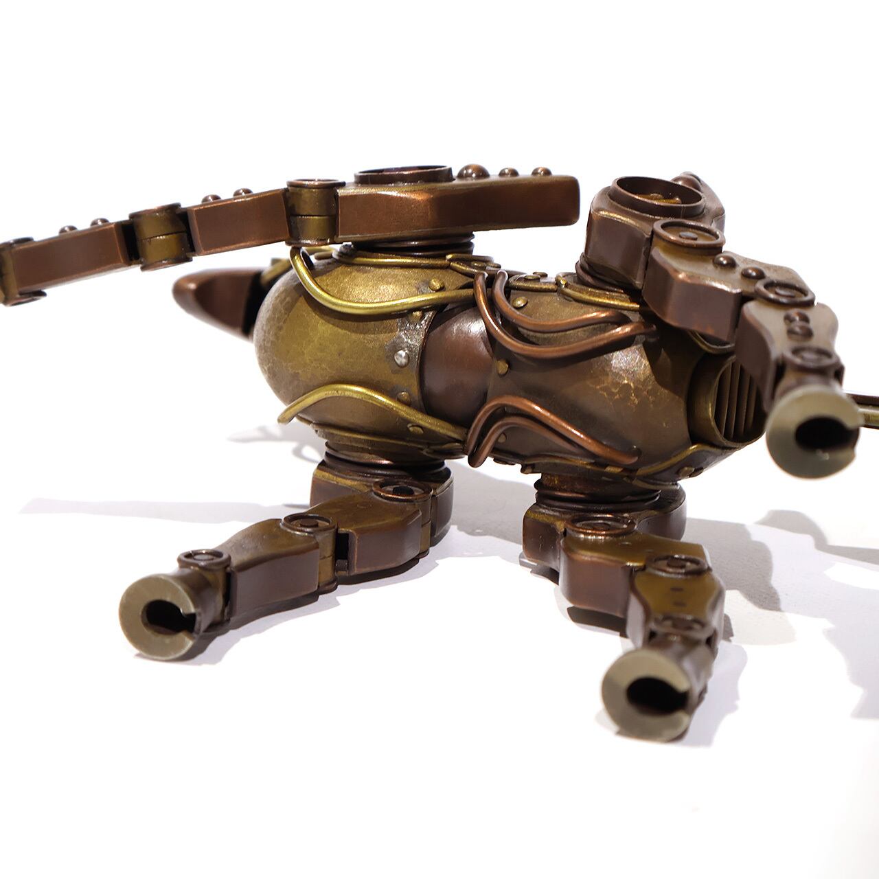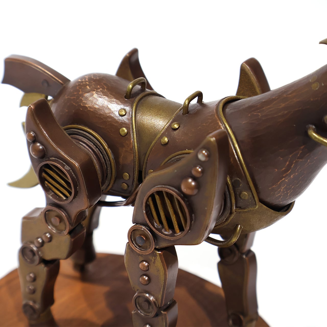 鍛金、彫金の技法を用い、銅や真鍮といった金属を金槌で叩いて加工し、身体から関節のパーツまで1つ1つを手作りで制作されています。
