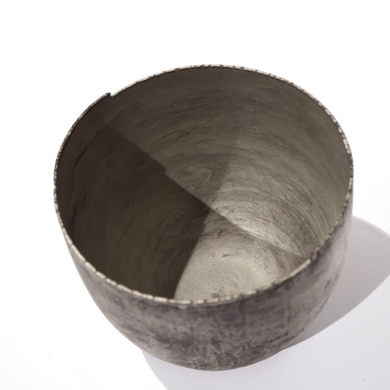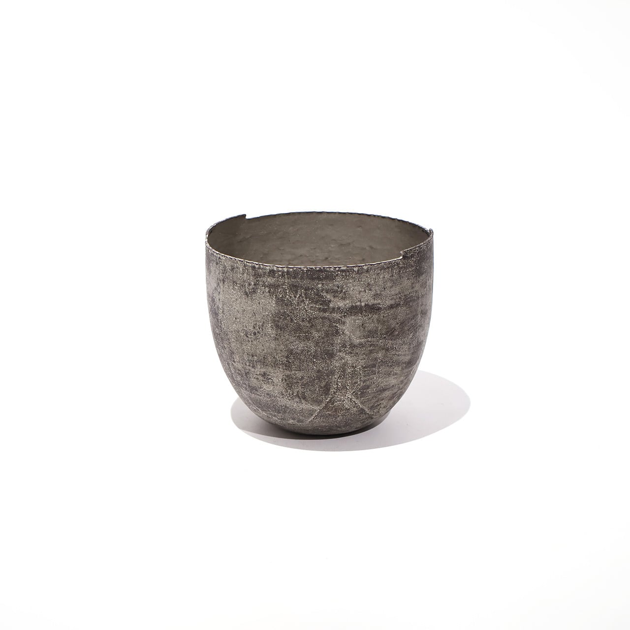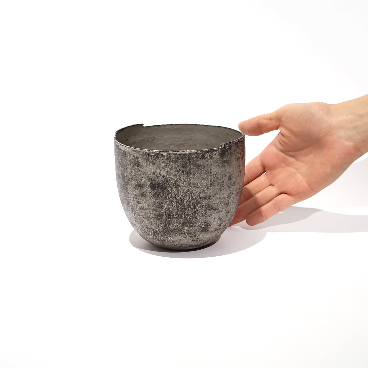 金工技法のひとつ金属を叩いて制作する鍛金の技法とジュエリー会社で習得した彫金の技術を用いて出来上がる作品は、金属という硬質なイメージとは裏腹にやわらかでしなやかな印象をもたらします。銅と錫によって生み出される表情は独特でありながら、自然に似た静けさを感じさせます。茶室の空間を一層引き立てながらも調和する建水です。
