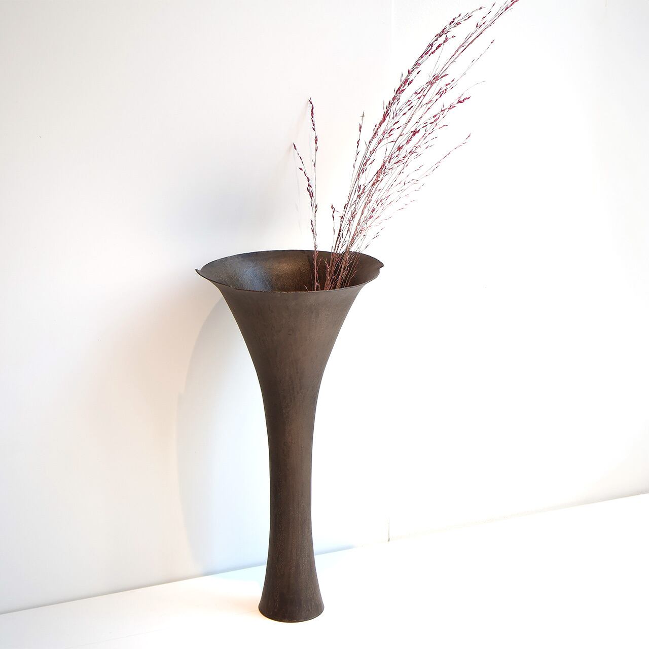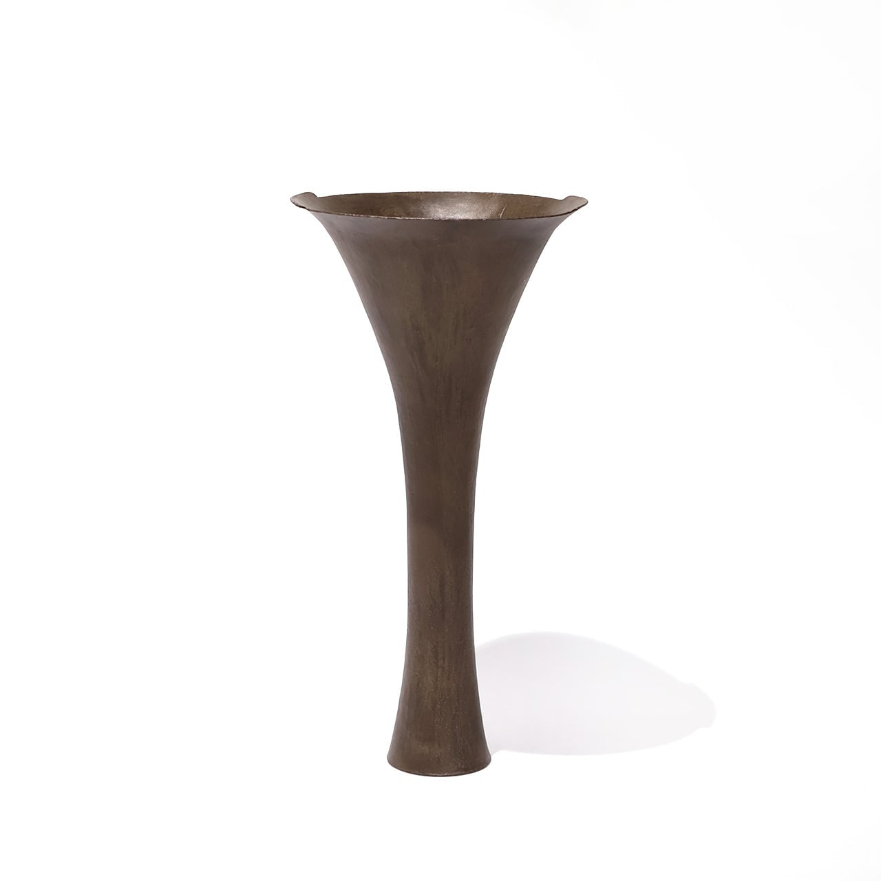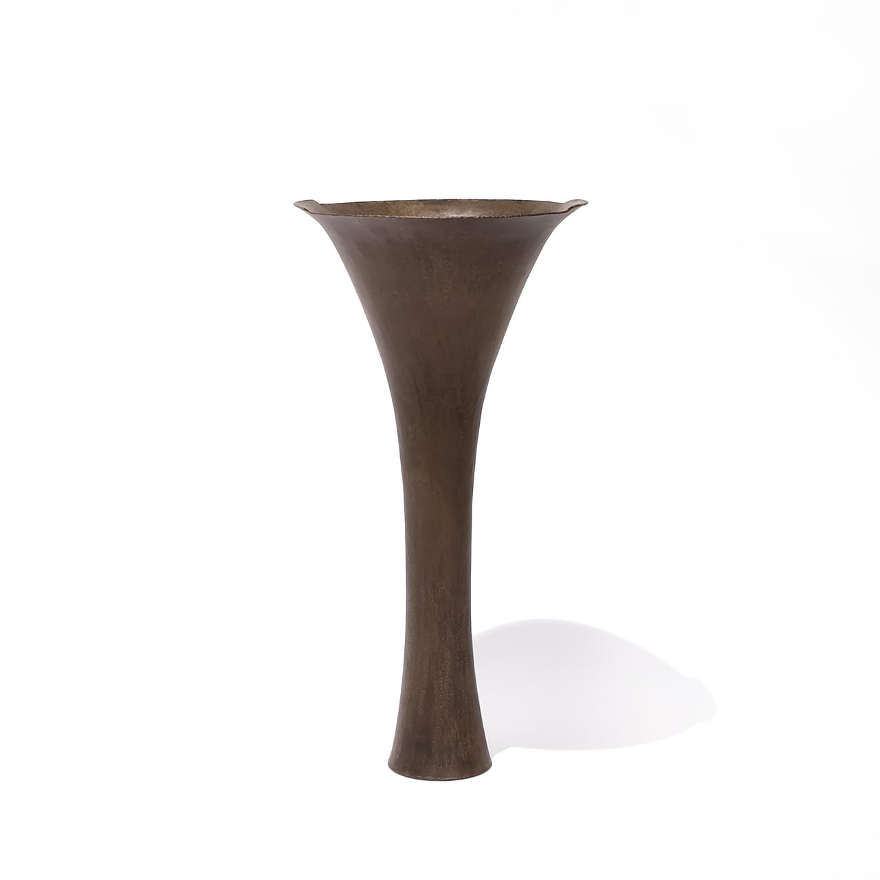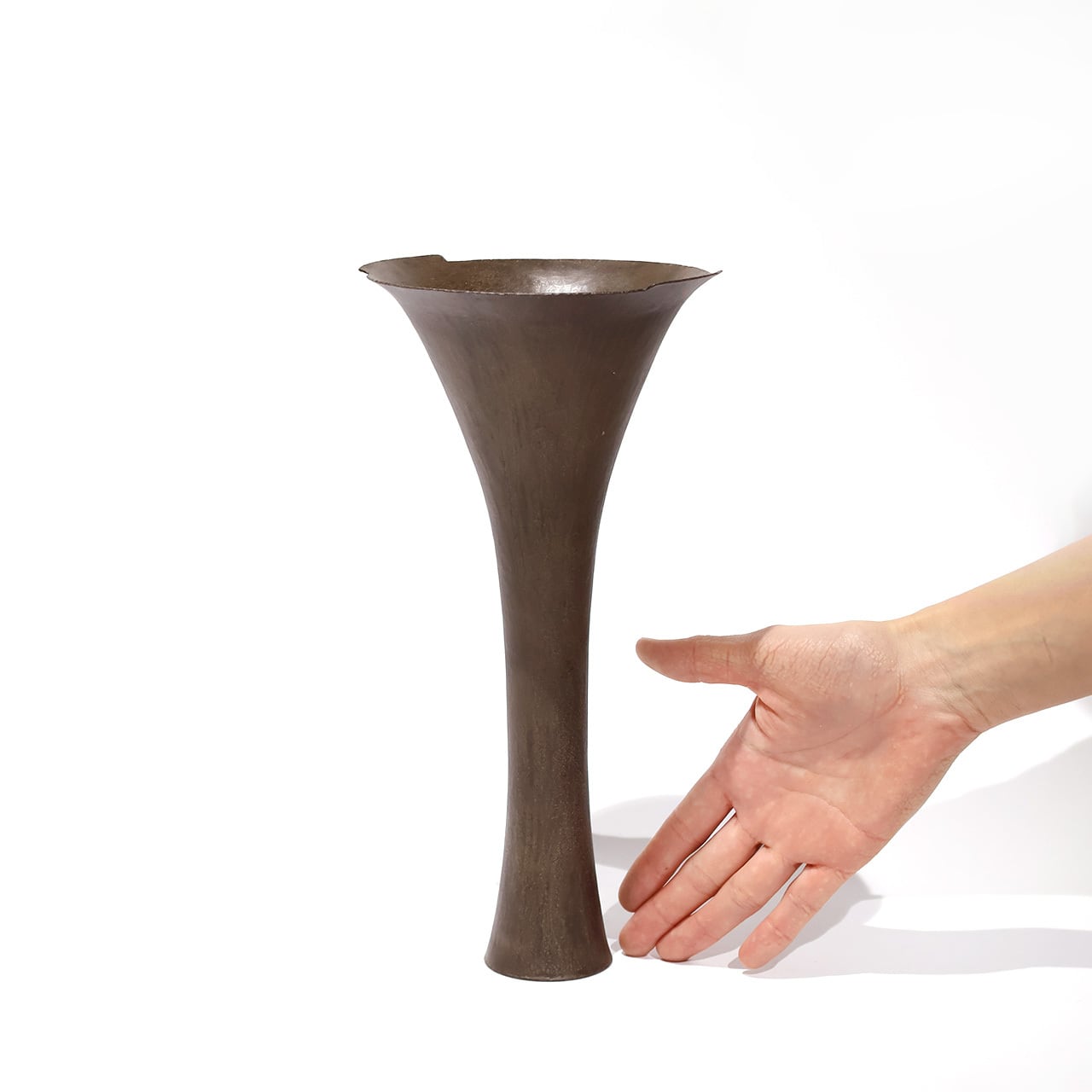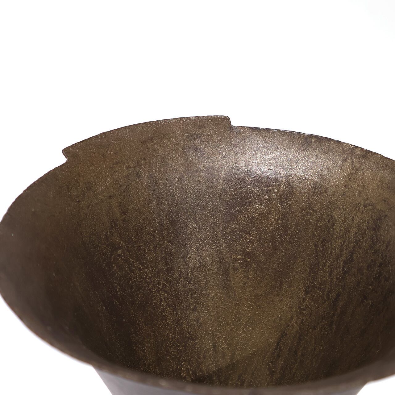 金工技法のひとつ金属を叩いて制作する鍛金の技法とジュエリー会社で習得した彫金の技術を用いて出来上がる作品は、金属という硬質なイメージとは裏腹にやわらかでしなやかな印象をもたらします。「錫釉銅」のやわらかな表情や自然に馴染む上品な佇まいのある花入です。