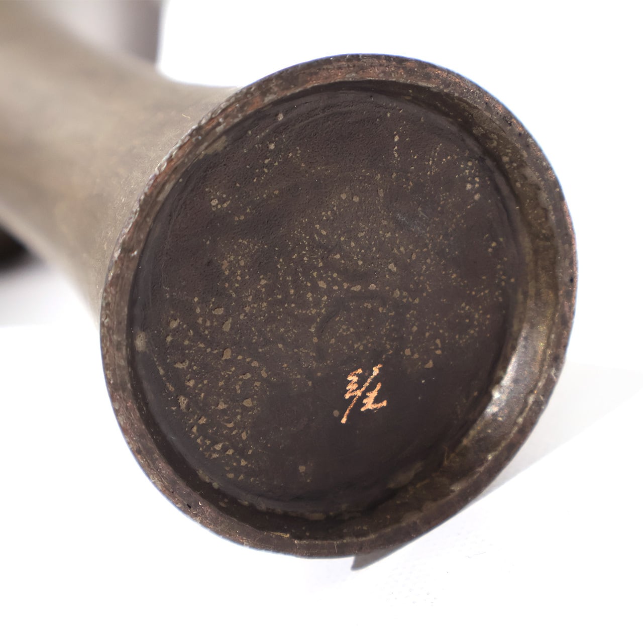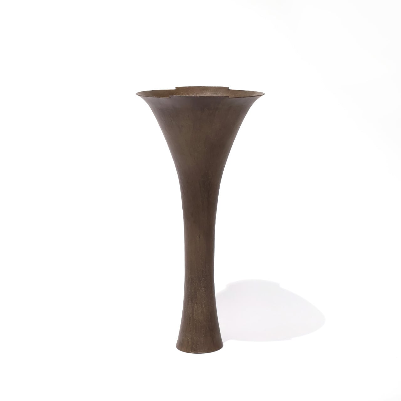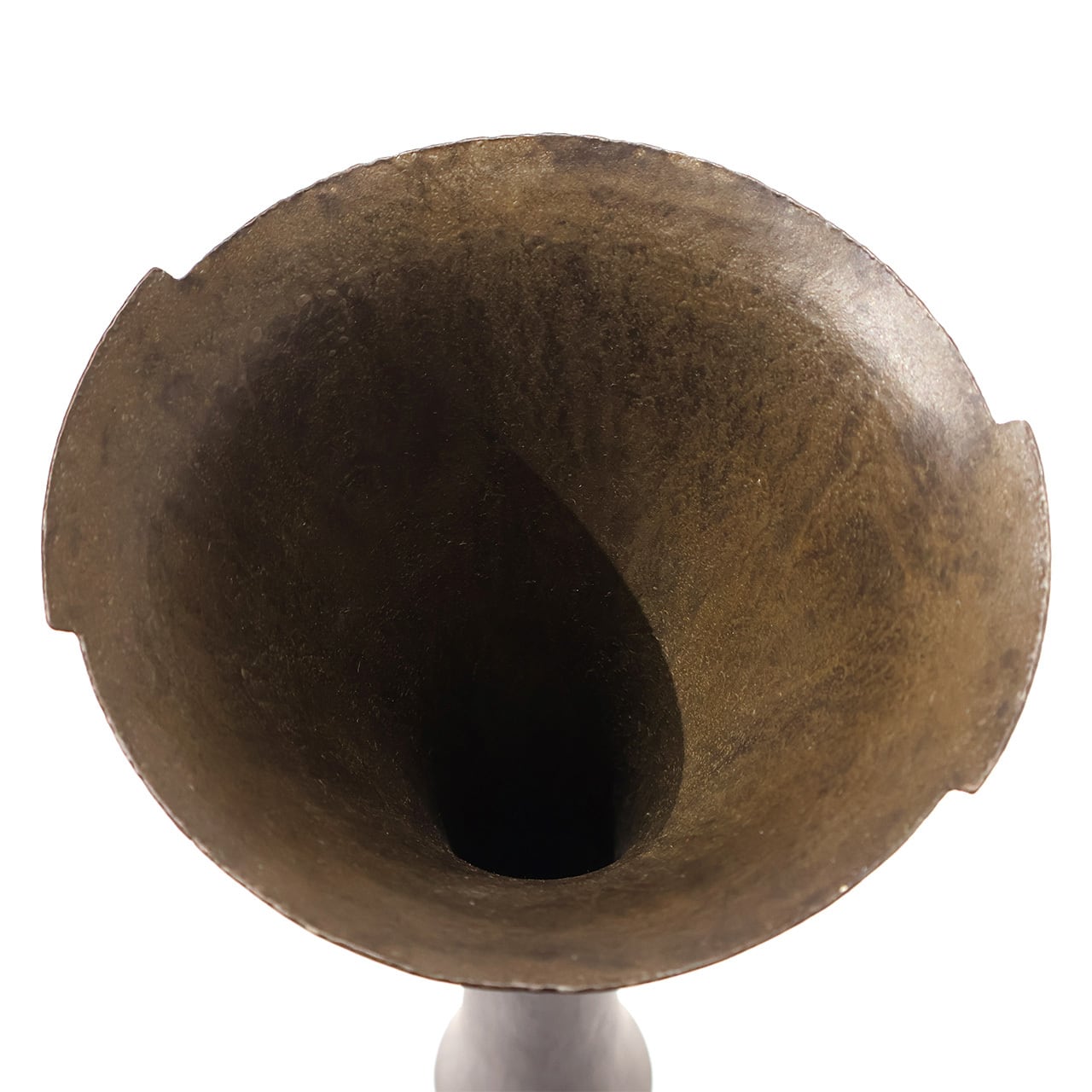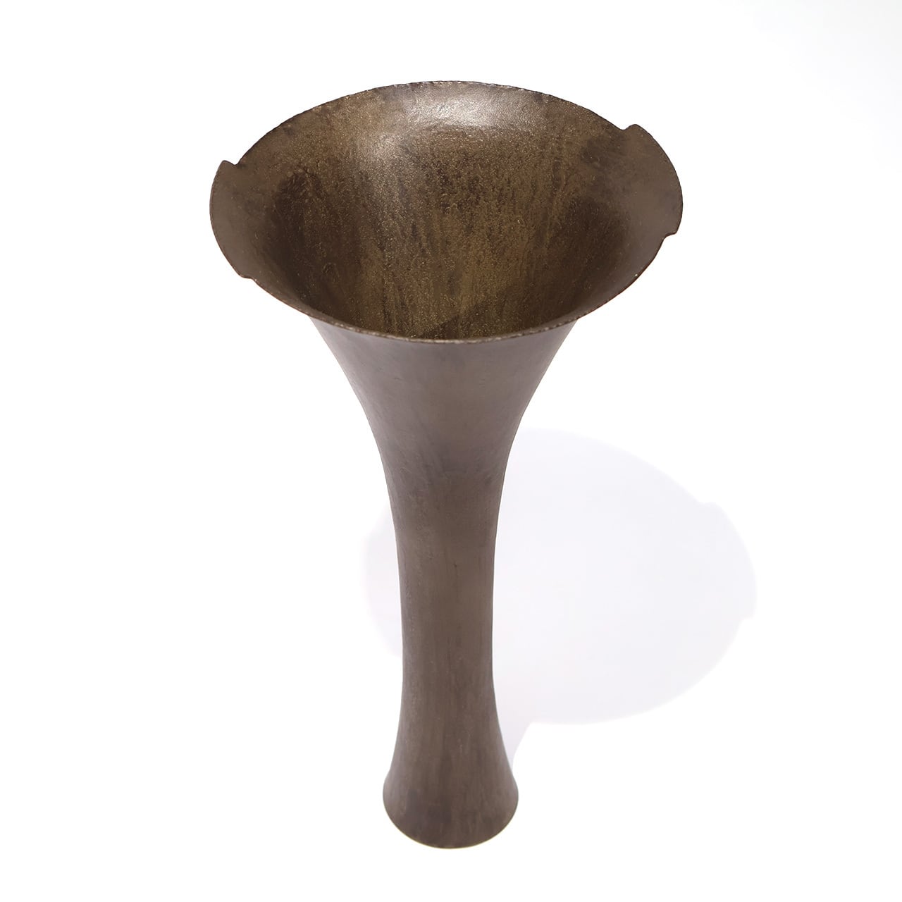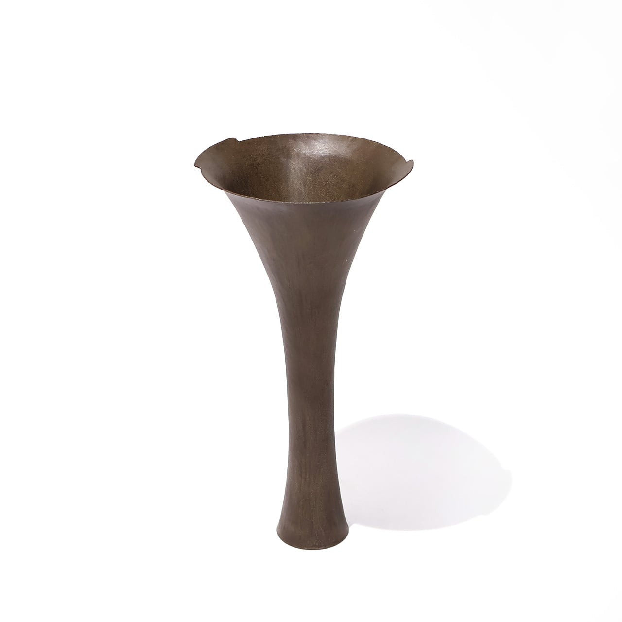 金工技法のひとつ金属を叩いて制作する鍛金の技法とジュエリー会社で習得した彫金の技術を用いて出来上がる作品は、金属という硬質なイメージとは裏腹にやわらかでしなやかな印象をもたらします。「錫釉銅」のやわらかな表情や自然に馴染む上品な佇まいのある花入です。