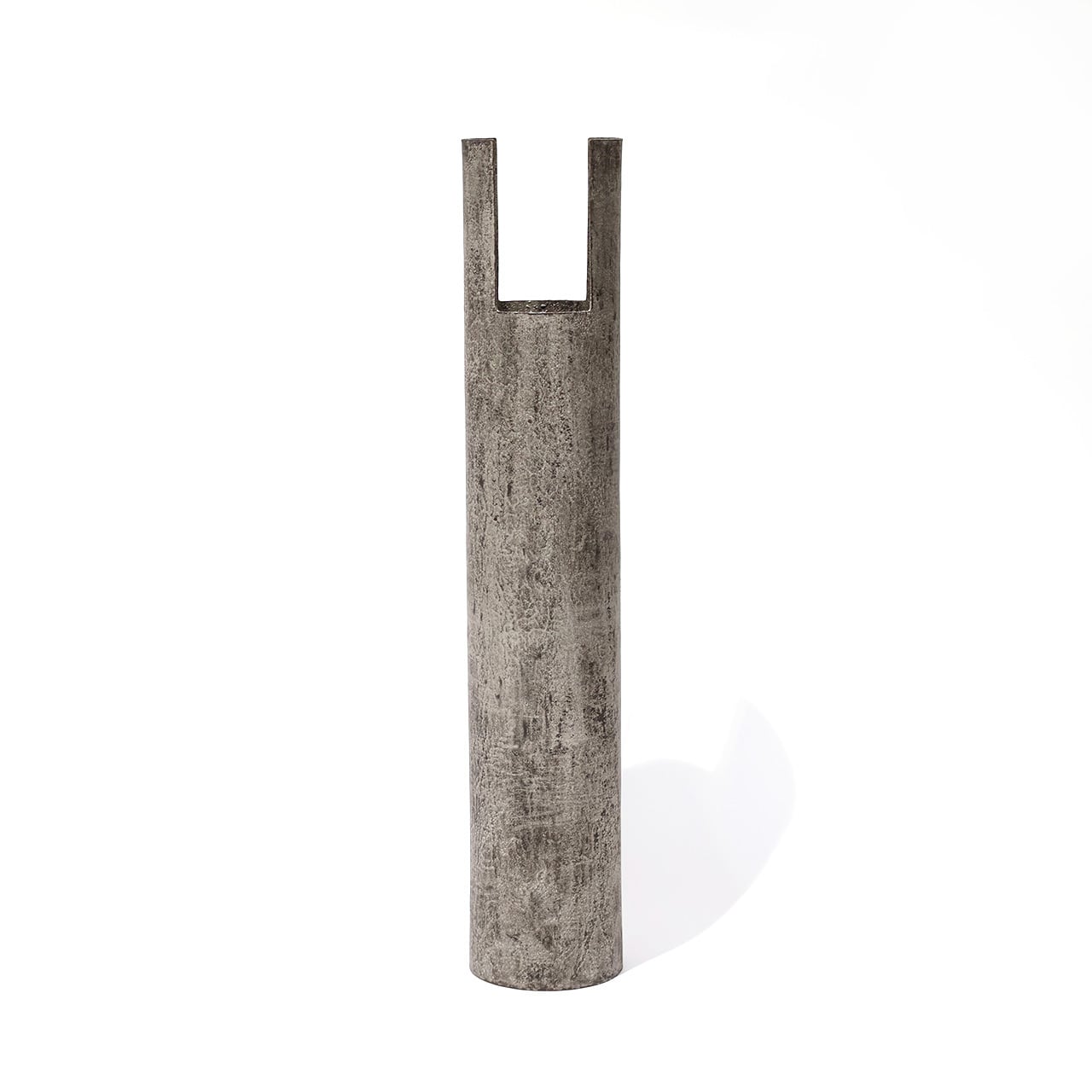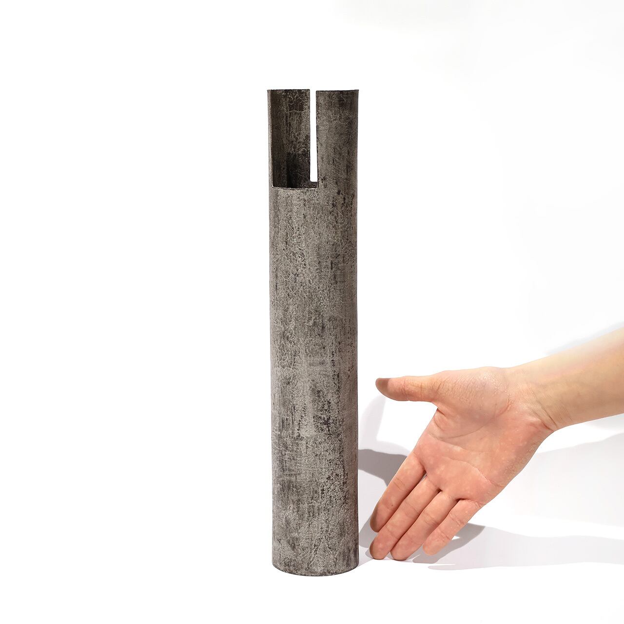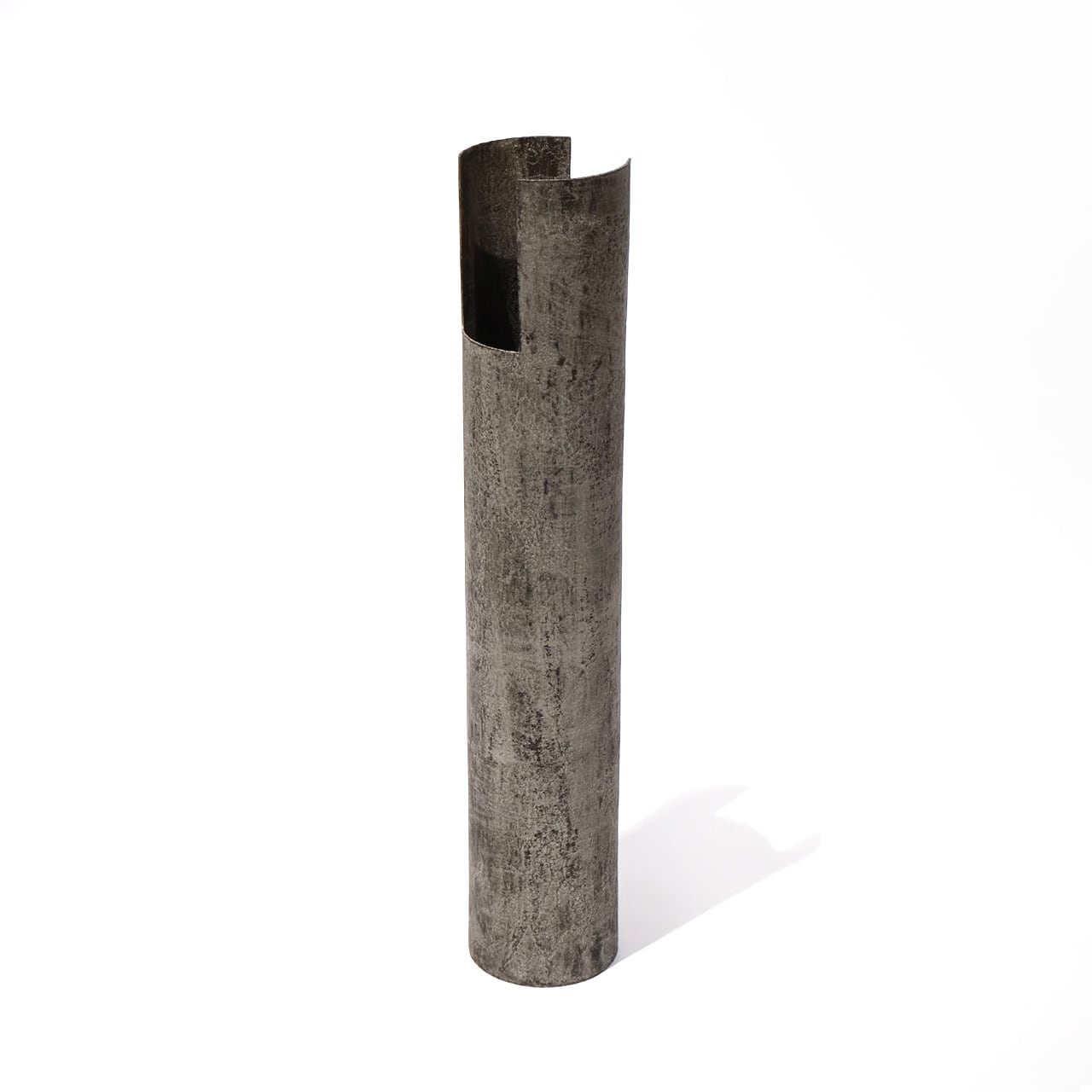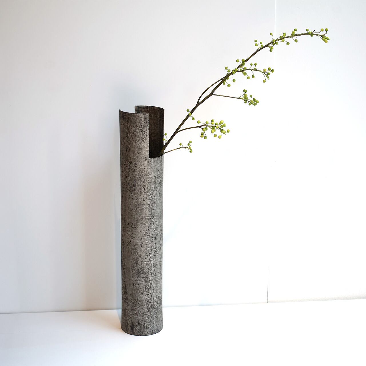 金工技法のひとつ金属を叩いて制作する鍛金の技法とジュエリー会社で習得した彫金の技術を用いて出来上がる作品は、金属という硬質なイメージとは裏腹にやわらかでしなやかな印象をもたらします。自然的な「錫釉銅」の表情と、耳付のアクセントのある形姿が美しい空間を生み出します。