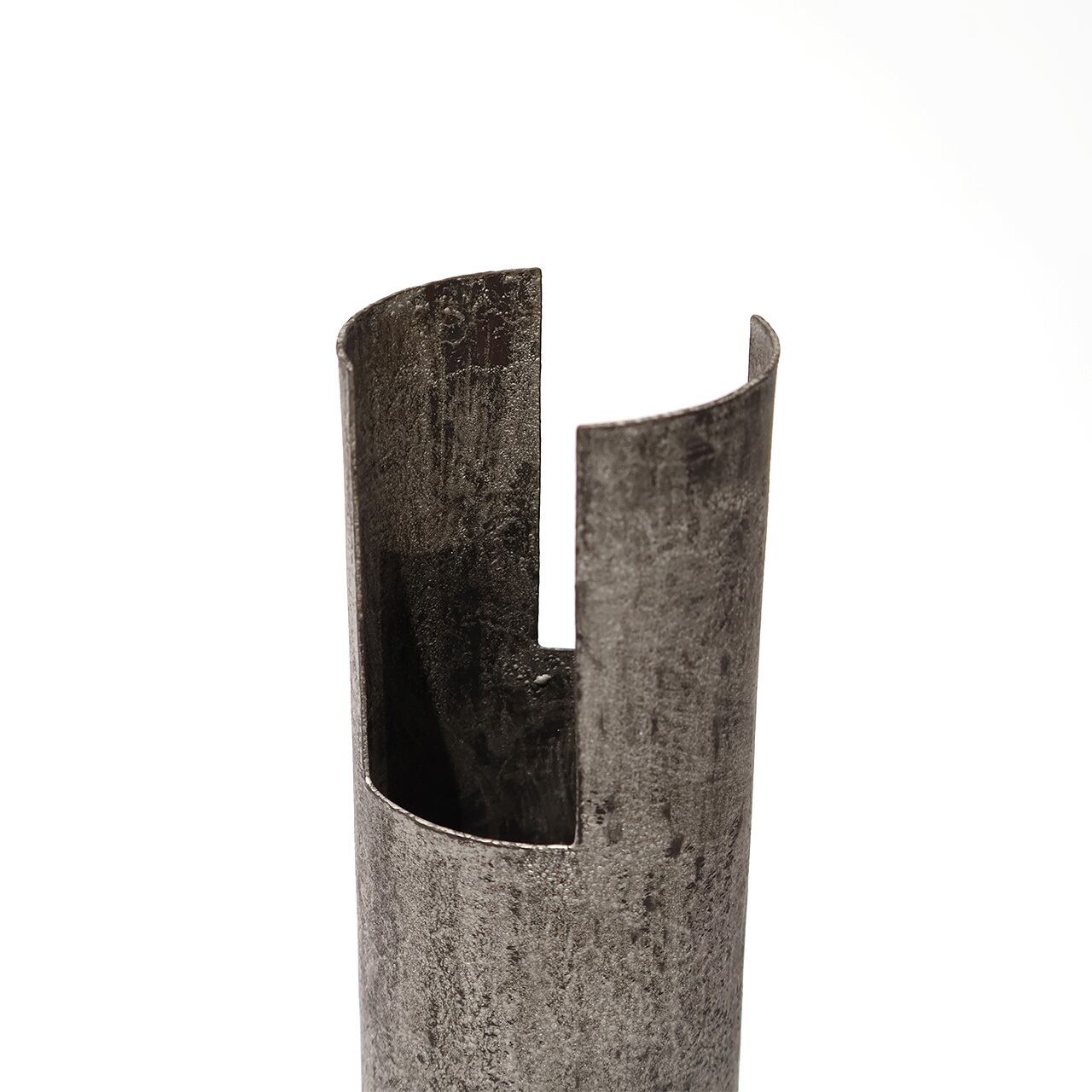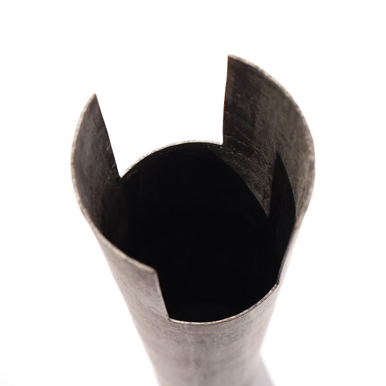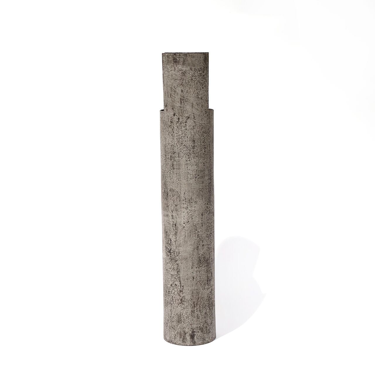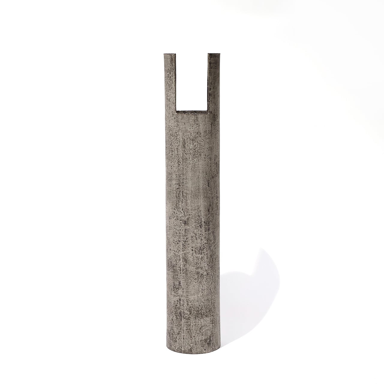 金工技法のひとつ金属を叩いて制作する鍛金の技法とジュエリー会社で習得した彫金の技術を用いて出来上がる作品は、金属という硬質なイメージとは裏腹にやわらかでしなやかな印象をもたらします。自然的な「錫釉銅」の表情と、耳付のアクセントのある形姿が美しい空間を生み出します。
