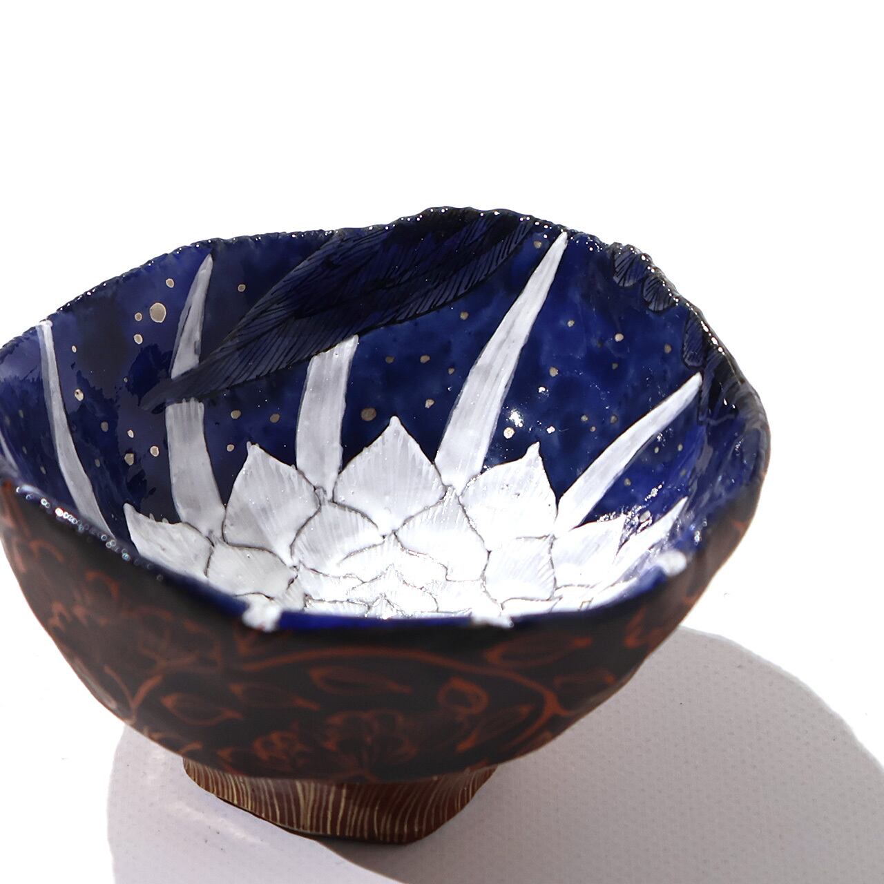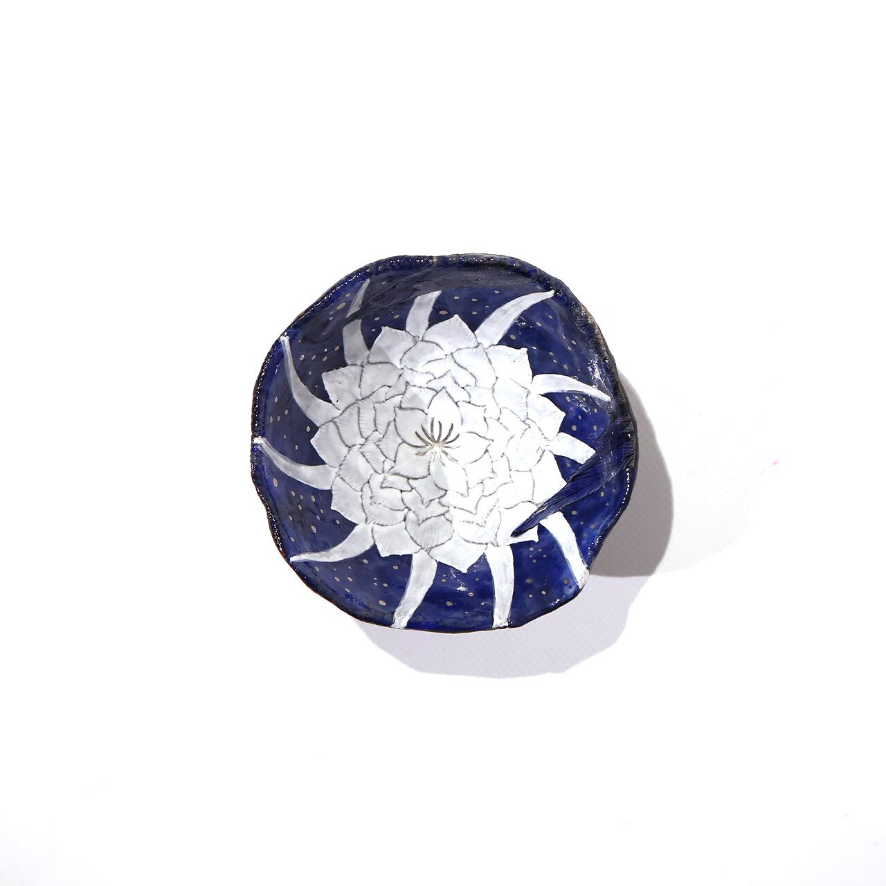 月下美人の花と夜を舞う鳥(の羽)が丁寧に描かれた神秘的な器です。