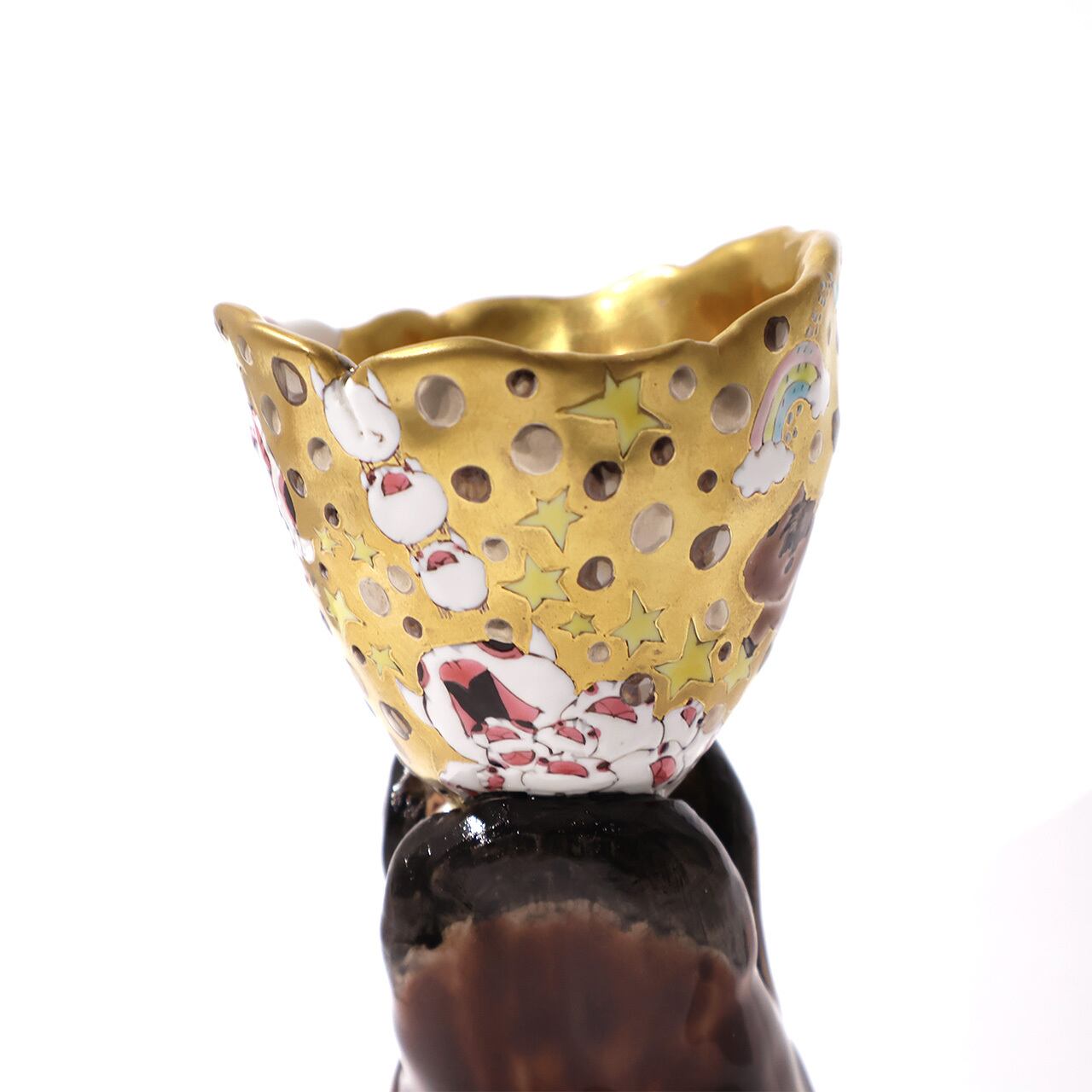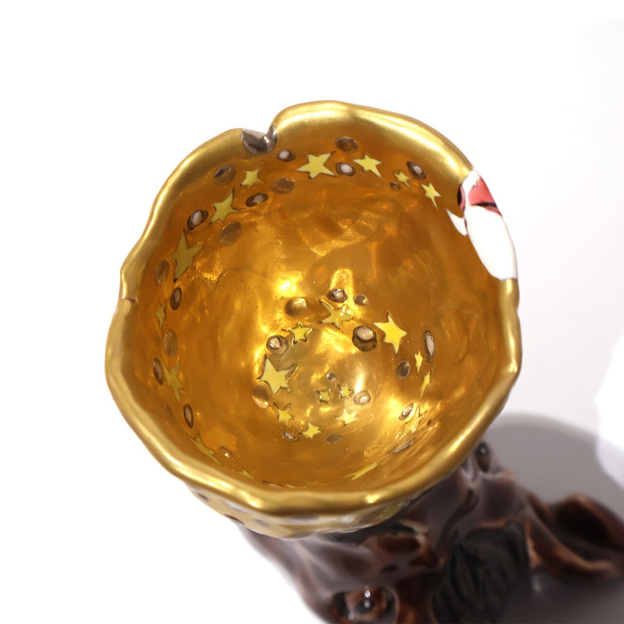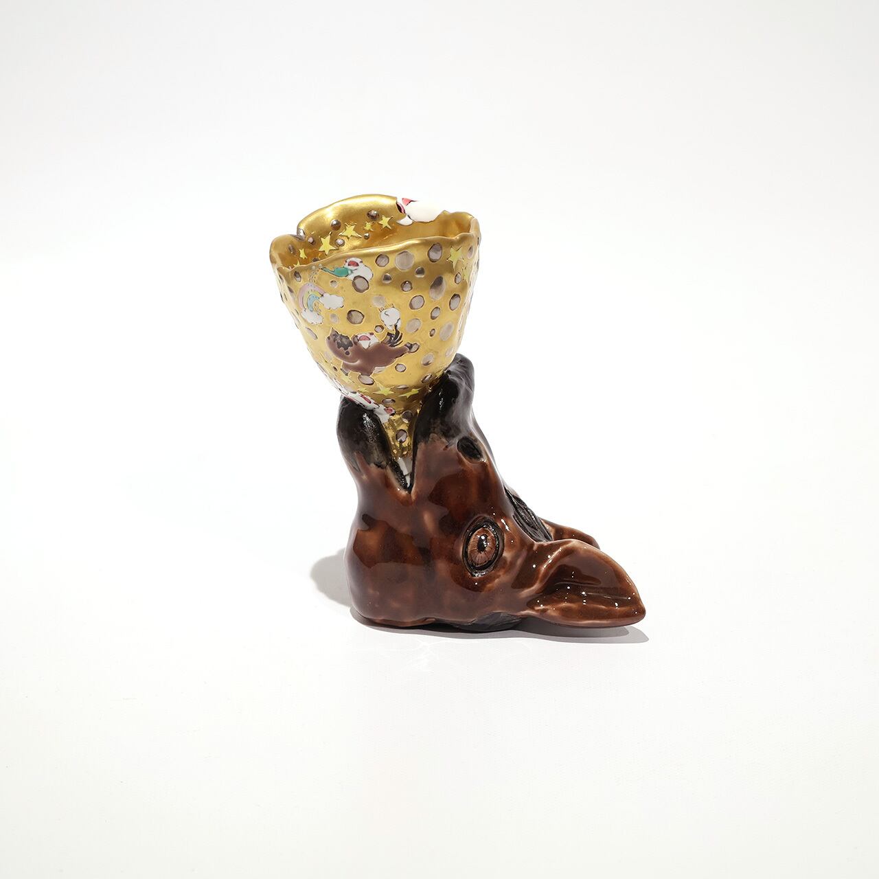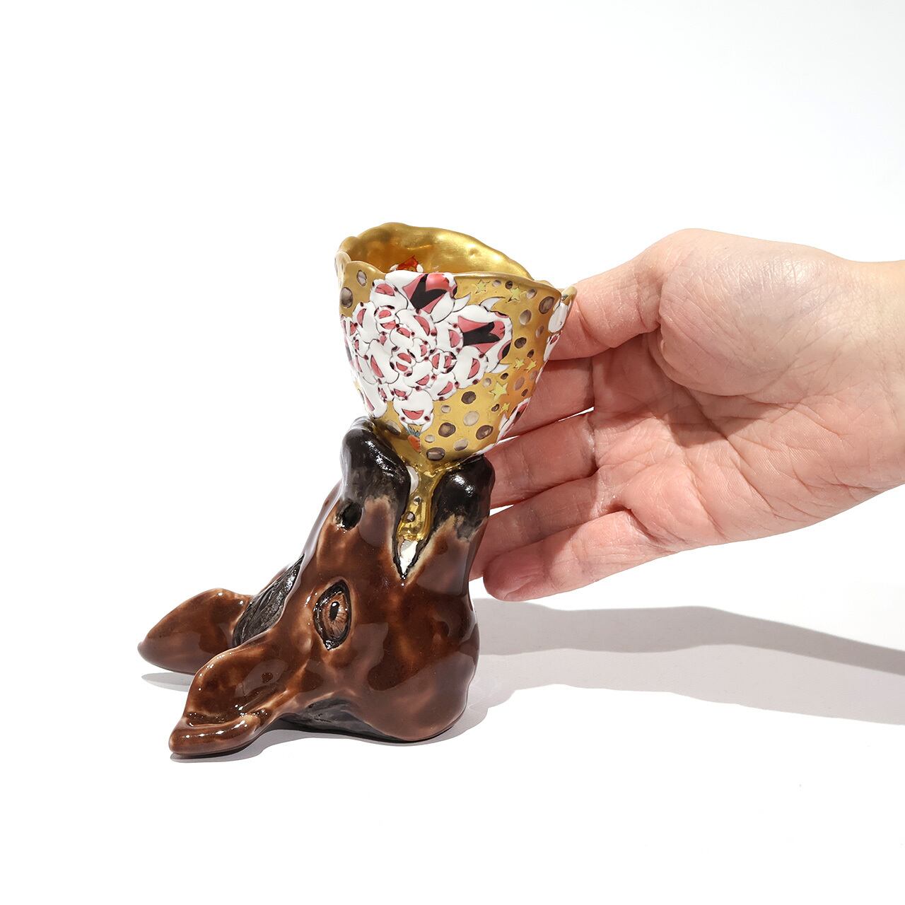 胎から自身で制作された馬上杯。午年にちなみ馬の上にある盃=馬上盃のダジャレが効いた作家の遊び心溢れる作品です。