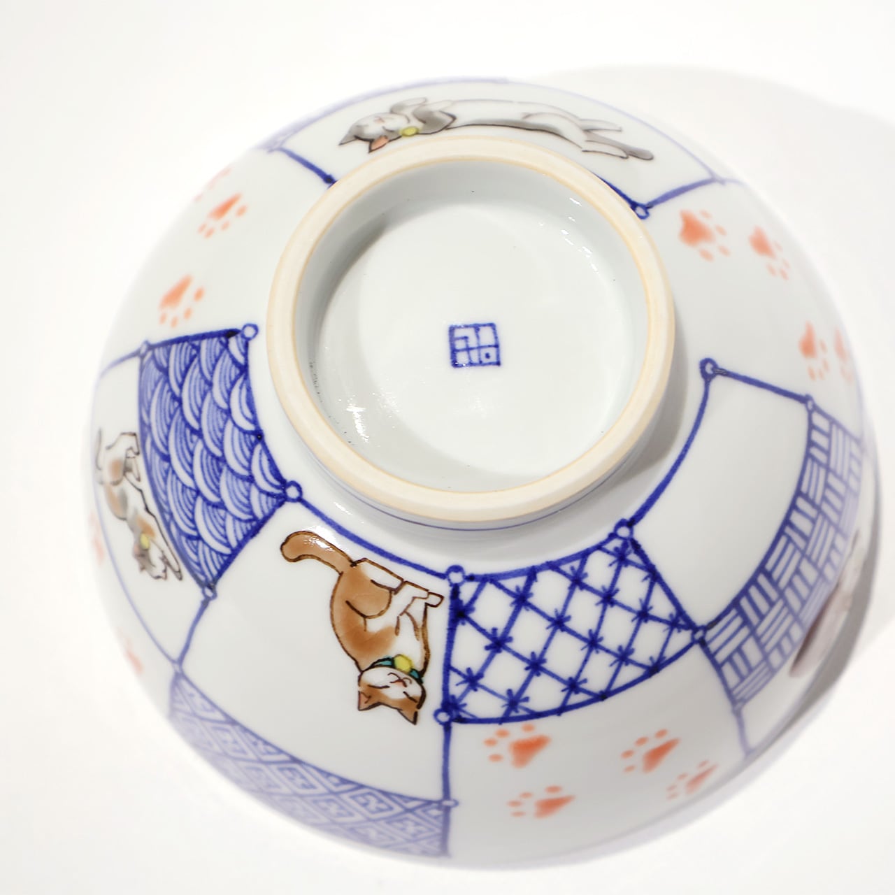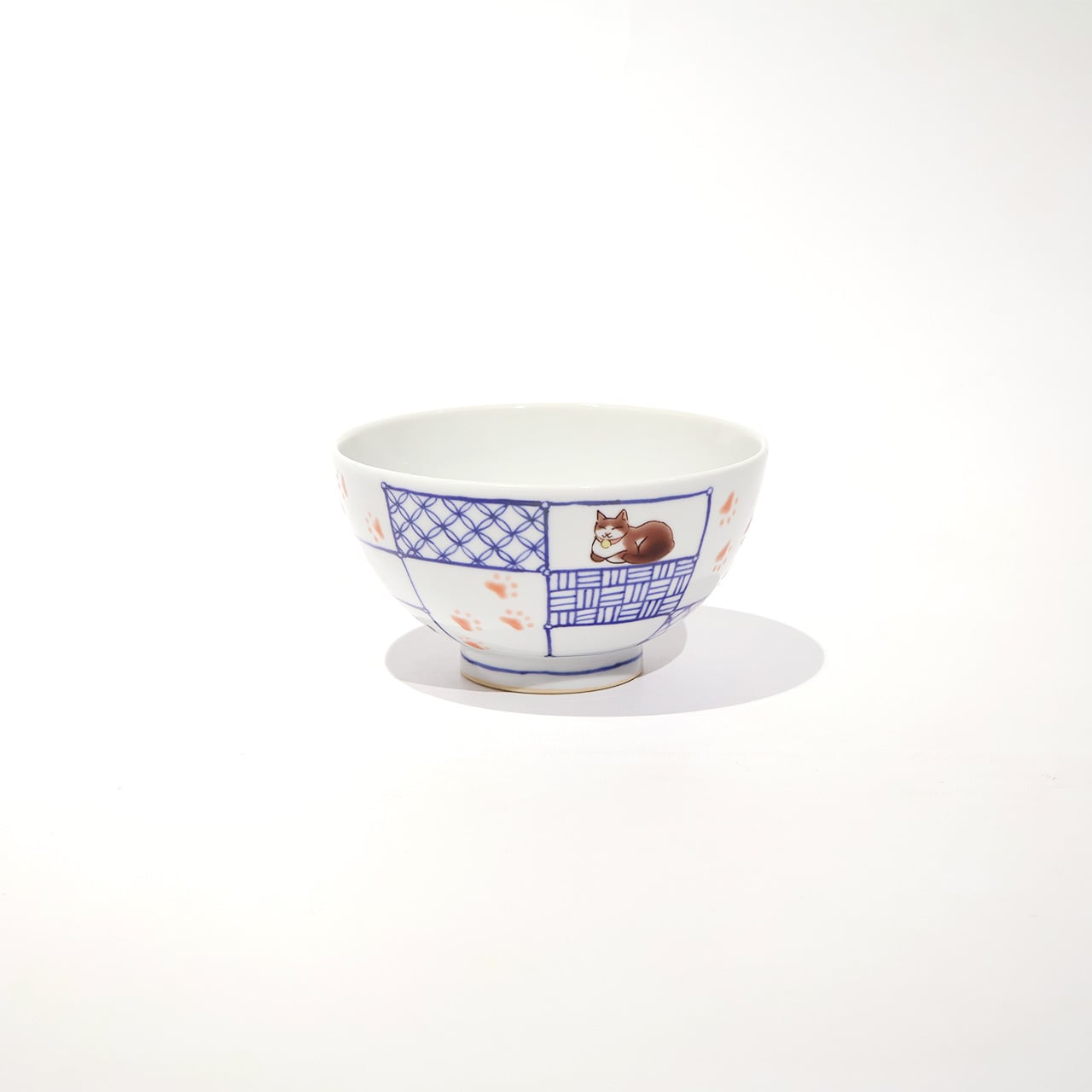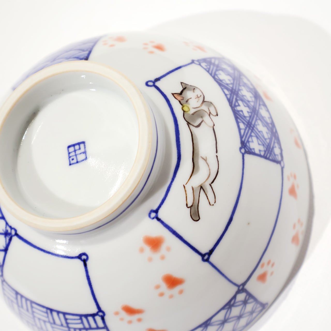 枠の中に染付の文様と可愛らしい猫が配され、ぷっくりとした足跡を思わずたどりたくなる飯碗です。