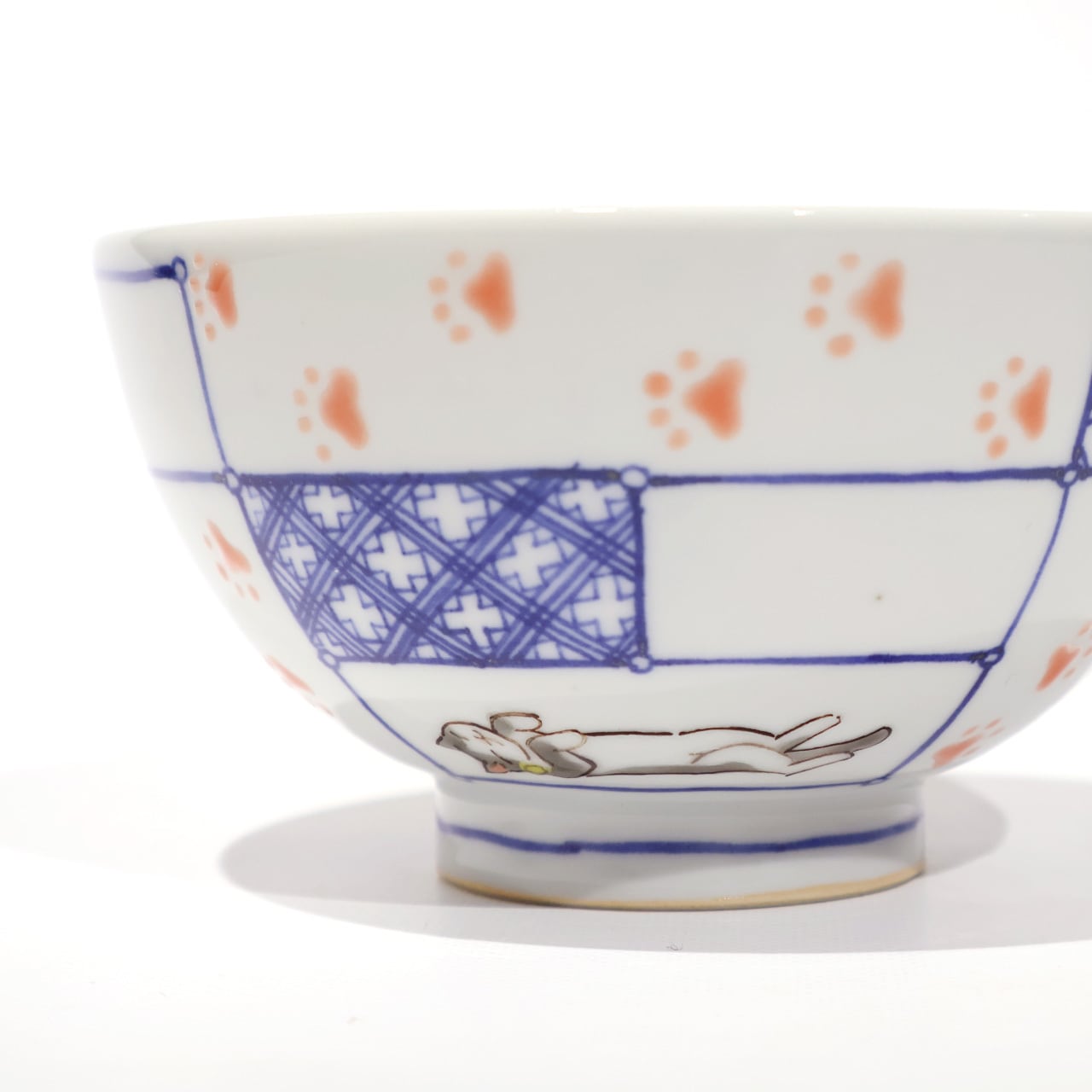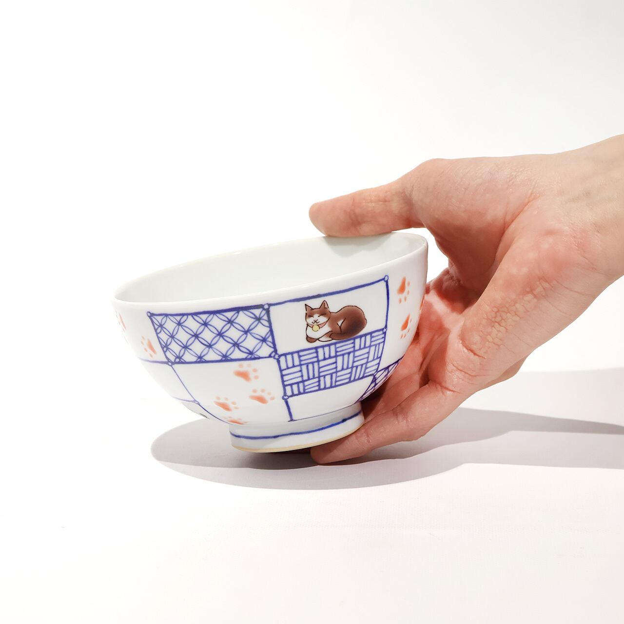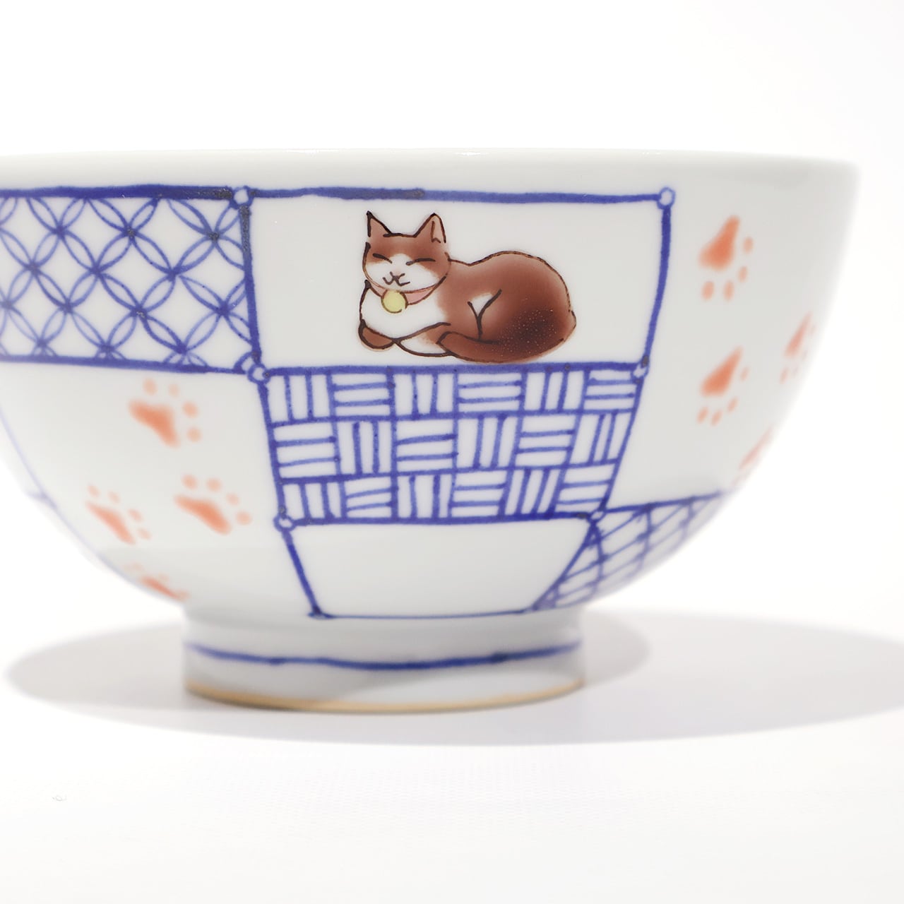 枠の中に染付の文様と可愛らしい猫が配され、ぷっくりとした足跡を思わずたどりたくなる飯碗です。