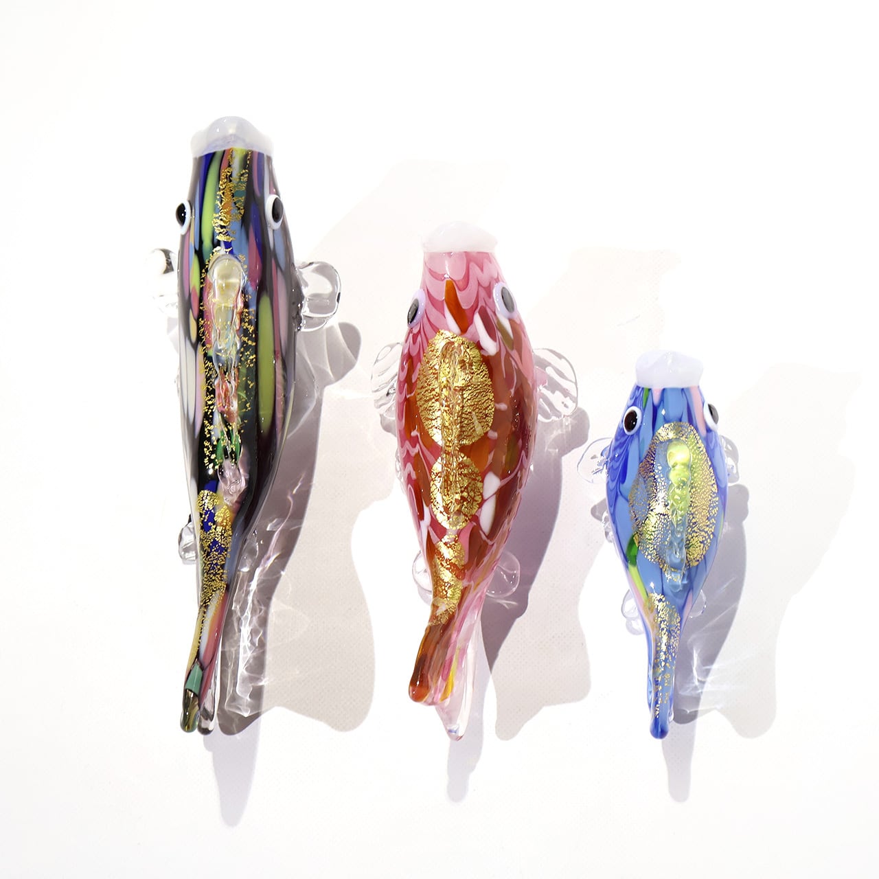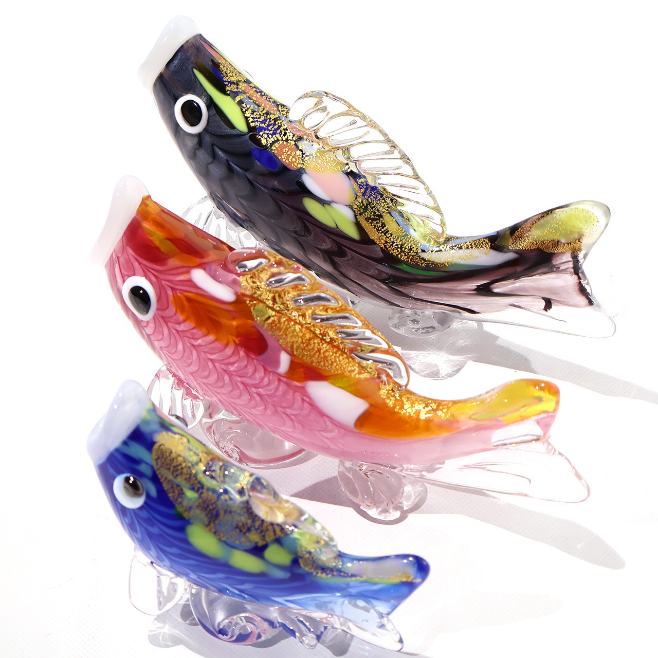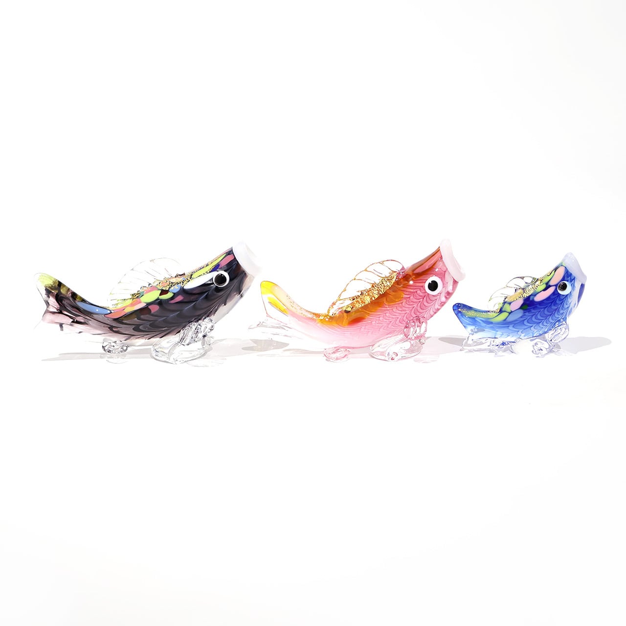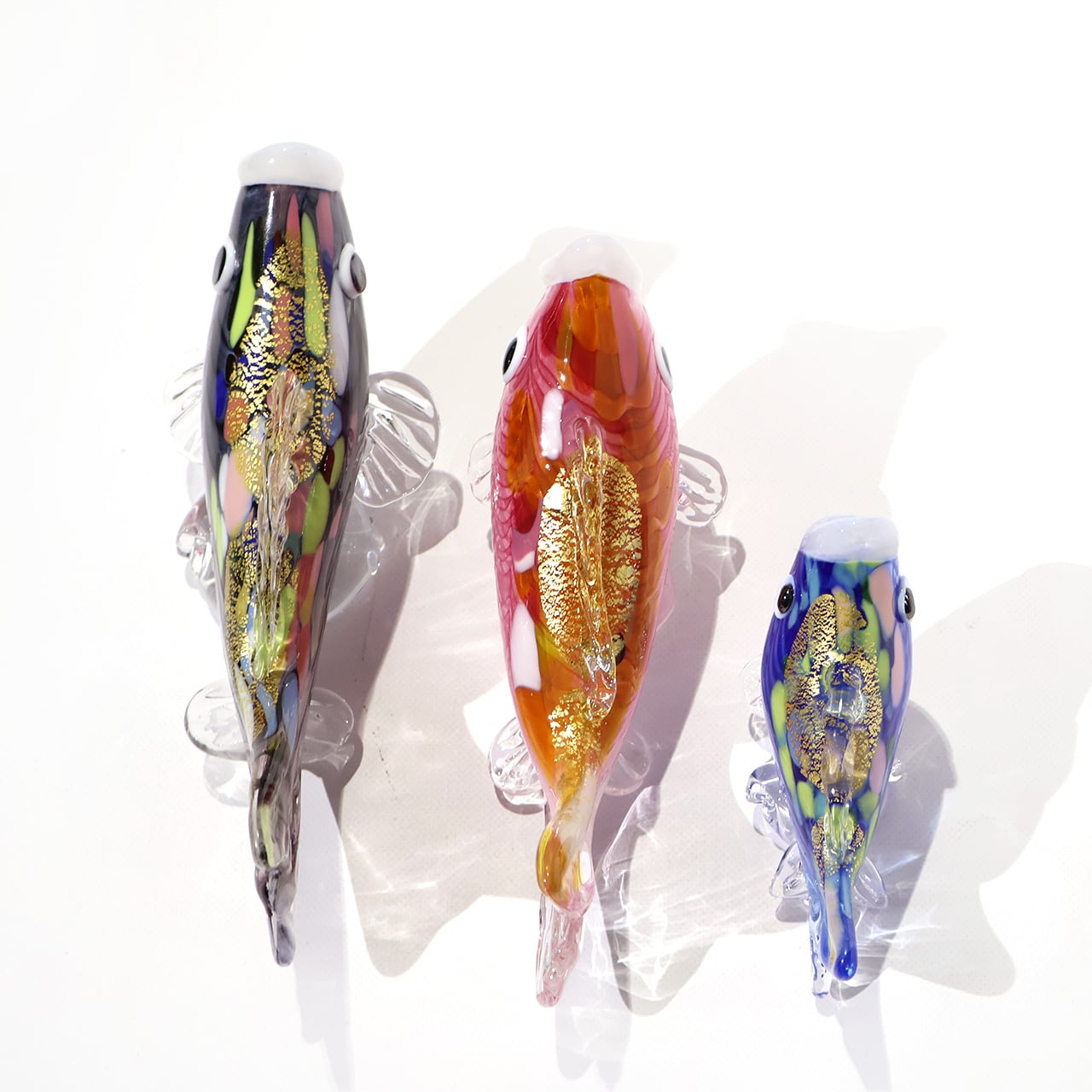 全面ミルフィオリ技法でできた真鯉、加えてマーブルのような鱗模様の入った緋鯉と青い鯉。