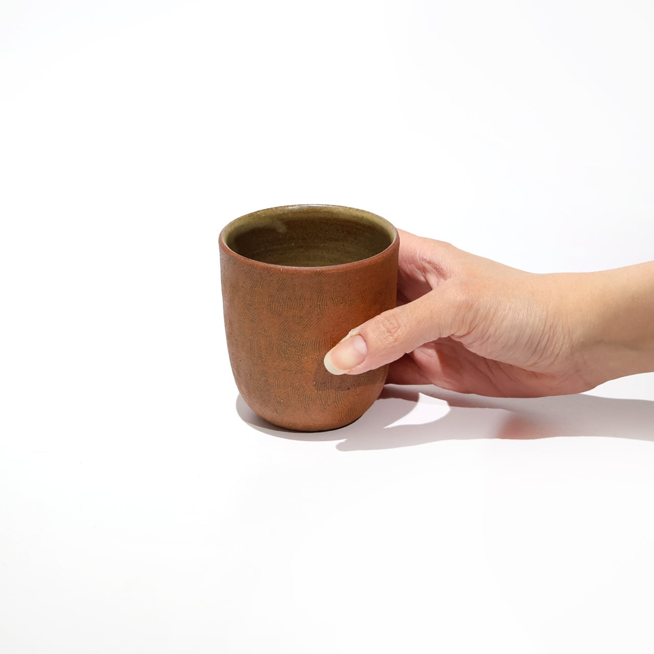 手の中で肌触りをお楽しみくださいませ。たっぷりとお茶を入れていただけるサイズ感です。