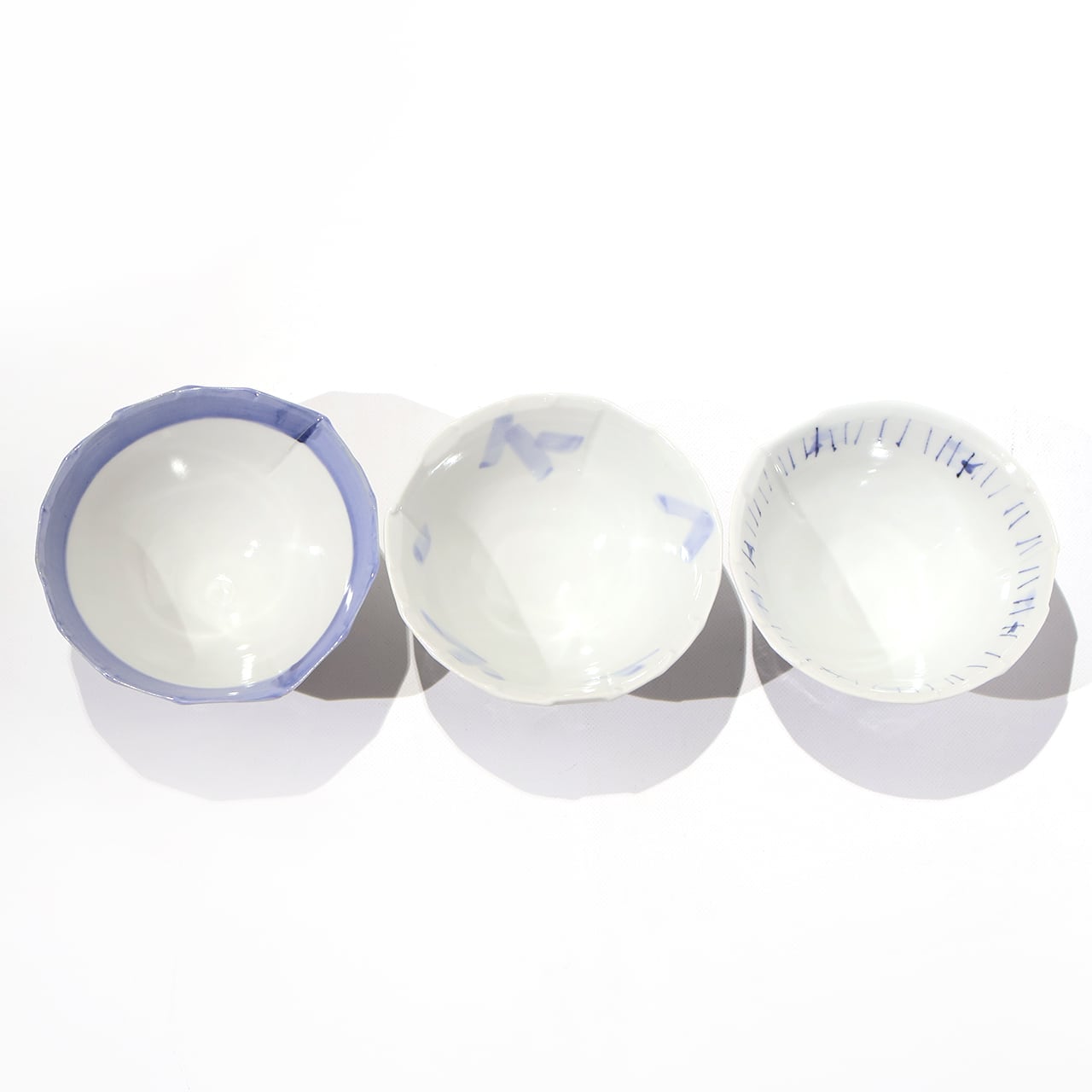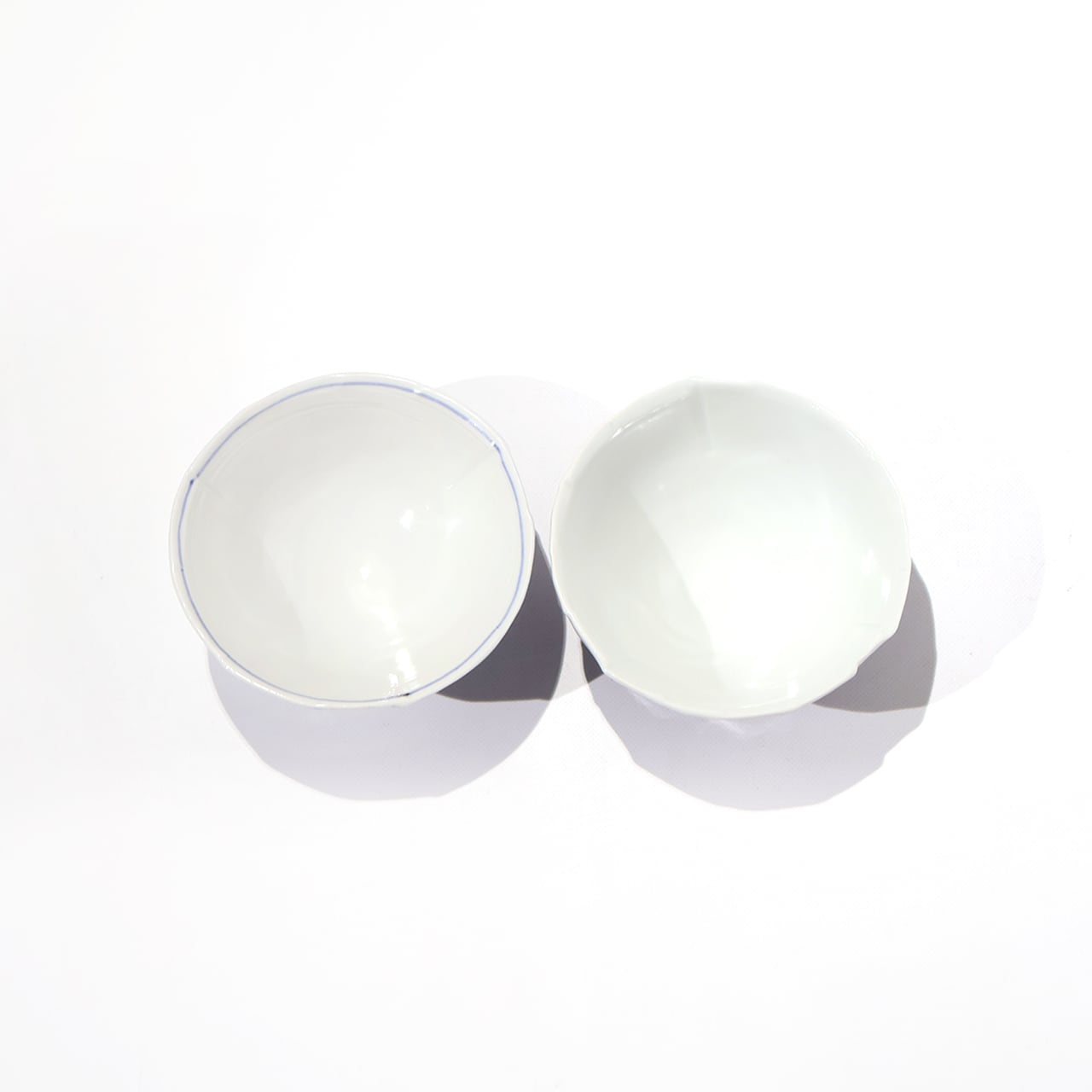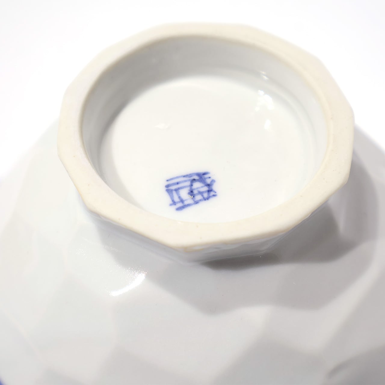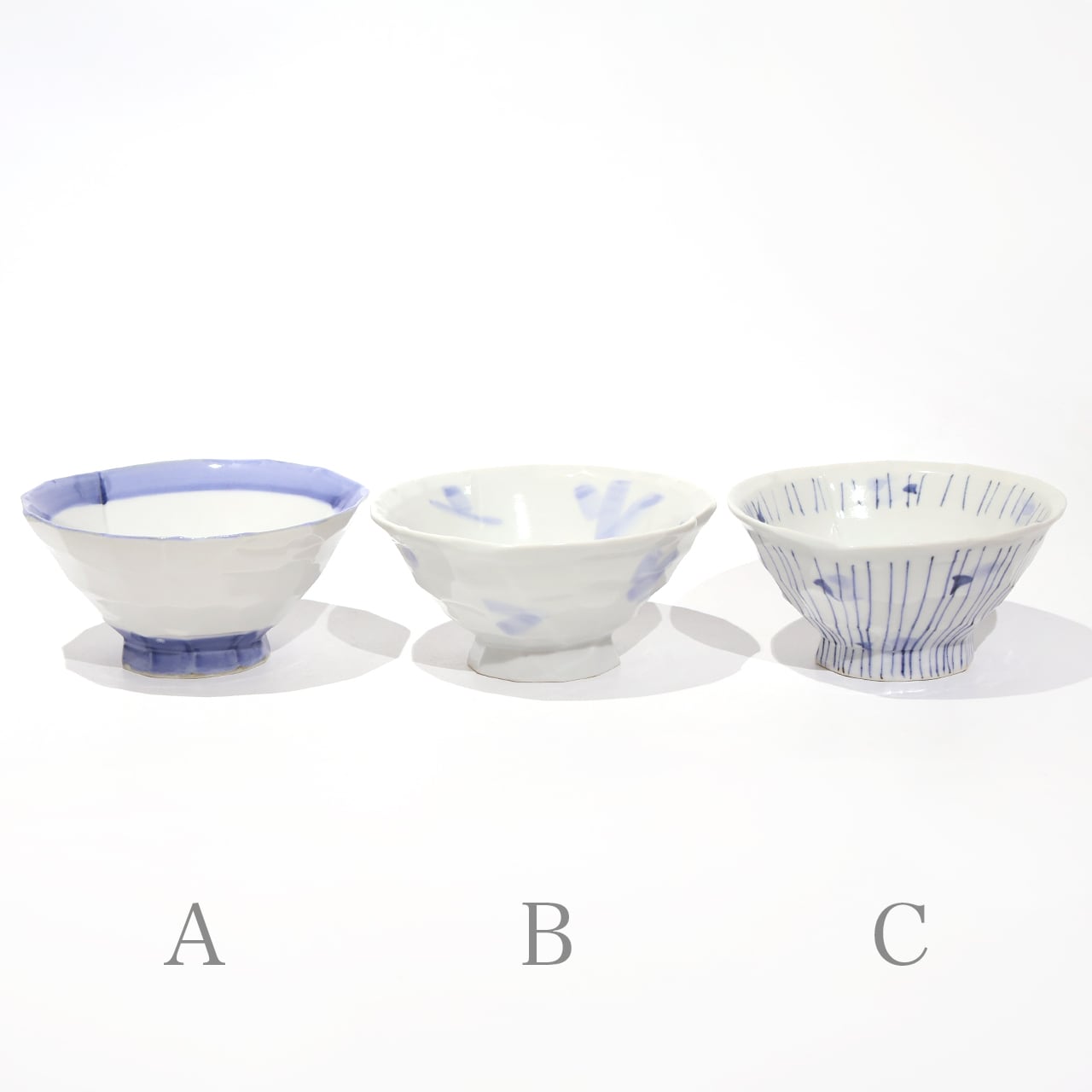 多田さんの素朴なタッチが光る染付と、のみで削った跡をイメージしたハツリが手に馴染む飯碗です。