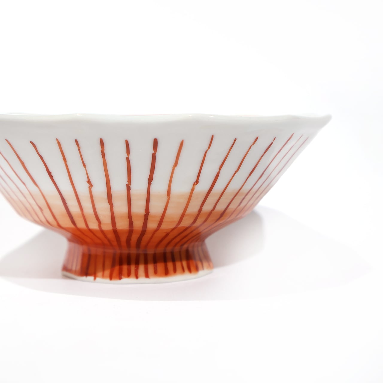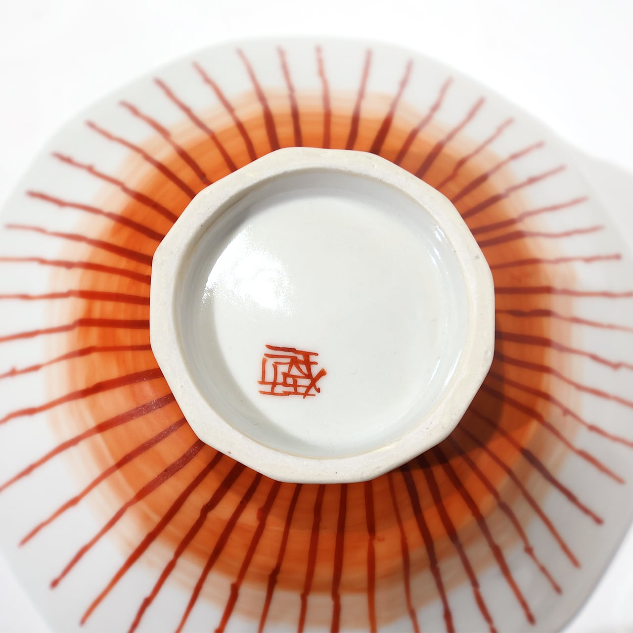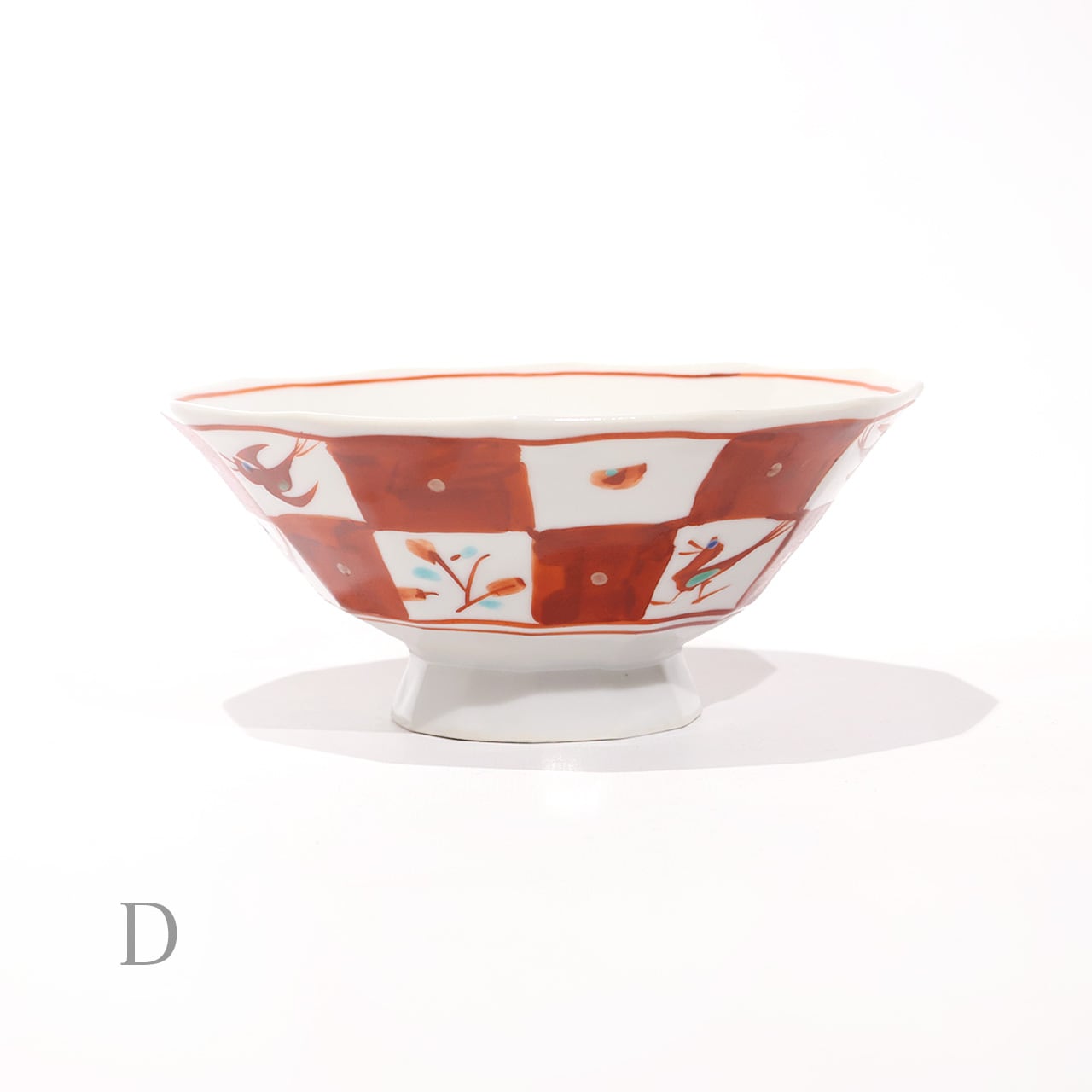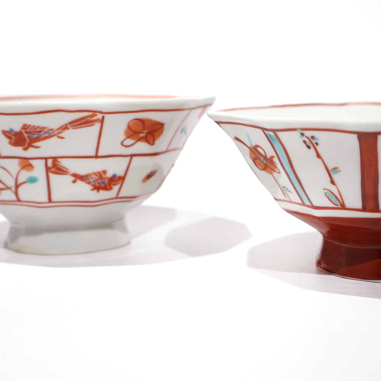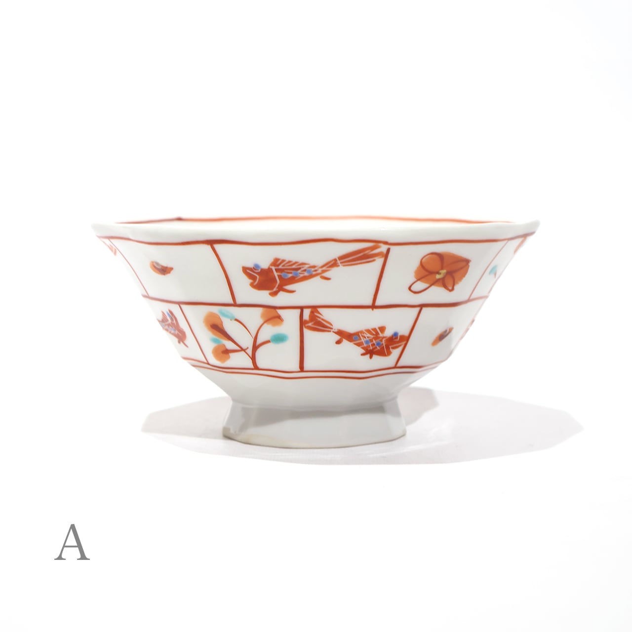 すっきりと削ぎ落とした側面に魚や草花、線文が軽やかなタッチで描かれた赤が印象的な飯碗です。
