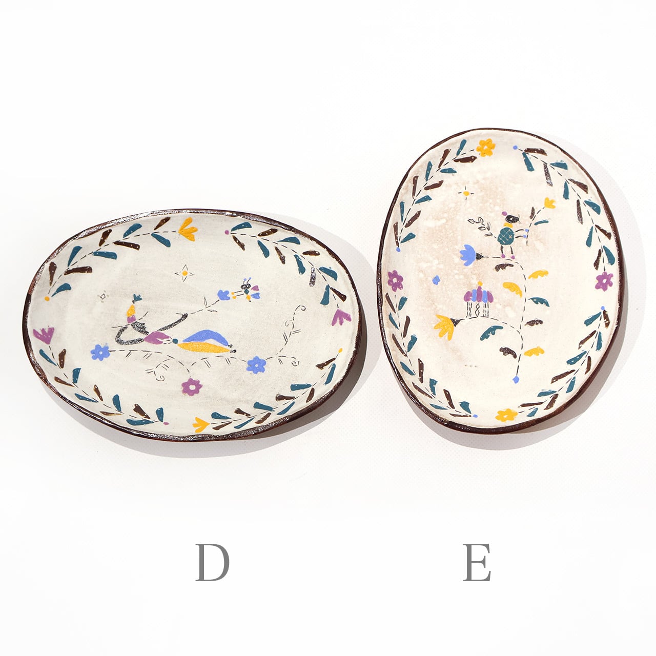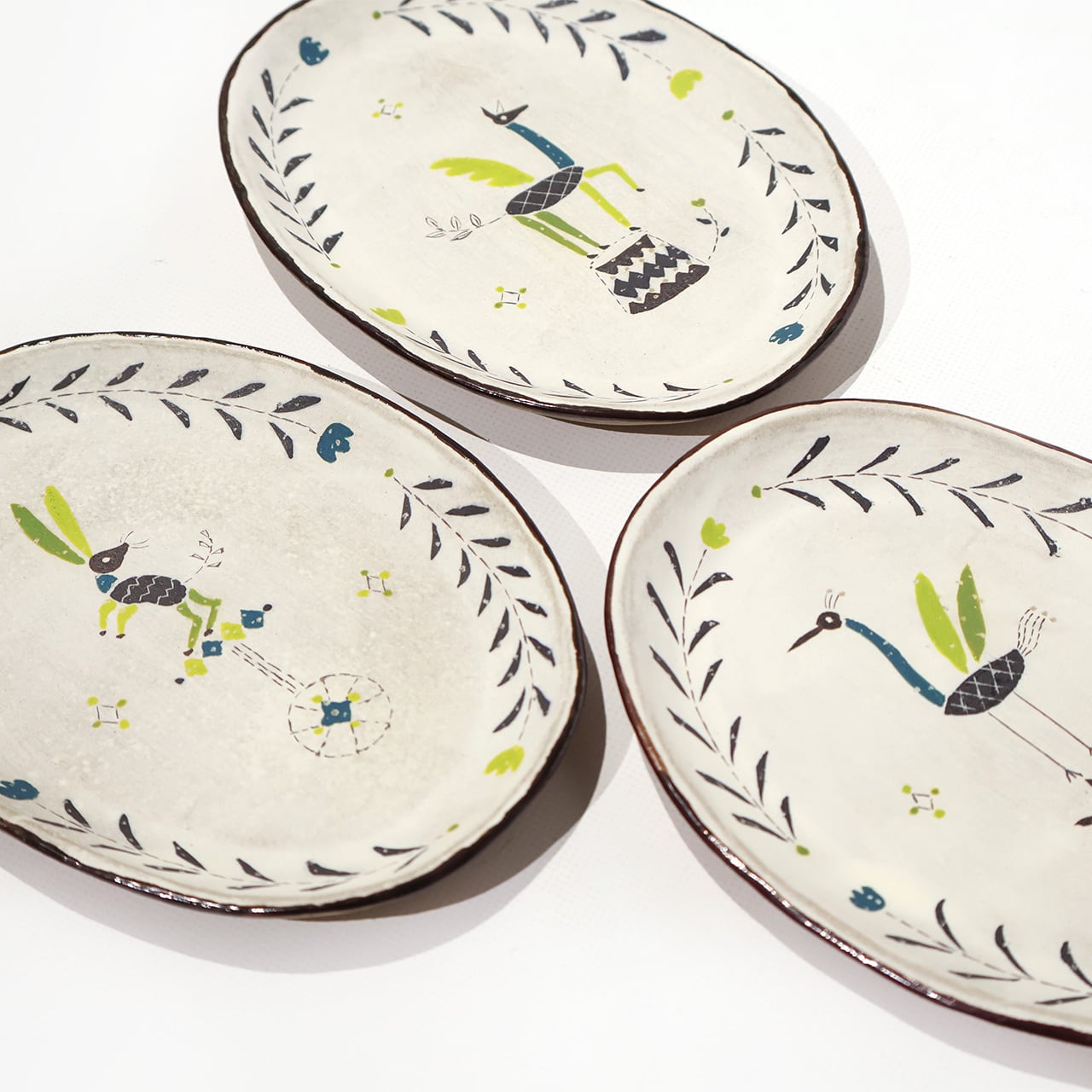 かわいらしいグリーンで描かれたサーカス団のような動物たち、木陰で寝転ぶ人やお花を掲げるネズミなど、ストーリーを感じる絵付けが施された手のひらサイズの楕円皿です。