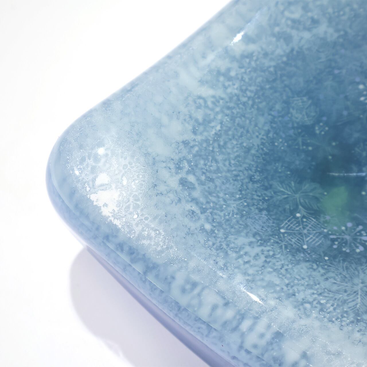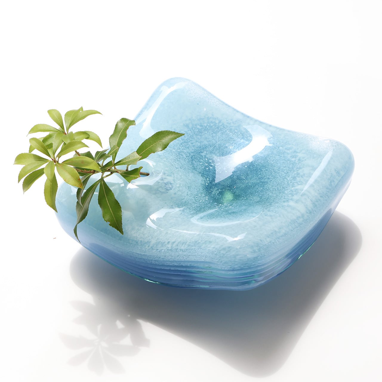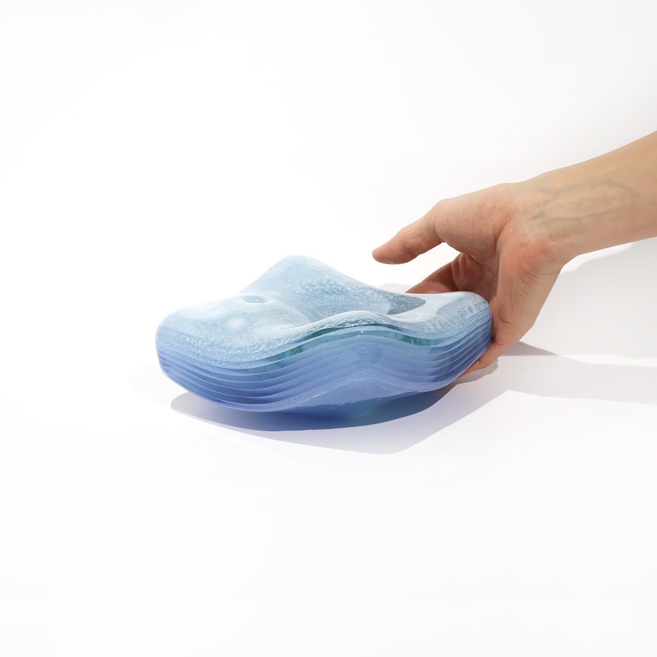 何層も重なったガラスの色調が美しく、静かで清冽な水のある風景を想起させます。眺めていると気持ちがほどけけていくような感覚を覚えます。