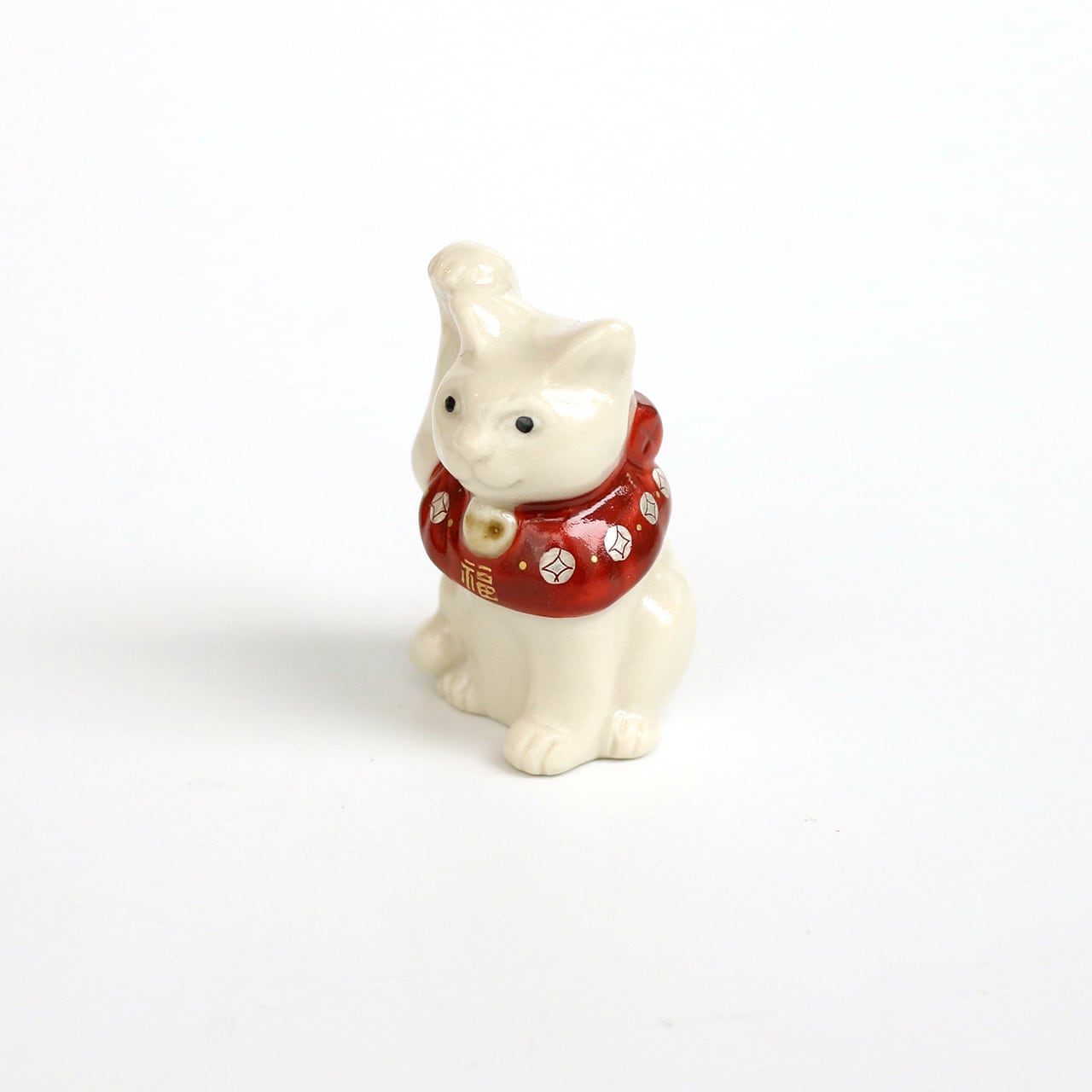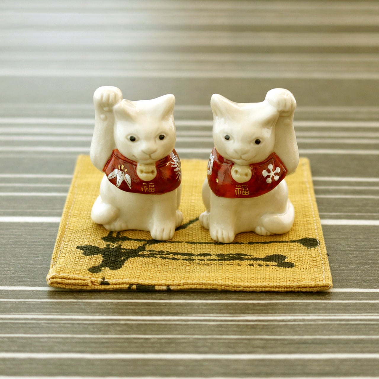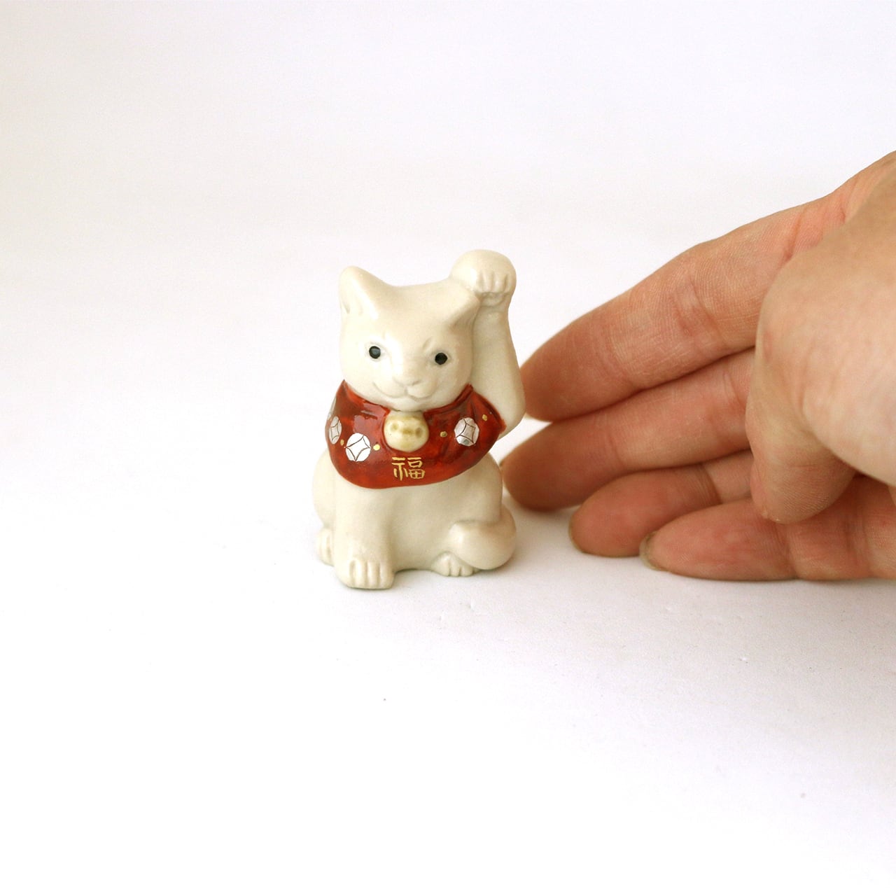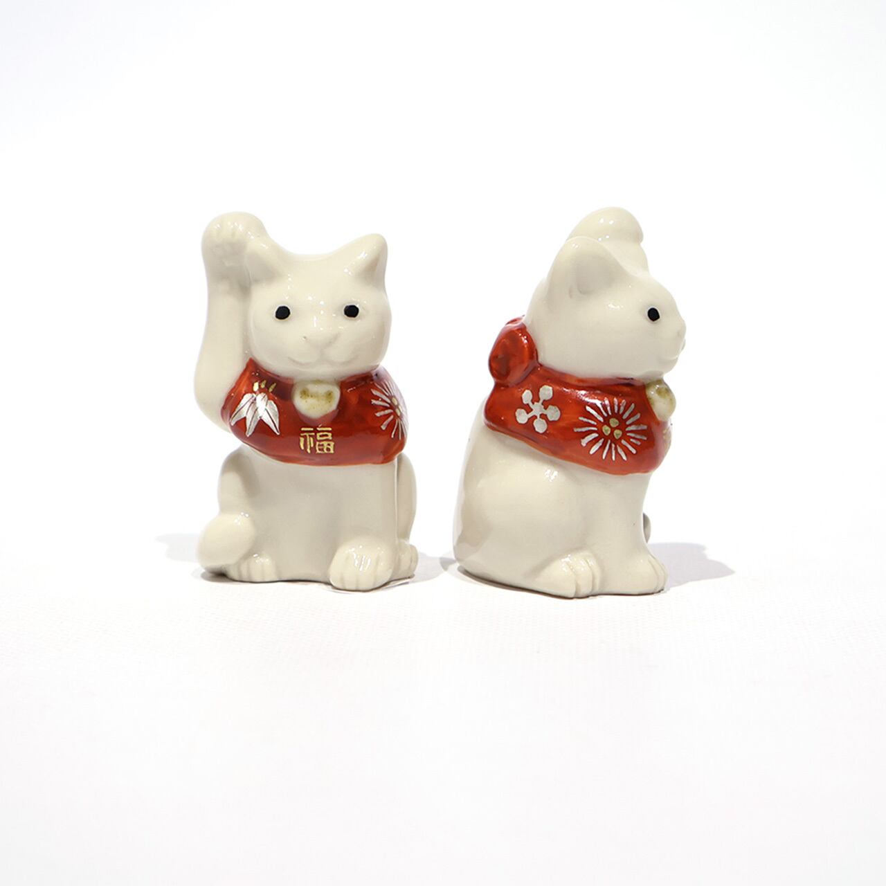 片手をちょこんと上げ、松竹梅などの描かれた赤い前掛けが首の後ろでリボン結びされている、可愛いサイズの福を招く猫です。昔から、右手は金運を招く、左手は人脈を招く、と言われているそうです。