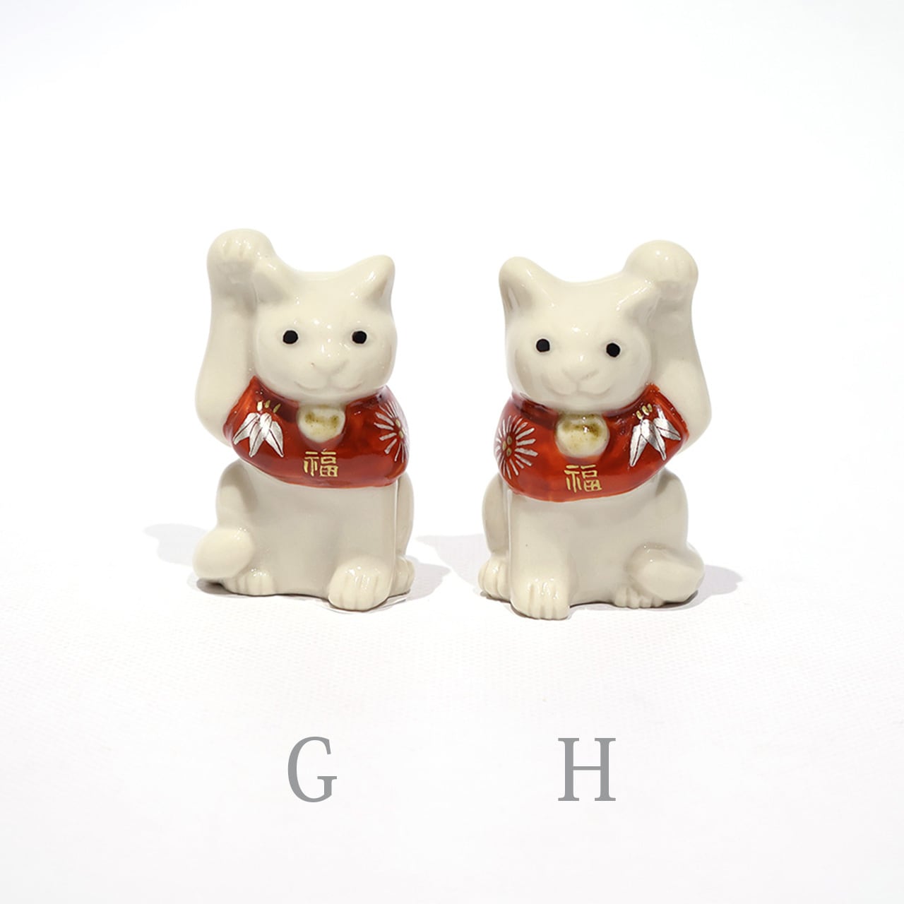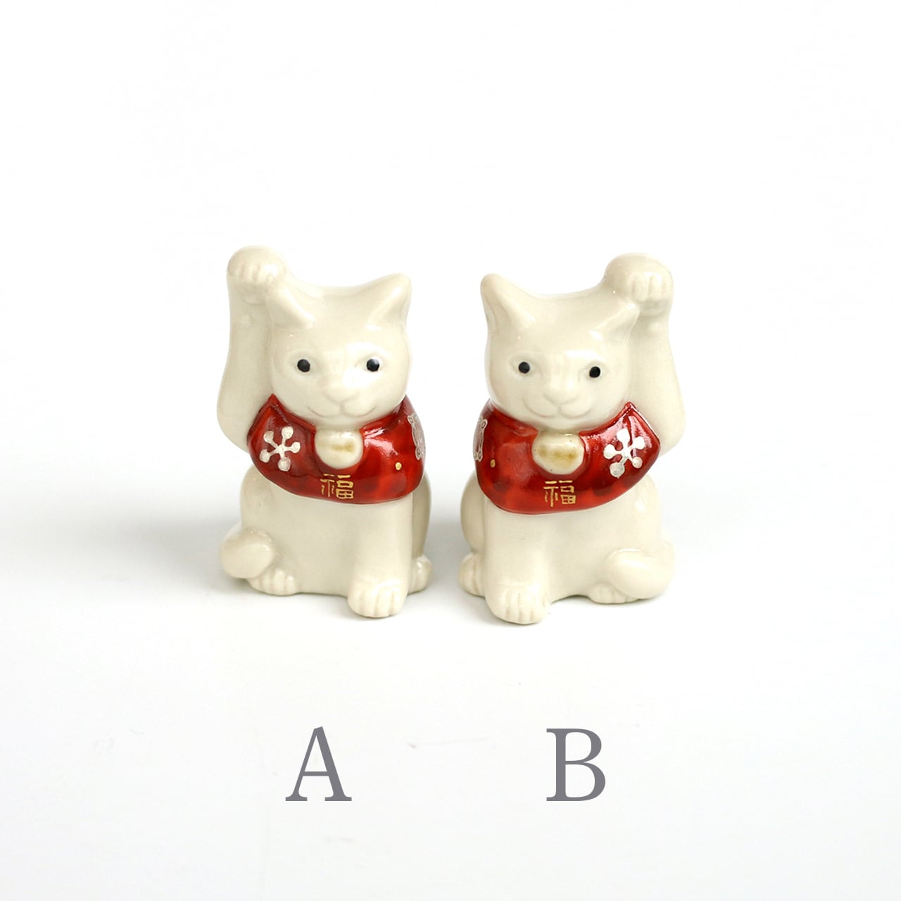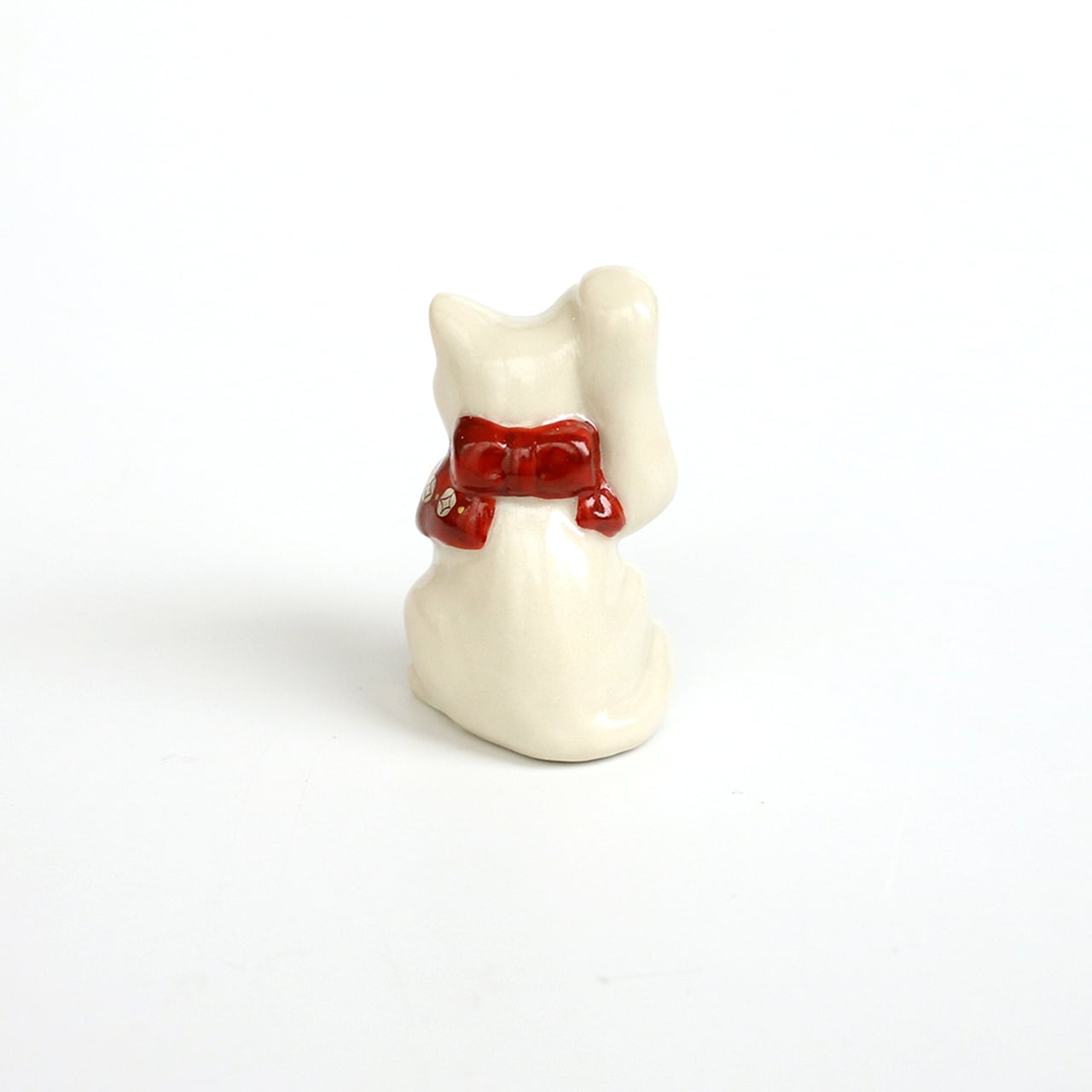 片手をちょこんと上げ、松竹梅などの描かれた赤い前掛けが首の後ろでリボン結びされている、可愛いサイズの福を招く猫です。昔から、右手は金運を招く、左手は人脈を招く、と言われているそうです。