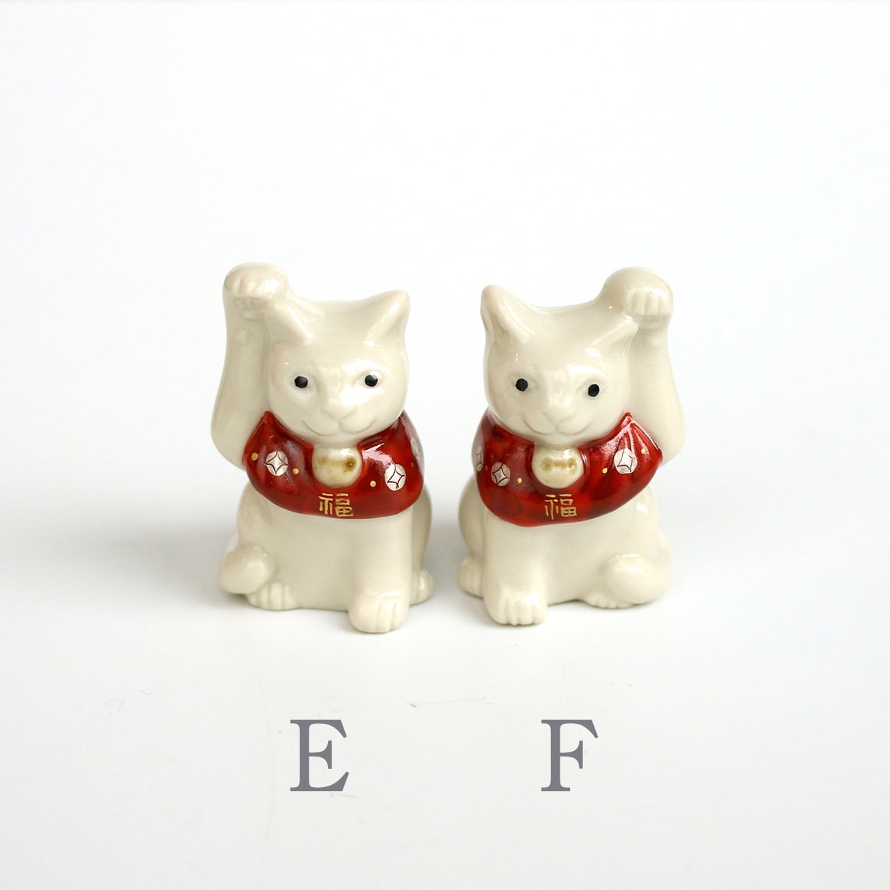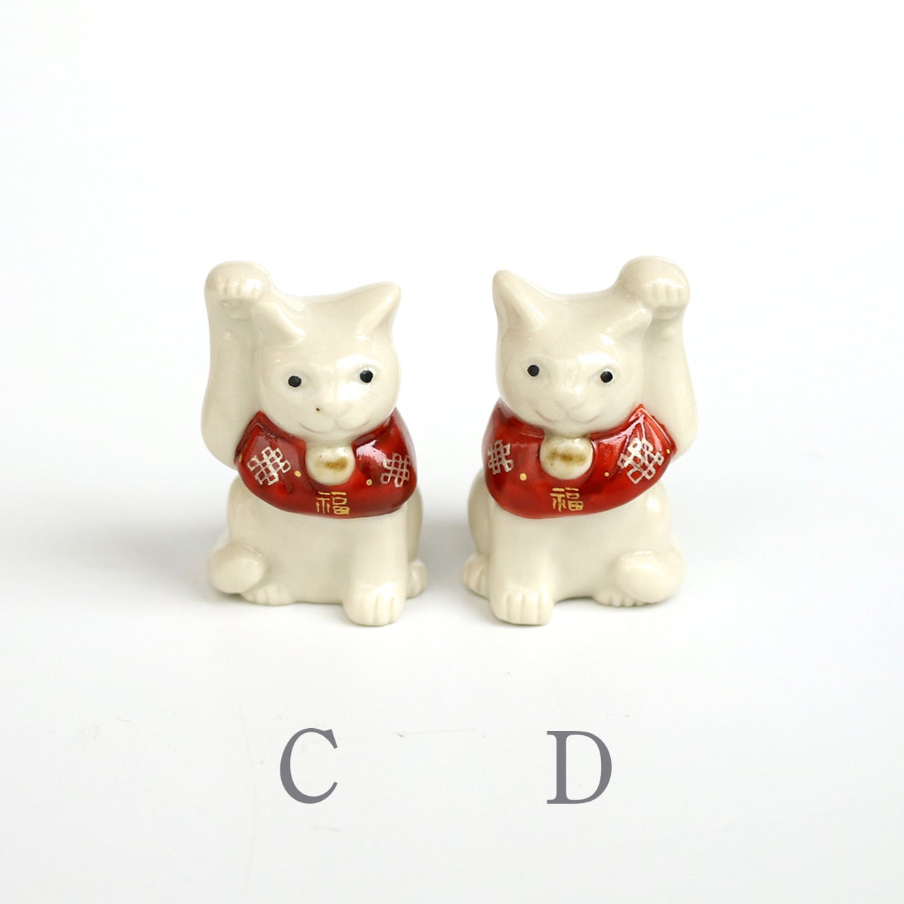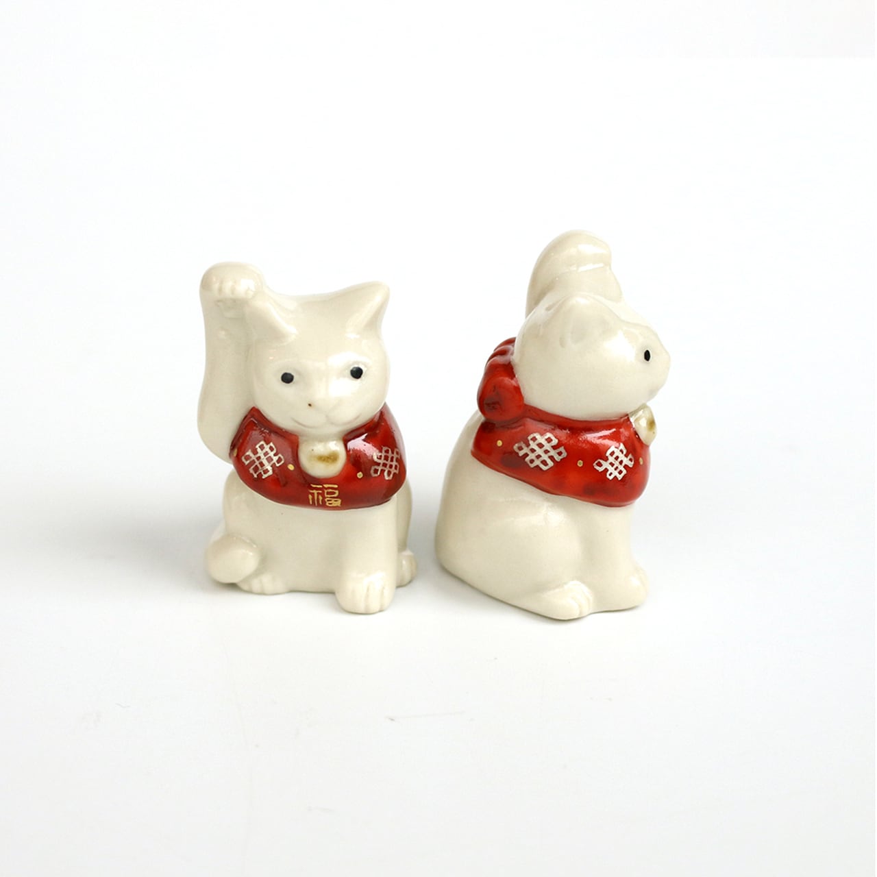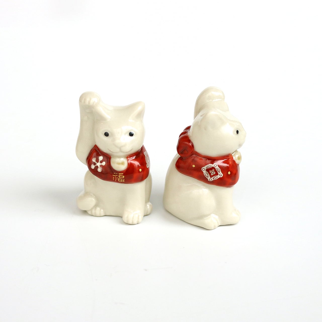 片手をちょこんと上げ、松竹梅などの描かれた赤い前掛けが首の後ろでリボン結びされている、可愛いサイズの福を招く猫です。昔から、右手は金運を招く、左手は人脈を招く、と言われているそうです。