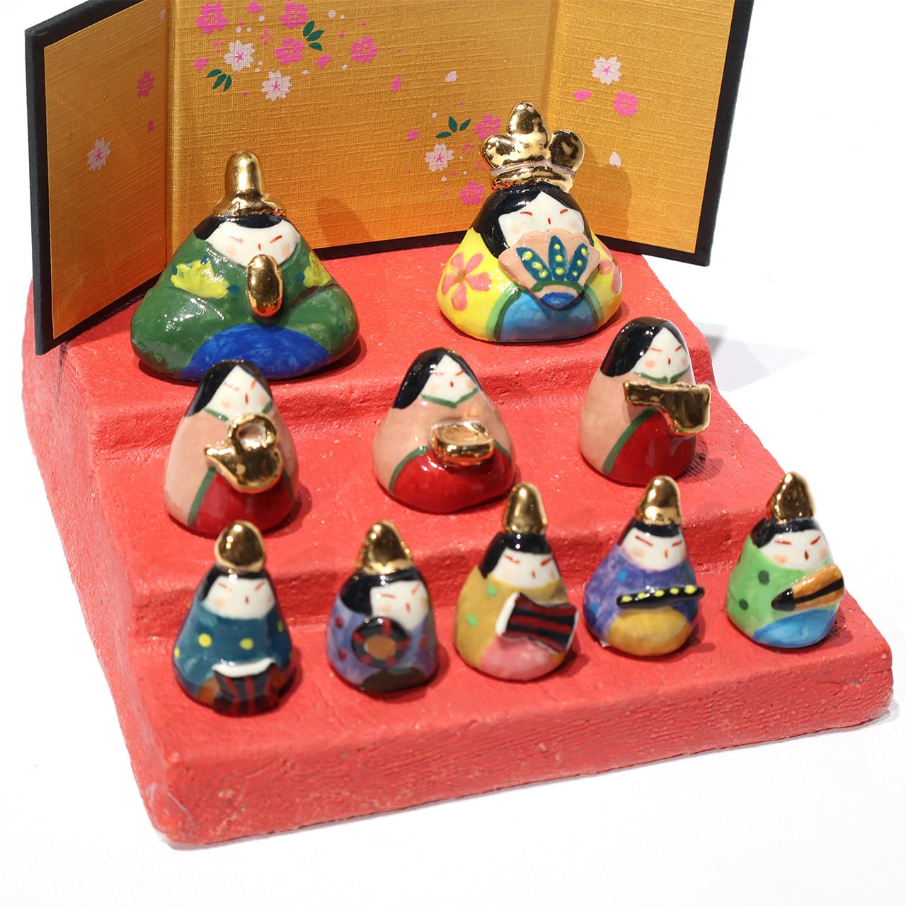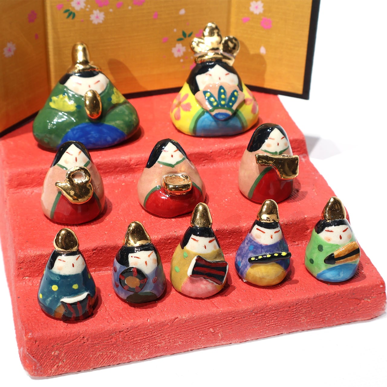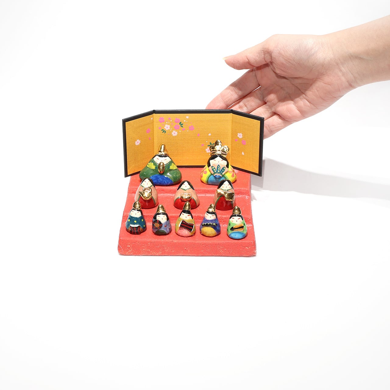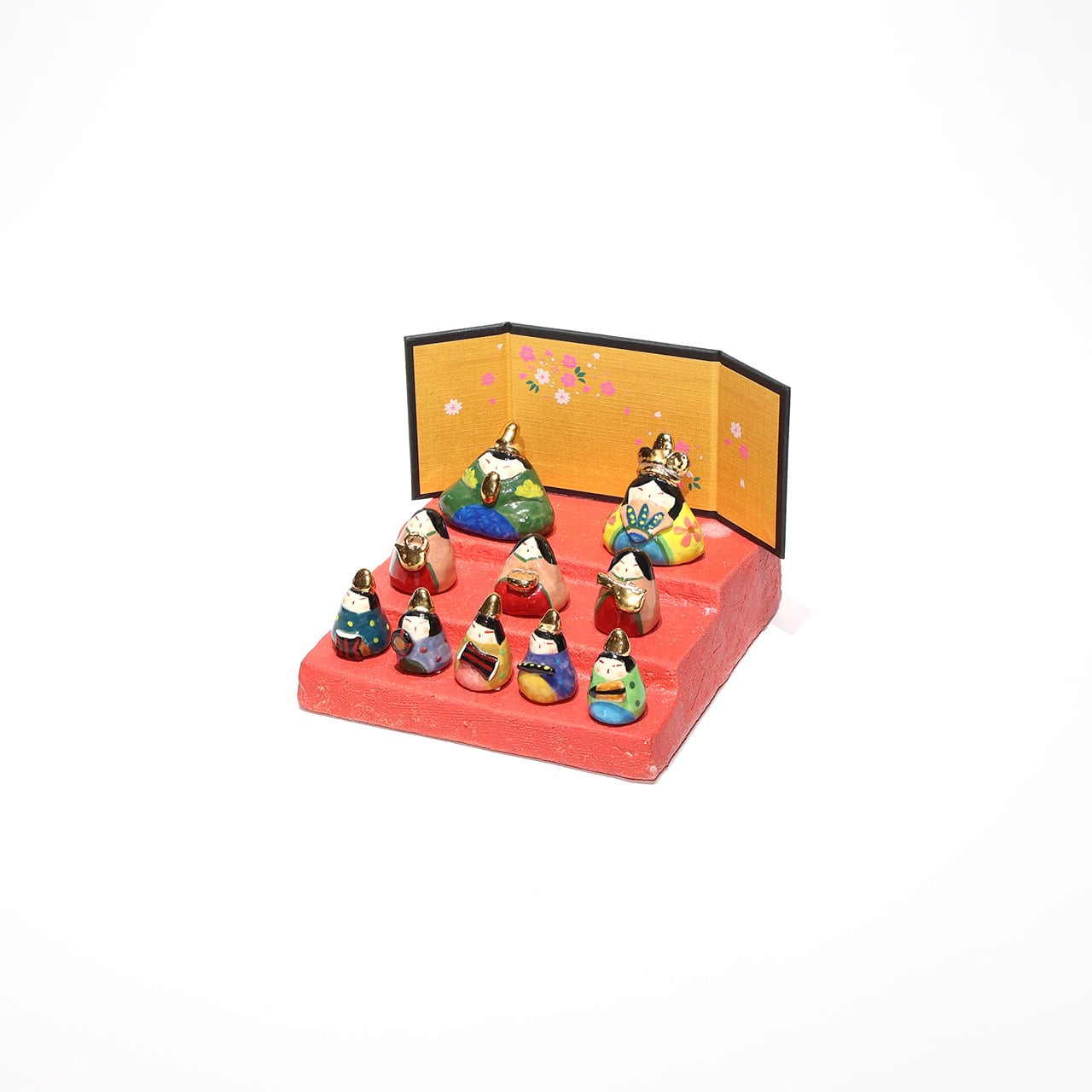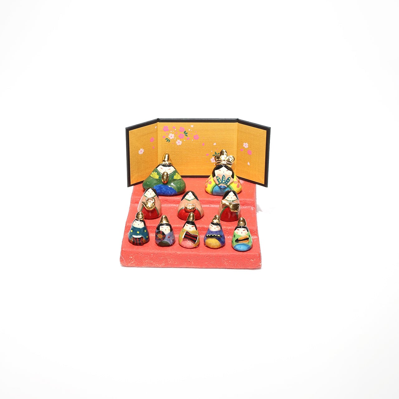 九谷焼らしい華やかな色合いの衣装をまとった雛人形。