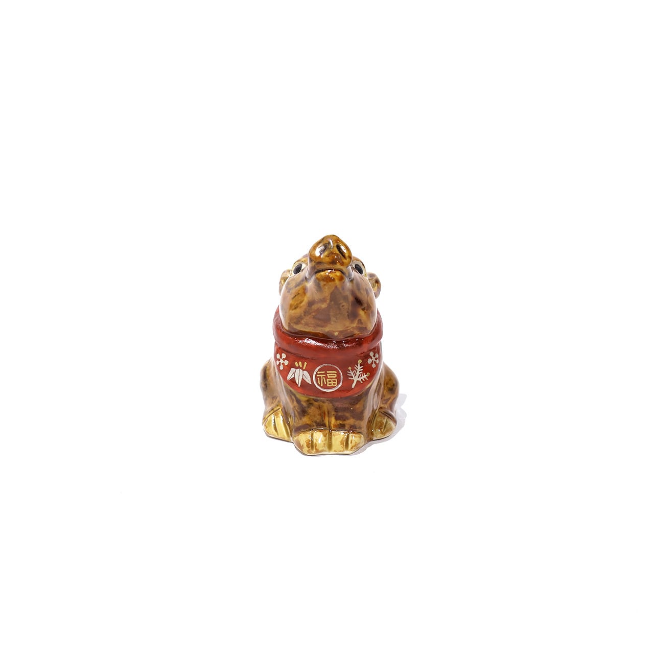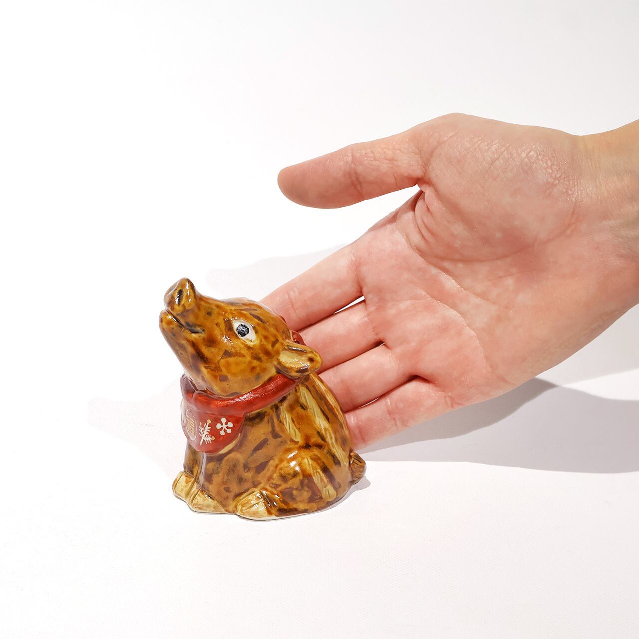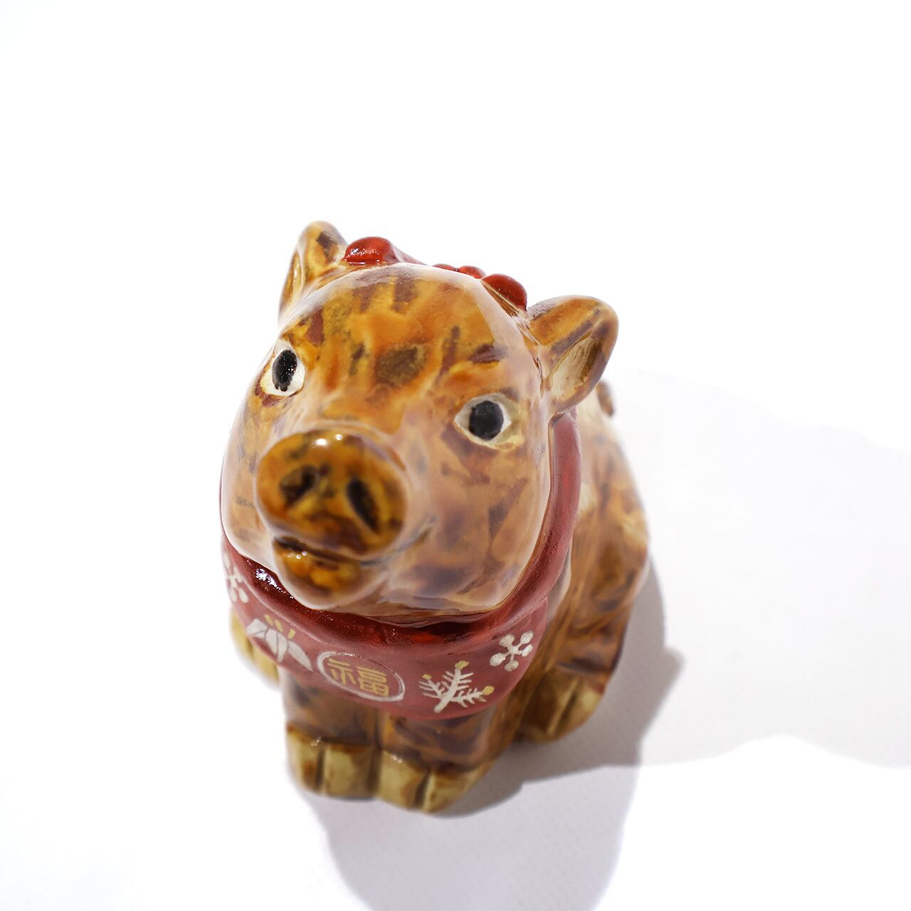 おめでたい柄を身にまとい、鼻をツーンと上に向けた愛らしい瓜坊です。