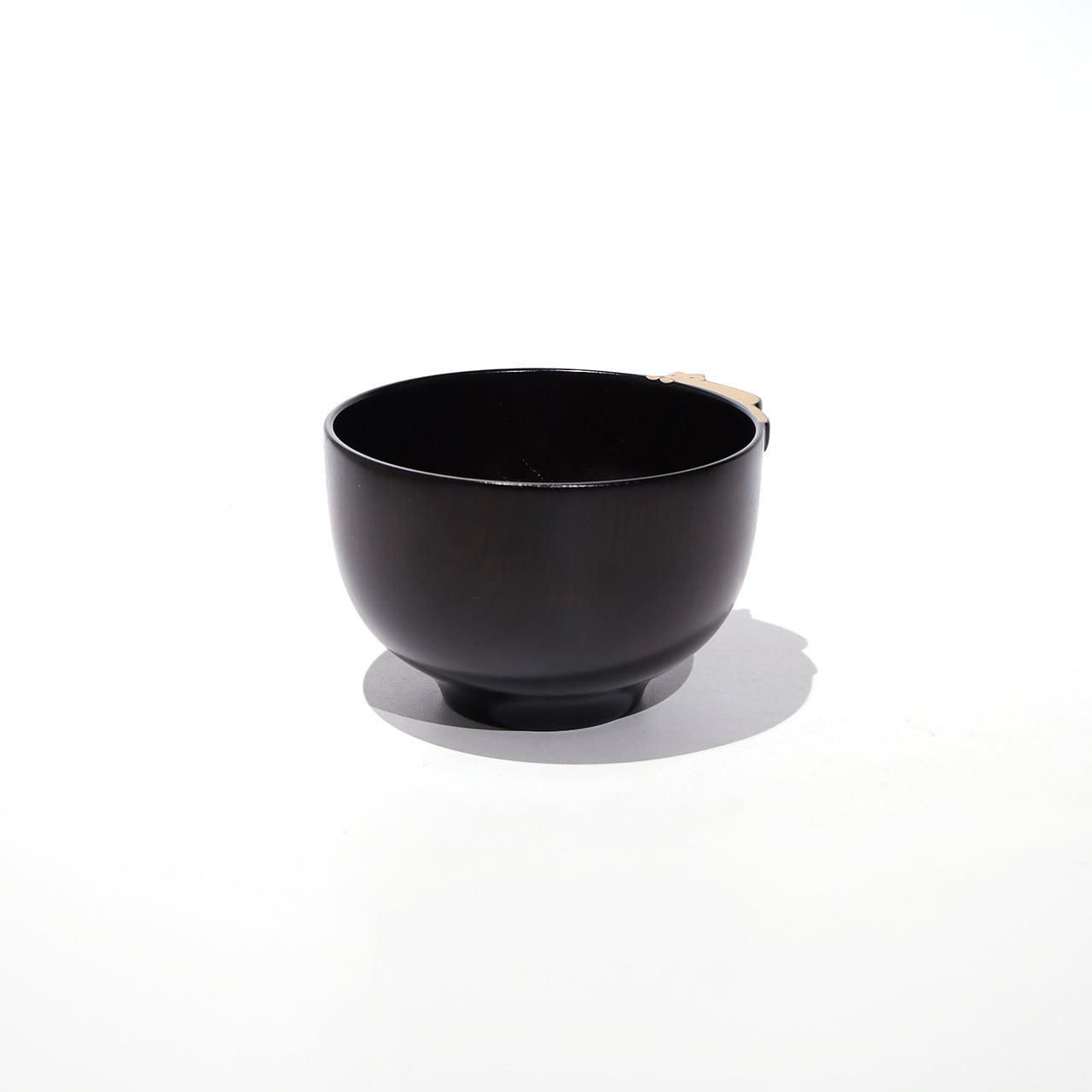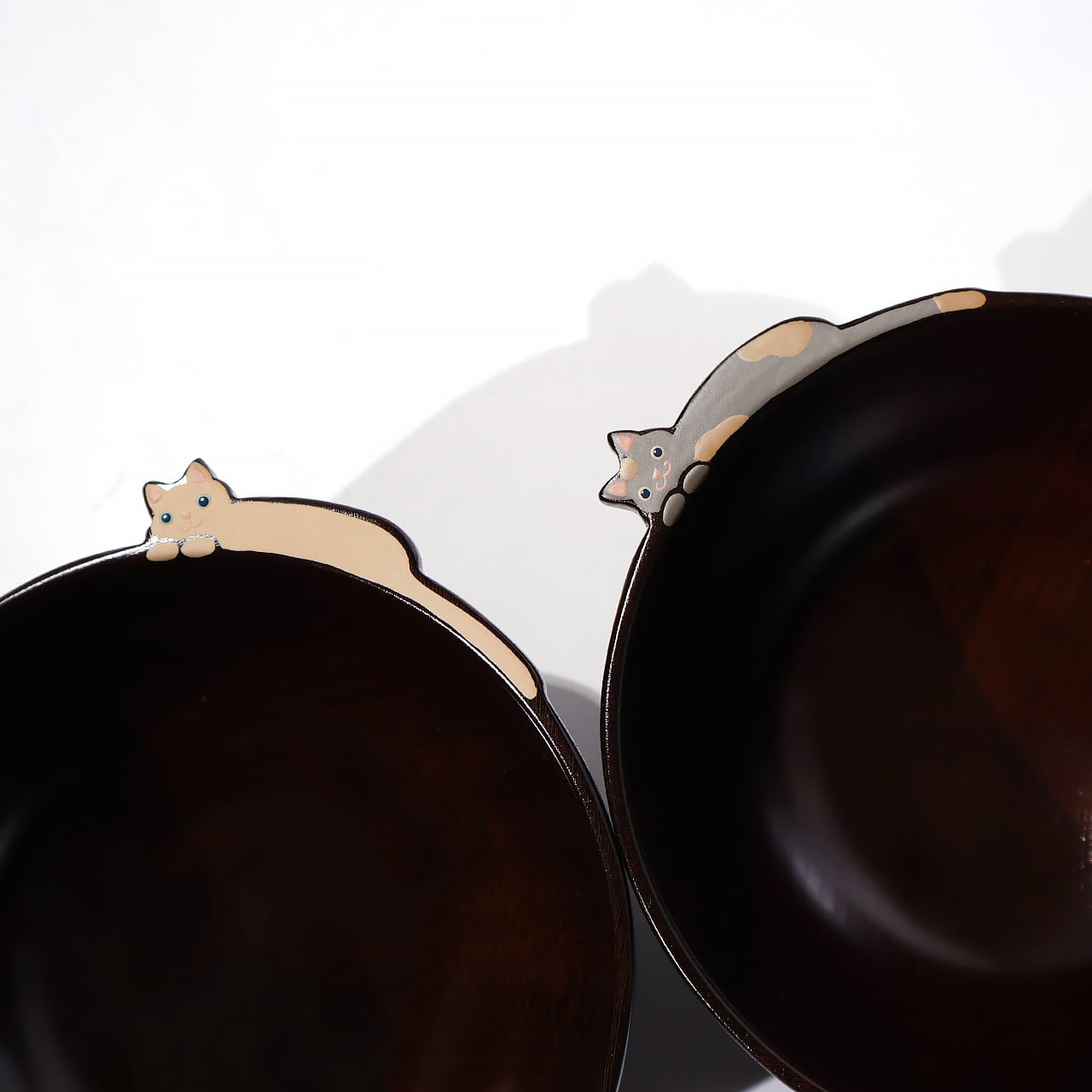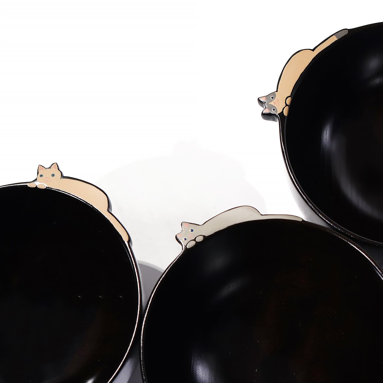お椀の縁に寝そべった猫がなんとも可愛らしいお椀です。大人の汁碗、幼児には麺類用としてお使いいただけるサイズ感です。