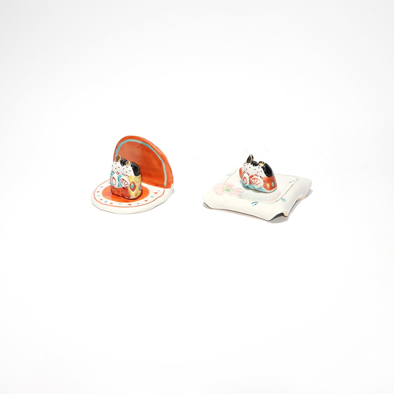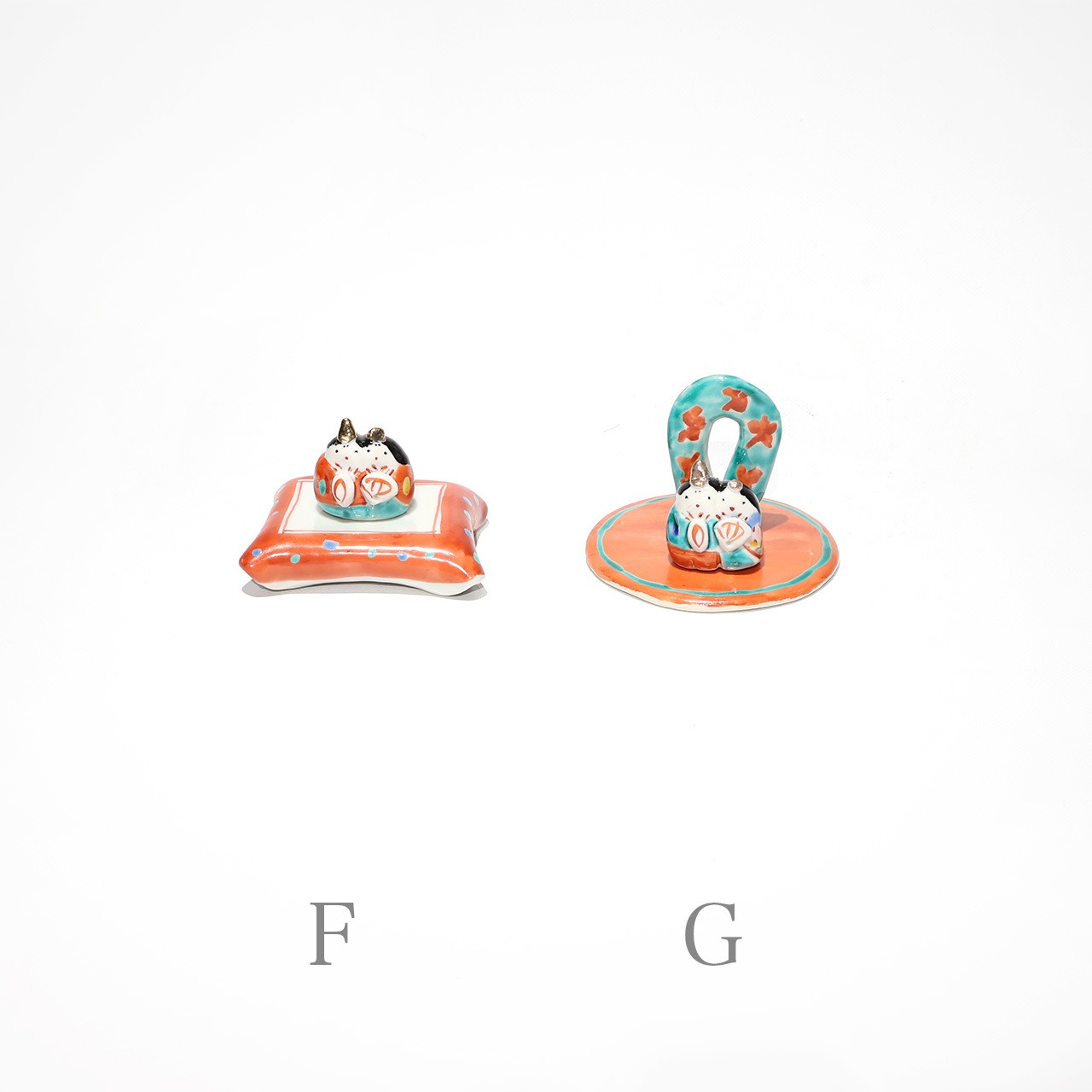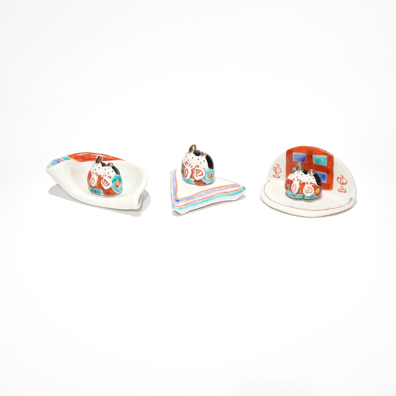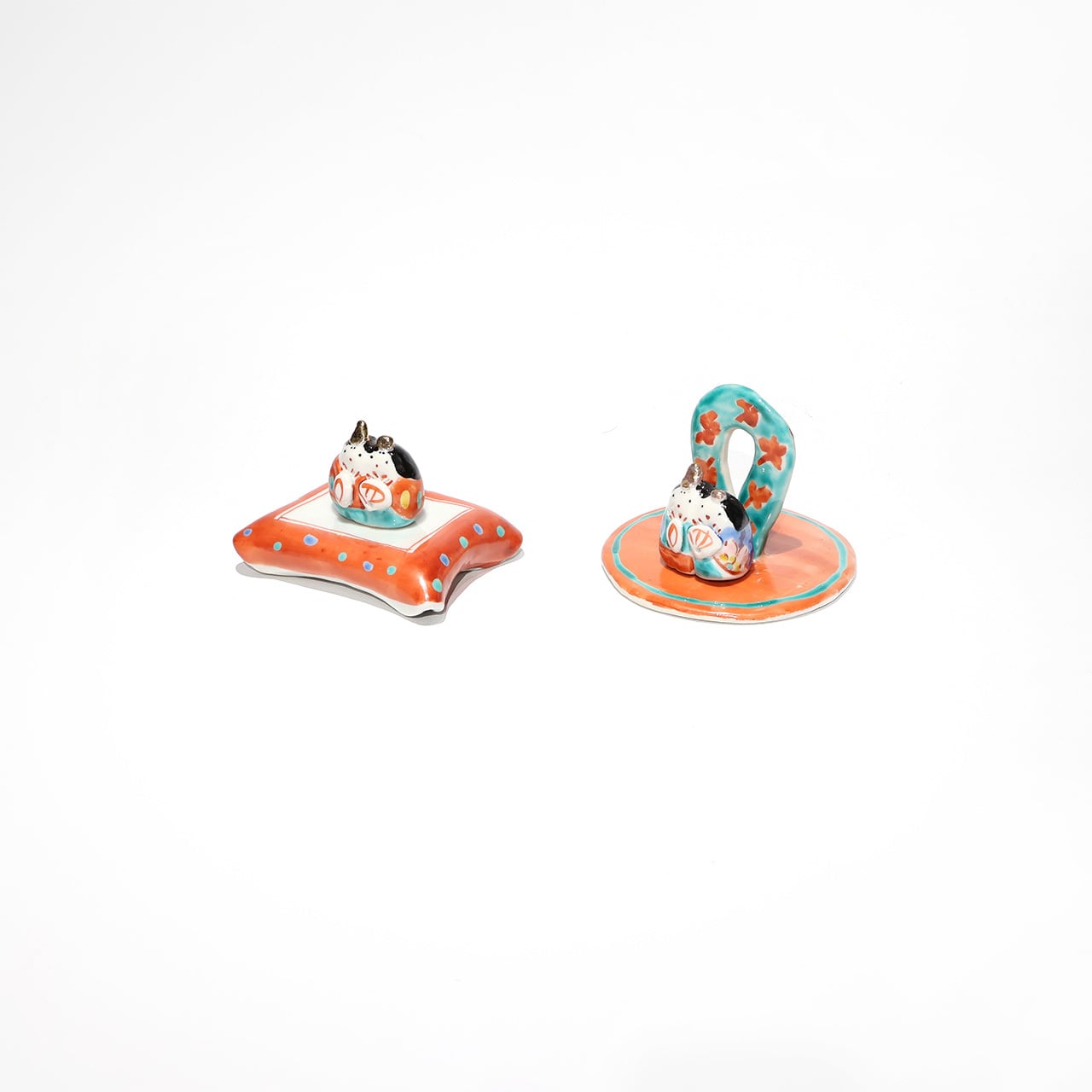 小さな手のひらサイズのお雛様。なんともゆるい表情や華やかなお色味が可愛らしいです。