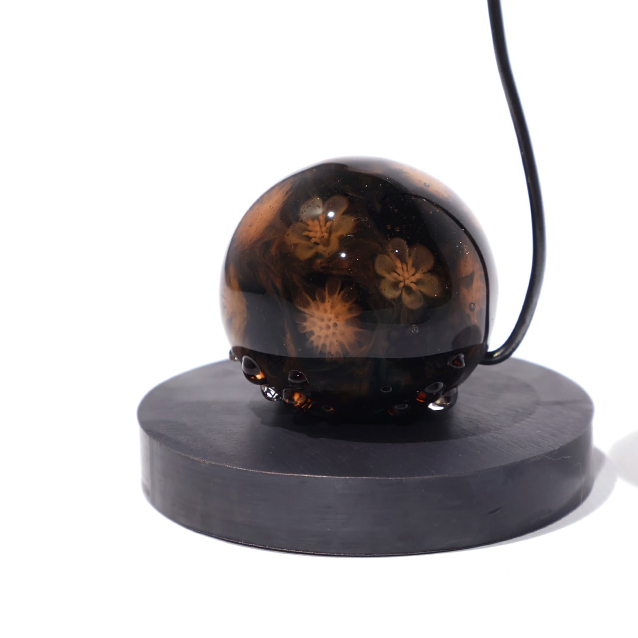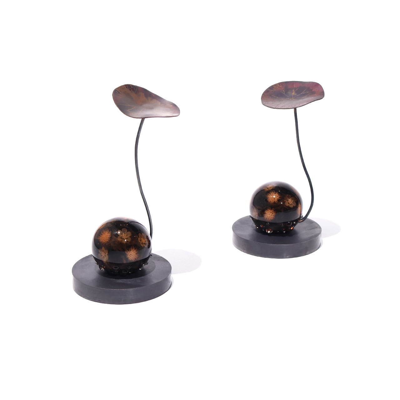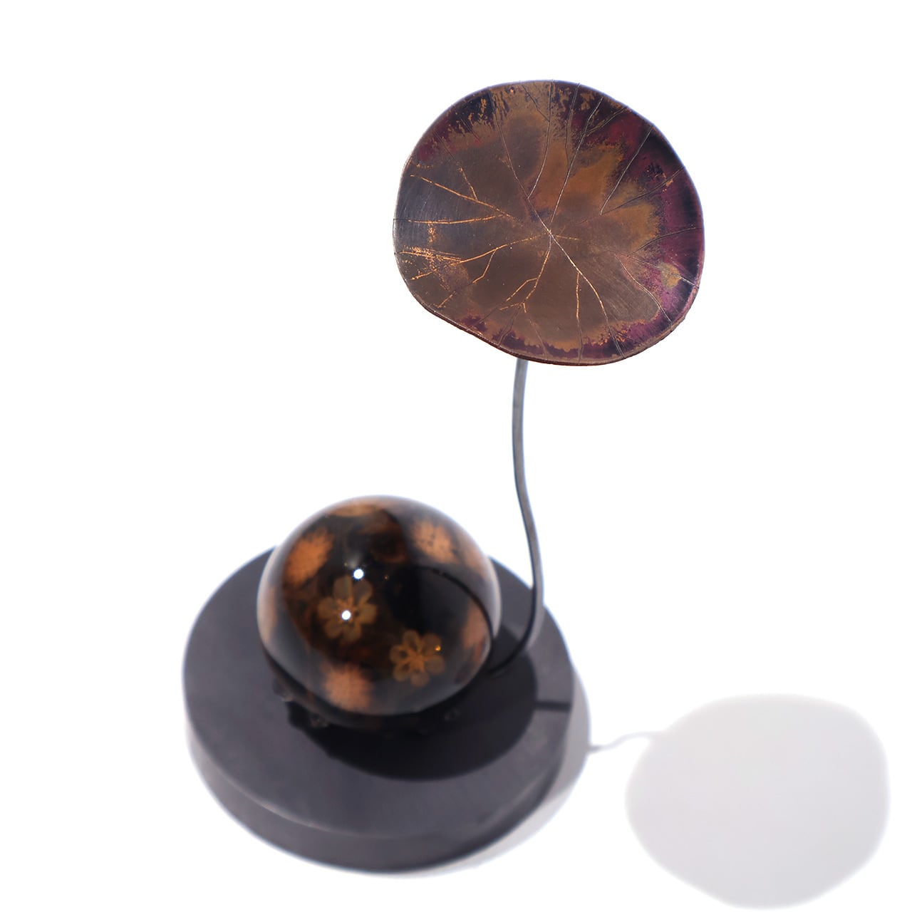 ウツボカズラ科に属するステファニアの特徴である大きな塊茎をガラス、うちわのような葉っぱをメタルで表現したユニークな作品です。