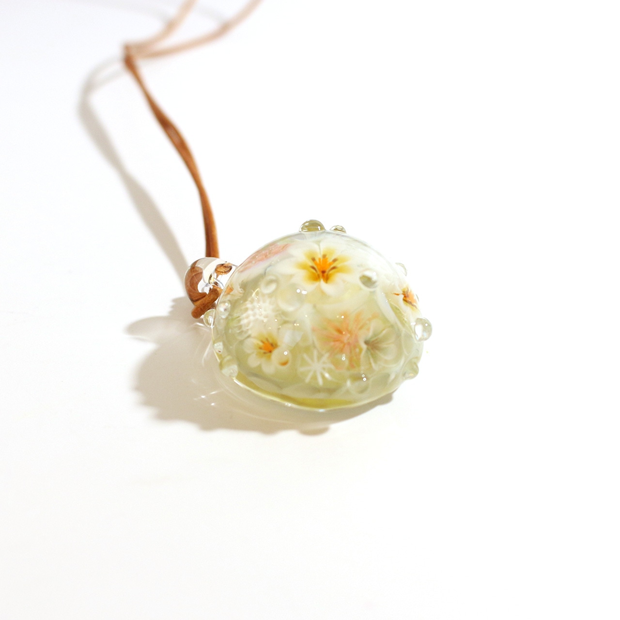 たくさんの小花が散りばめられたやさしい雰囲気のペンダントトップです。ベージュやセージグリーンの色合いが四季折々の装いによく似合います。