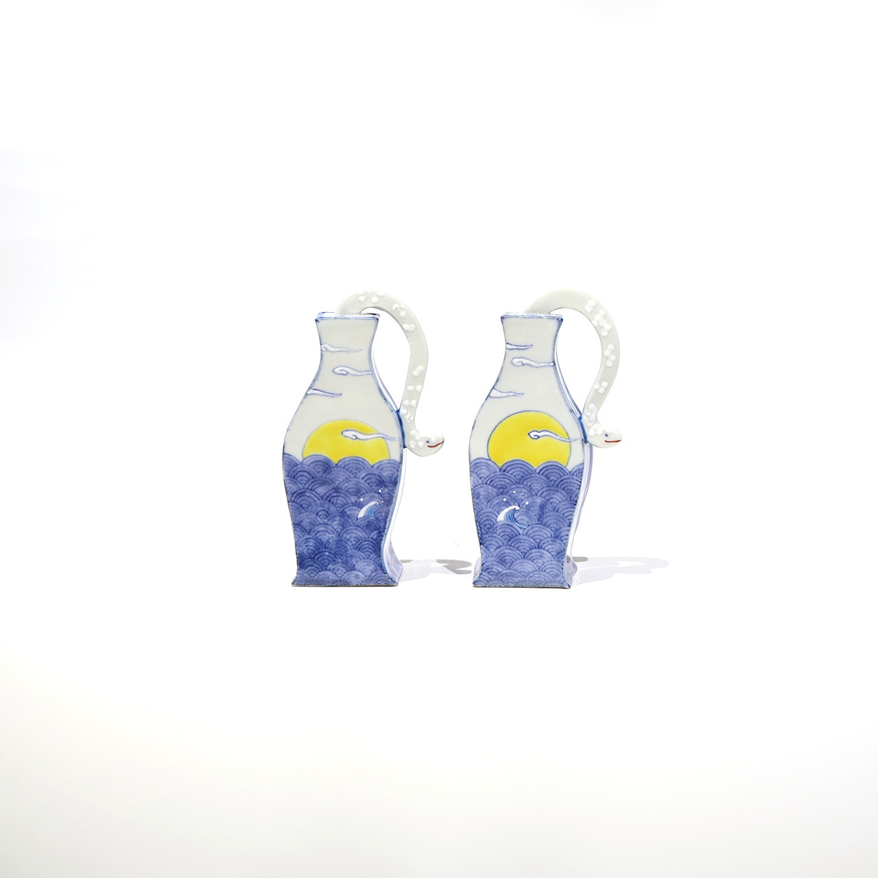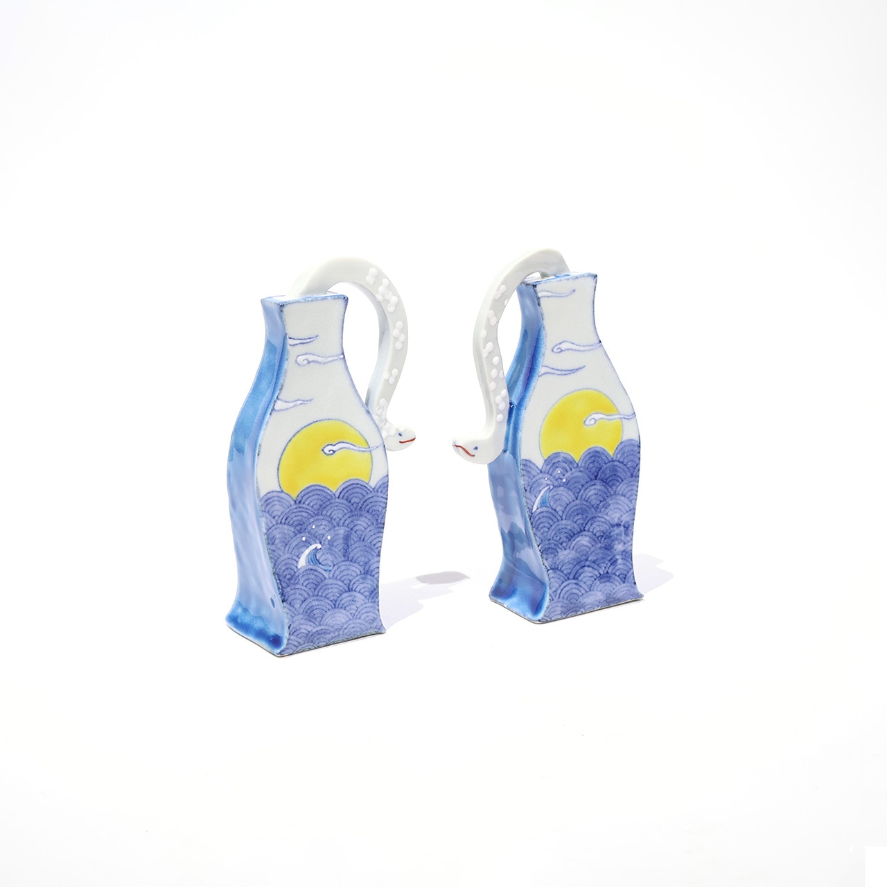 一見、壺の取っ手かと見まがうようなデザインで壺から白ヘビが出てきています。山崎さんならではの楽しい造形と絵付けです。きっと良き年を運んできてくれることでしょう。