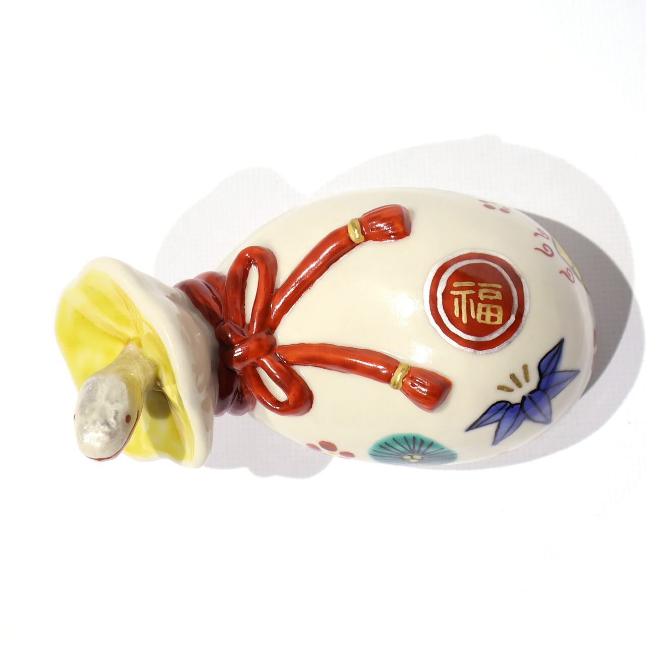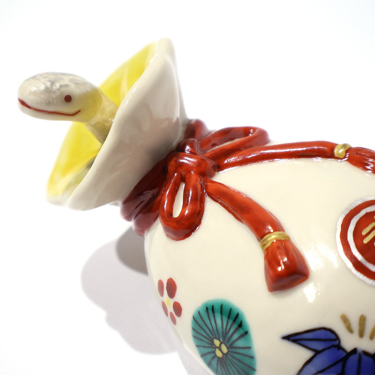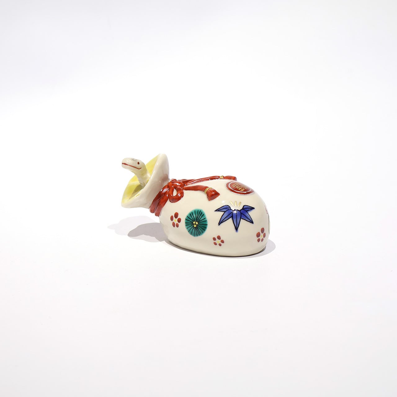 縁起の良い模様が描かれた宝袋から顔をのぞかせた2025年の干支の「巳」。