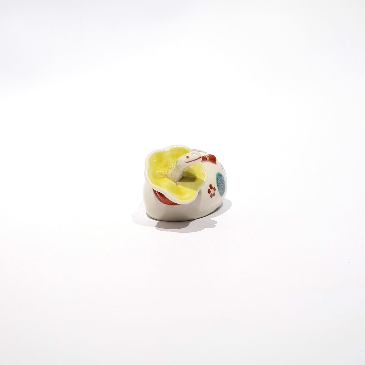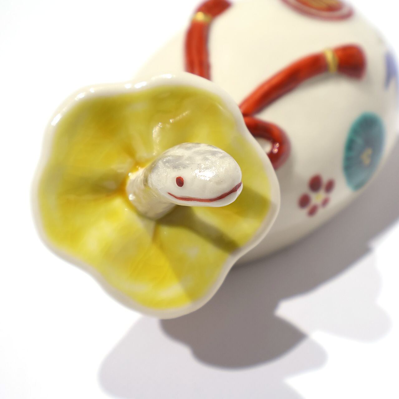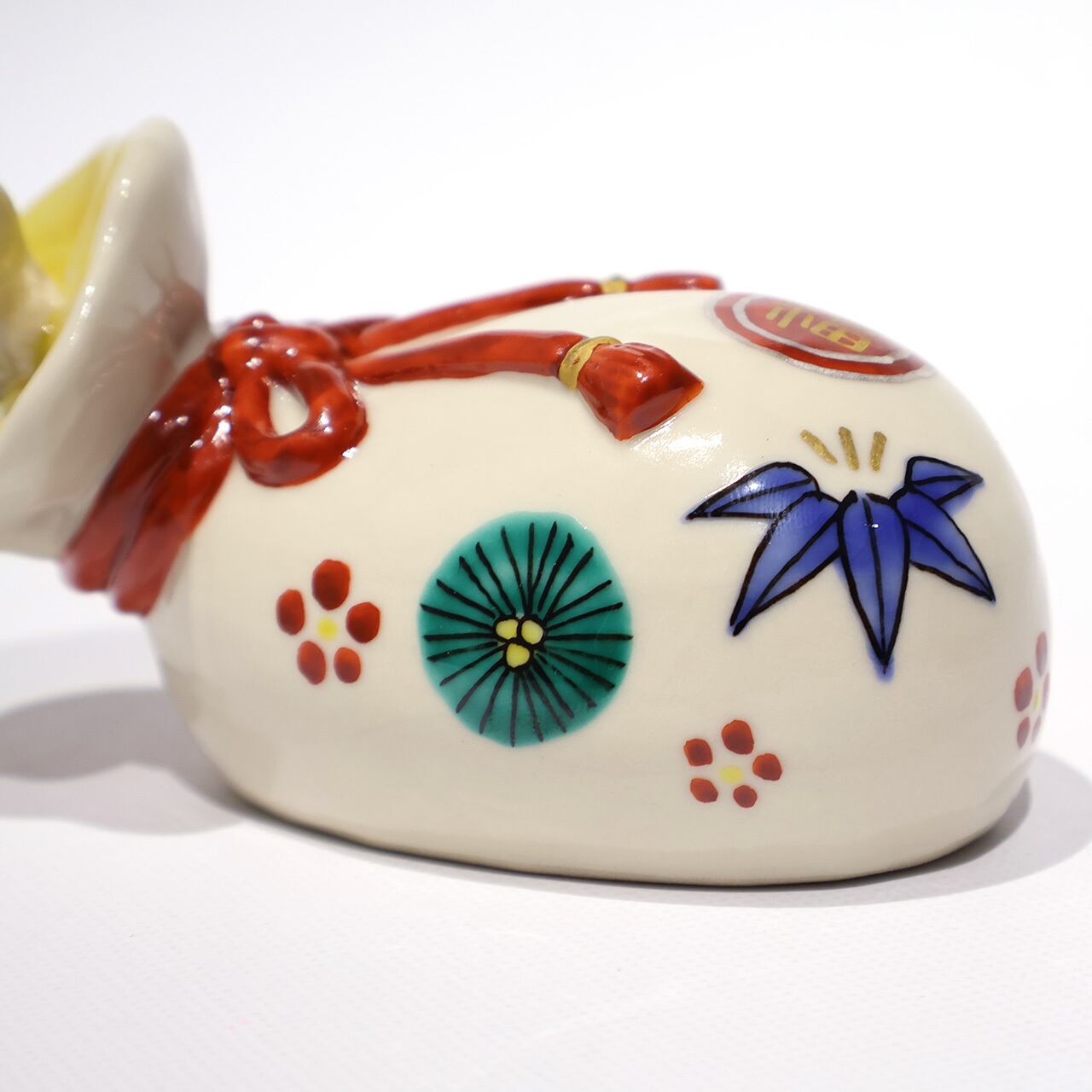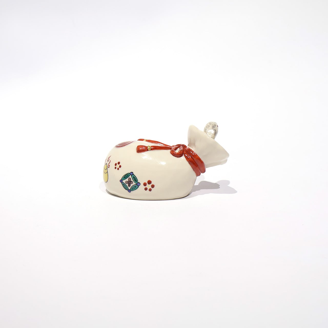 縁起の良い模様が描かれた宝袋から顔をのぞかせた2025年の干支の「巳」。