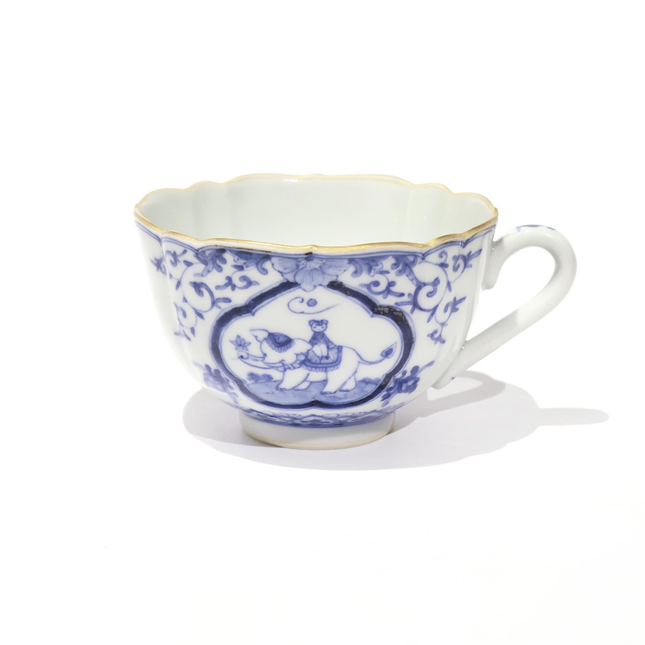象に乗った可愛い唐子を周りに丁寧に描いた唐草文などの絵付けが引き立てています。カップのみならずソーサーにも丁寧に絵付けがされています。